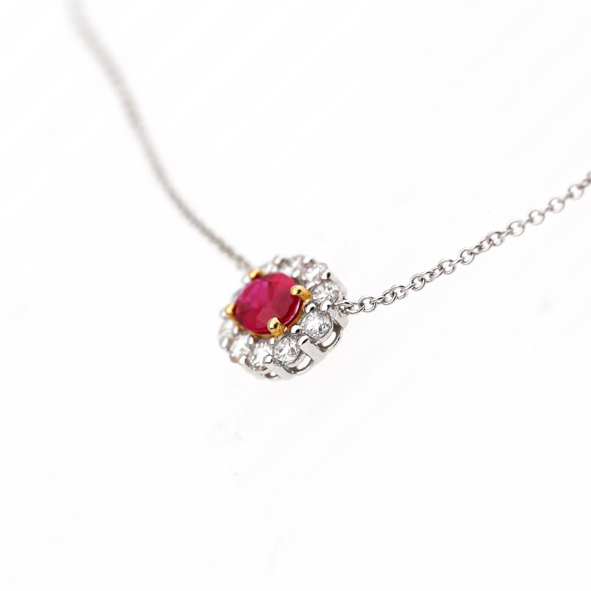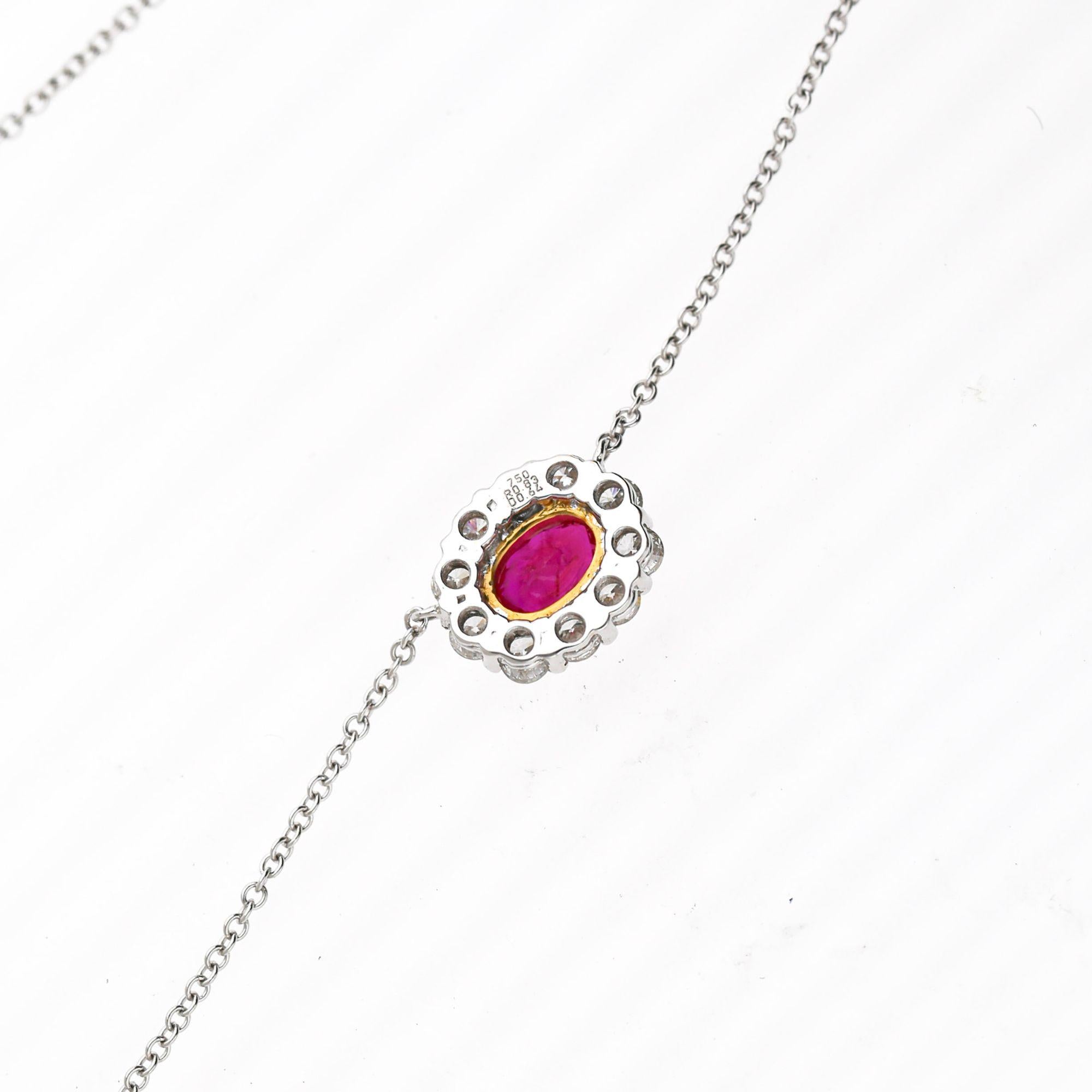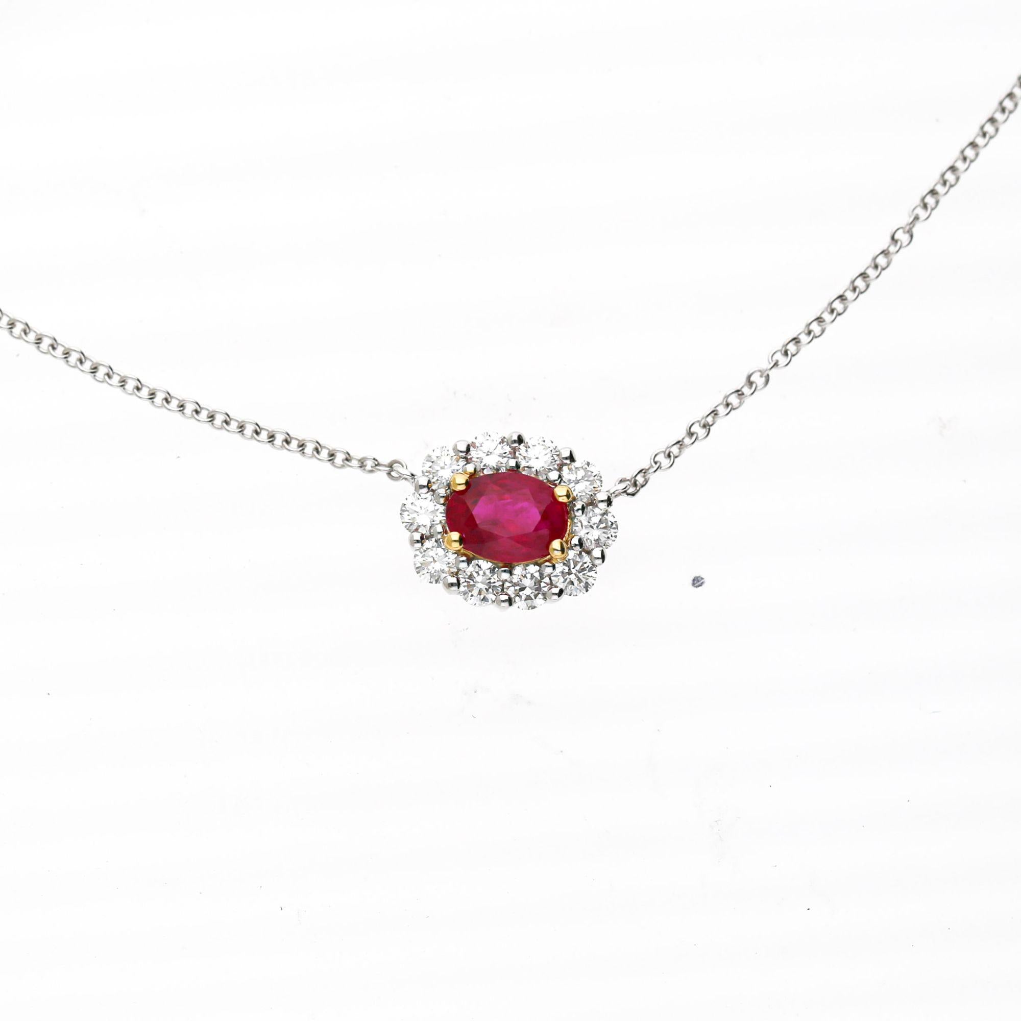 GIA certified 0.83 carat oval natural Burma ruby set in an 18K white and yellow gold single halo pendant necklace with 10 round brilliant diamonds totaling 0.64 carats. Yellow gold four-prong basket holds the ruby center within a white gold diamond halo, suspended on a fine 18K white gold cable chain.