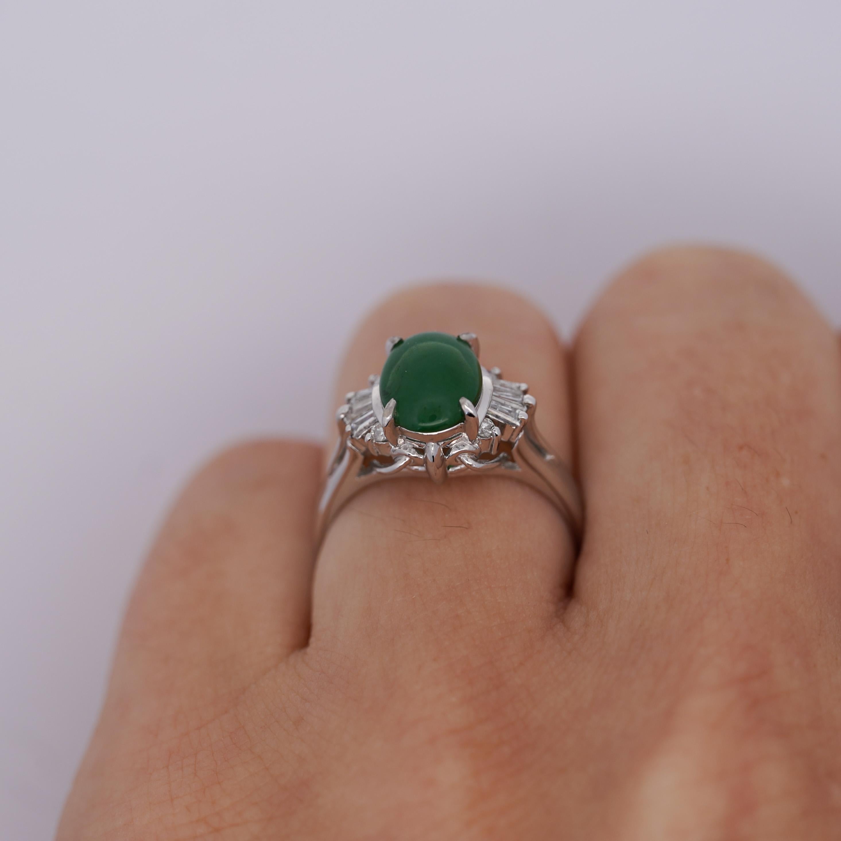 HK Jade & Stone Lab certified 1.85 carat oval cut natural untreated green jade set in platinum 900 split band ring with tapered and round diamond accents. The Grade A Type A Fei Cui jade features sleek split band design with prong set diamonds.