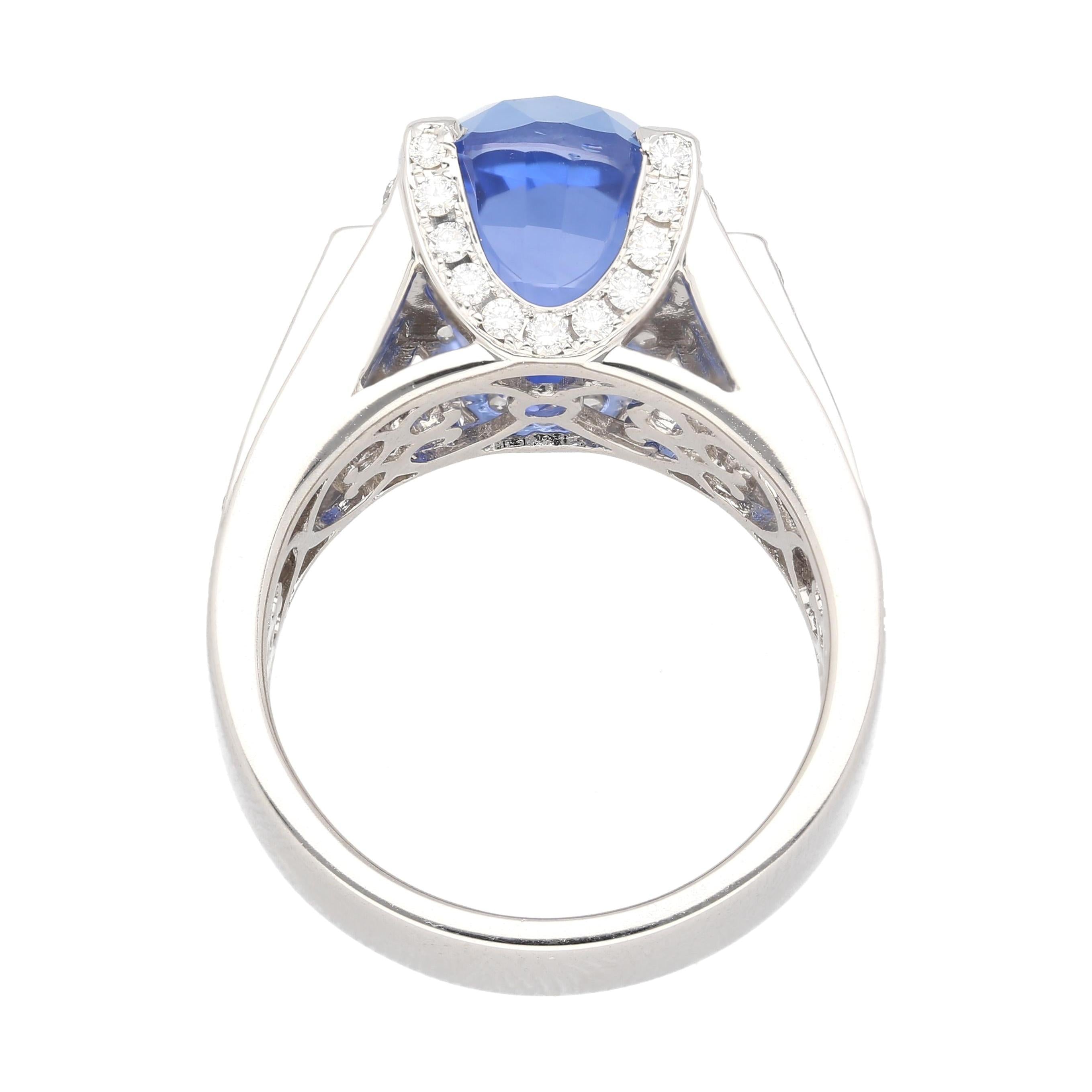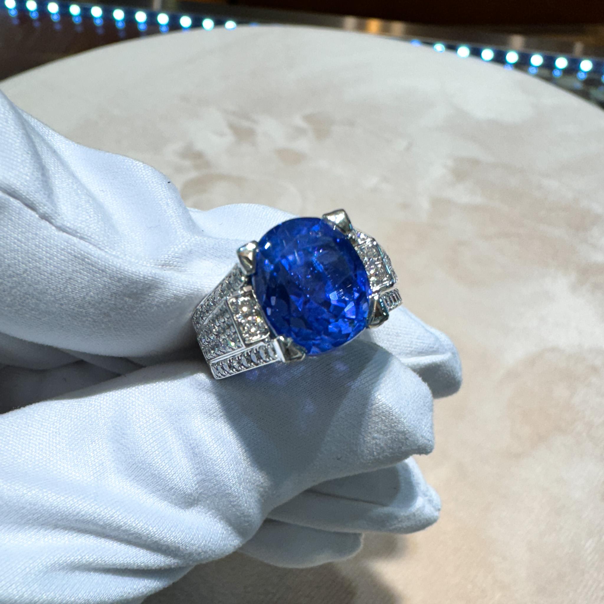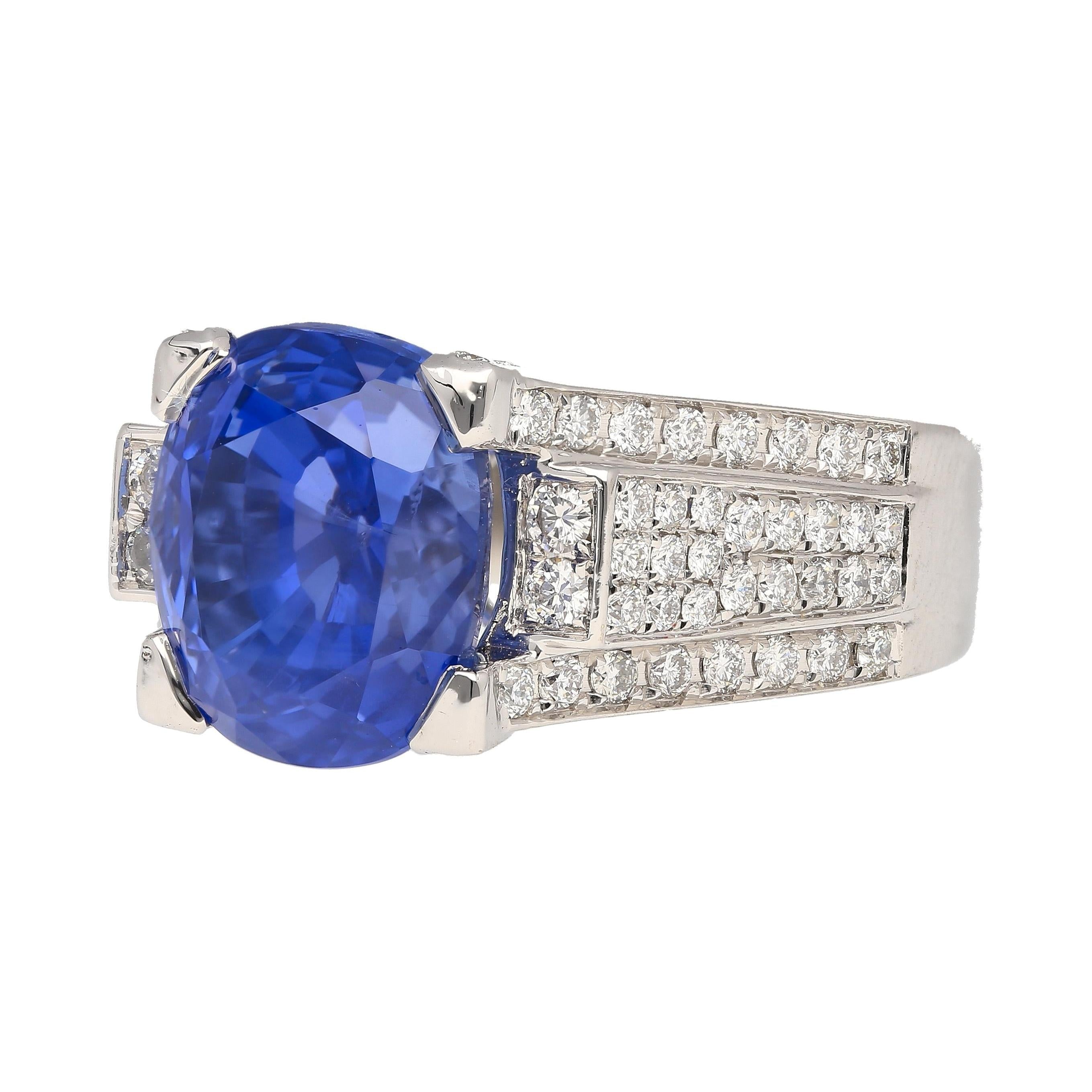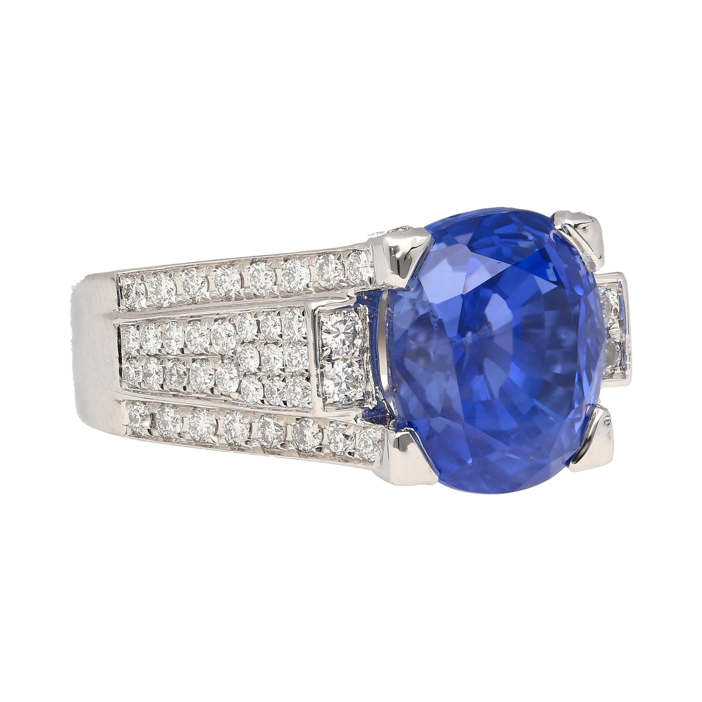 GRS Certified 10.36 carat oval-cut, no-heat violetish-blue sapphire of Sri Lankan origin, set in an 18K white gold statement ring with pavé-set diamonds. The sapphire shows a near royal blue color with a violetish undertone, excellent saturation, even distribution, and clarity that is more than eye clean. Its brilliance and luster are striking, capturing the eye with ease. This is an unmistakably natural sapphire of noticeable value.