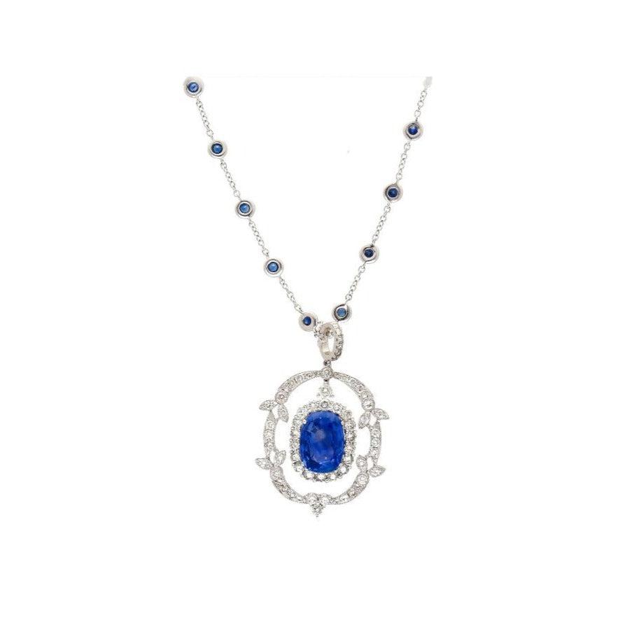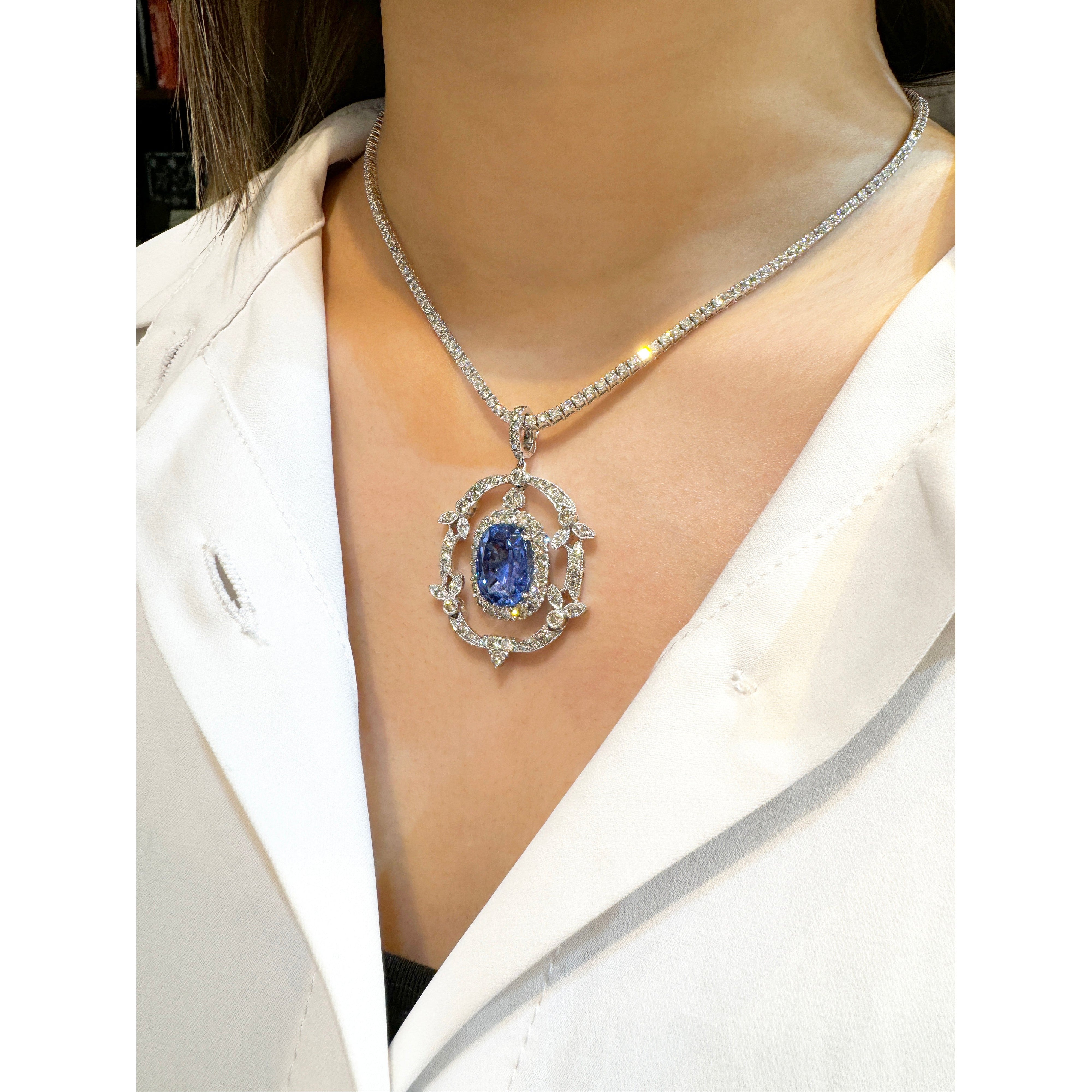 GRS certified 10.36 carat no-heat Sri Lanka blue sapphire pendant necklace in 18K white gold. Vintage Victorian style cushion cut blue sapphire with round diamond and sapphire accents.