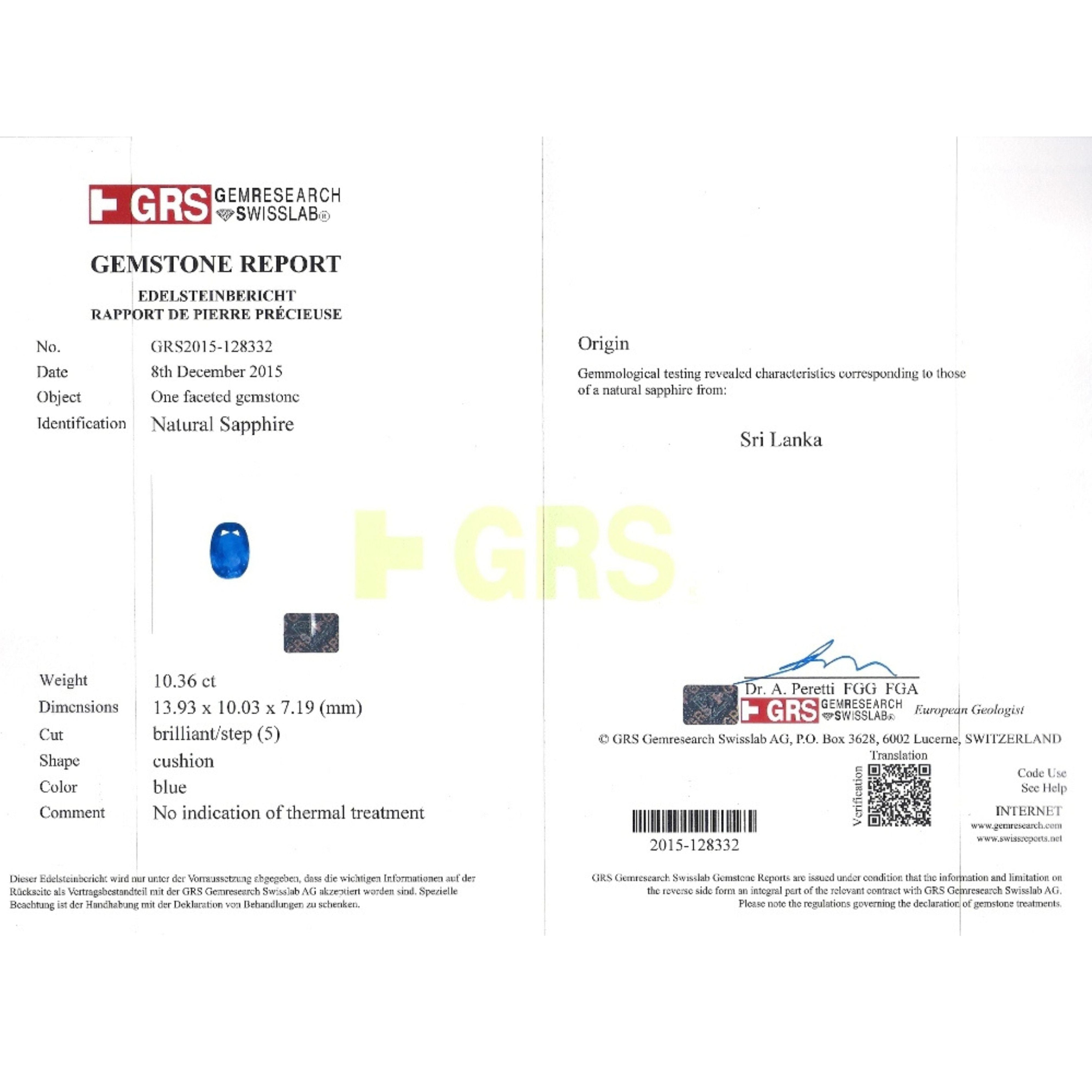 - Accompanied by GRS certificate no. GRS2015-128332 confirming natural sapphire, Sri Lanka origin, blue color, no treatment