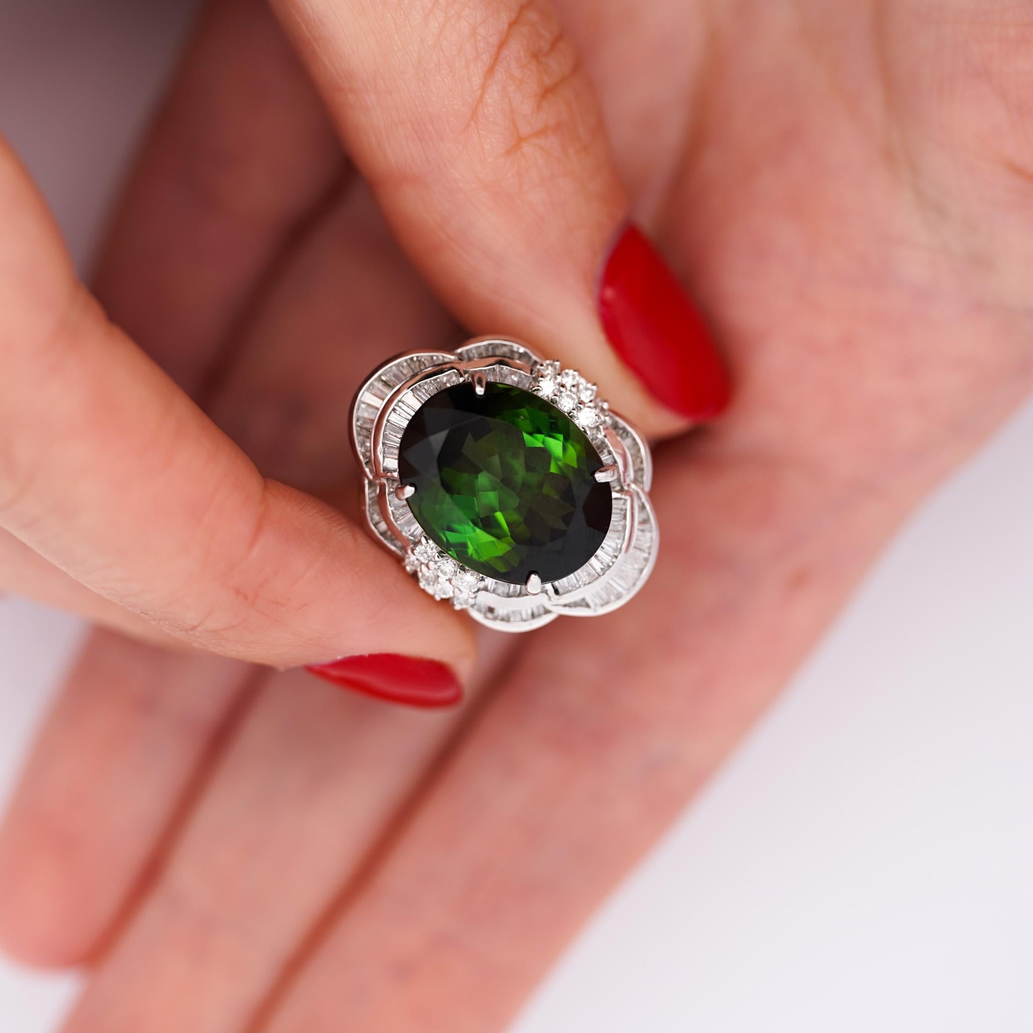 GIA Certified 10.47 Carat Green Oval Cut Tourmaline & Diamond in Platinum Cocktail Ring