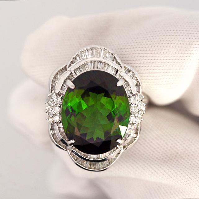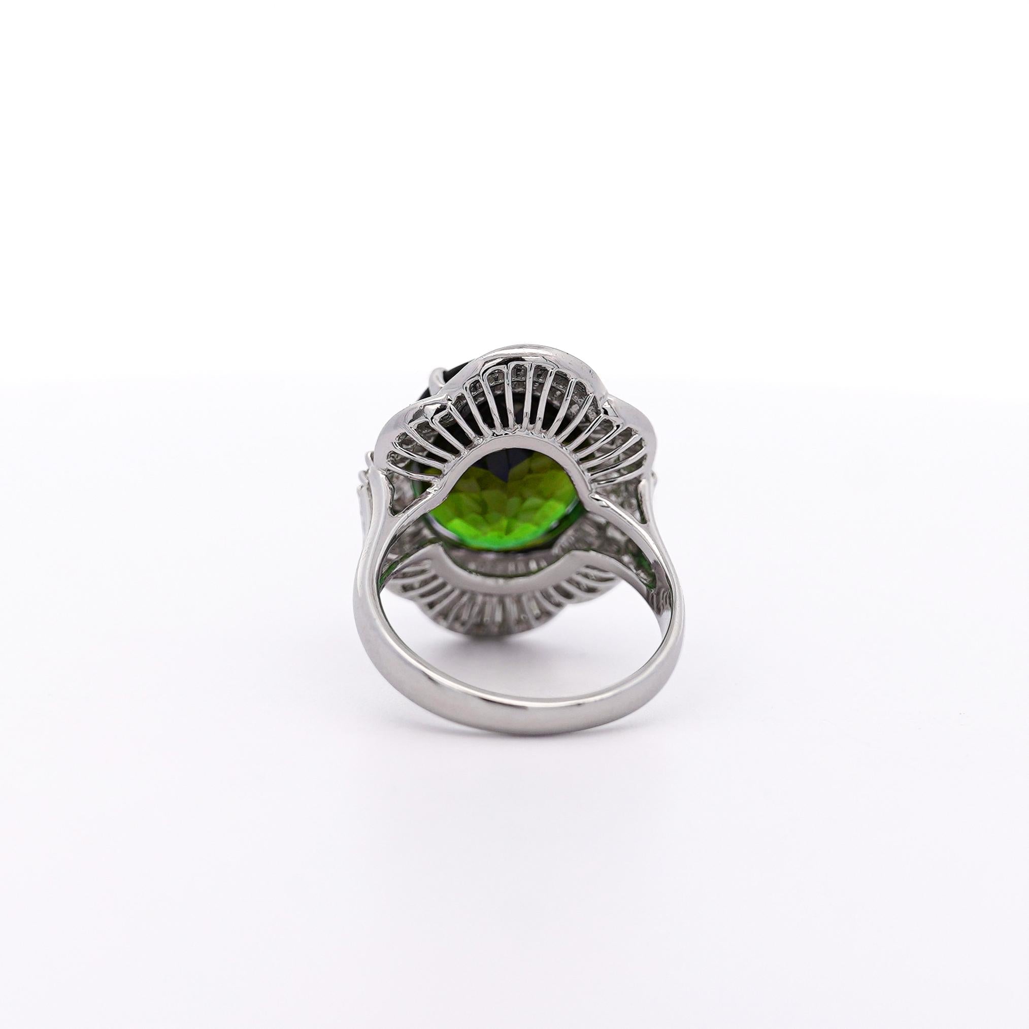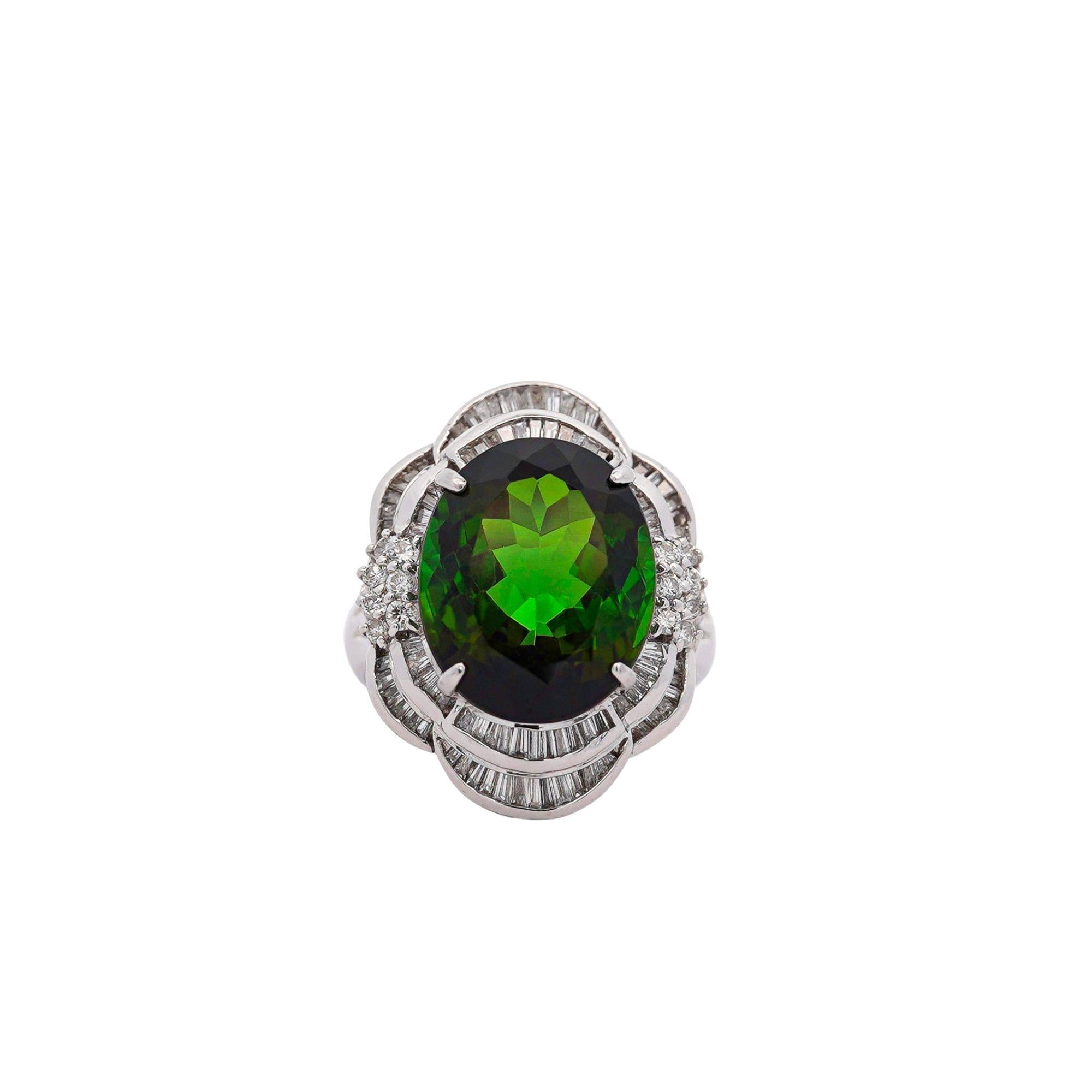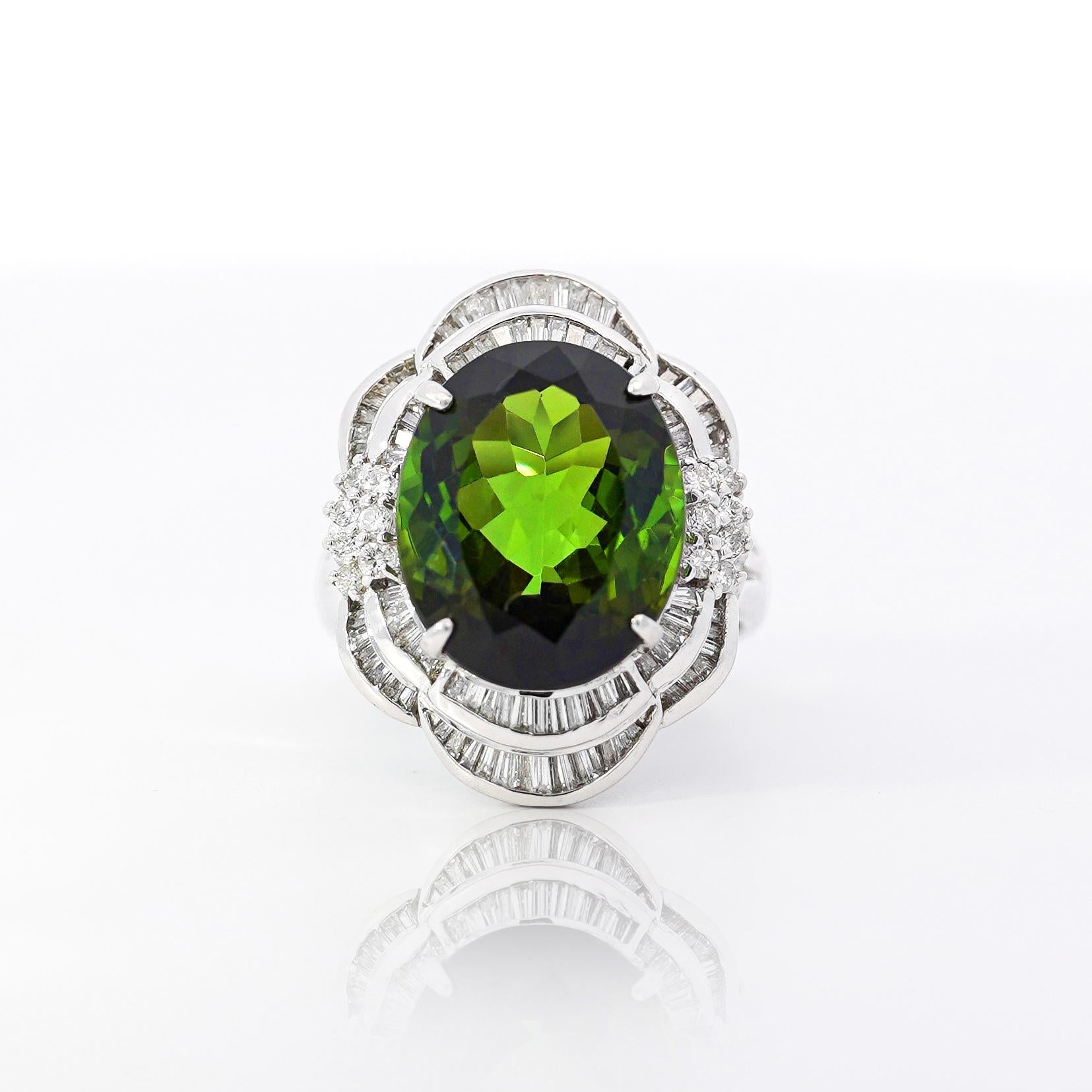 This exquisite platinum cocktail ring is the epitome of refined sophistication. At its heart lies a breathtaking 10.47-carat oval green tourmaline, radiating depth and vibrancy. Surrounding the center stone is an intricate halo of baguette and round-cut diamonds, artfully arranged to create a radiant floral effect that enhances the tourmaline’s beauty. Crafted in durable and elegant platinum (PT900), the design seamlessly blends timeless charm with modern artistry. Perfect for special occasions or as a treasured heirloom, this ring is a stunning statement of luxury and impeccable craftsmanship.