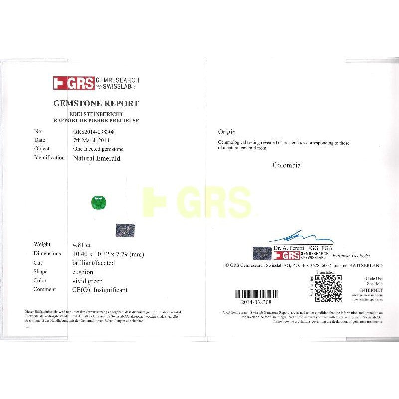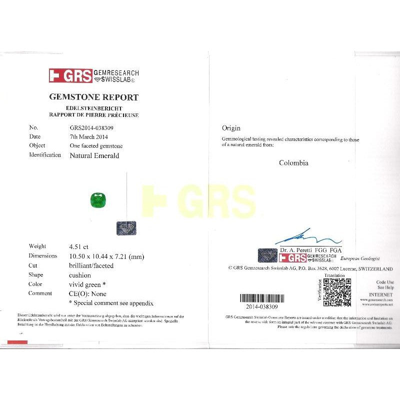 - Accompanied by GRS reports no. GRS2014-038308 and GRS2014-038309 stating the emeralds are natural, Colombian origin, cushion cut, vivid green color, with oil treatments as noted above