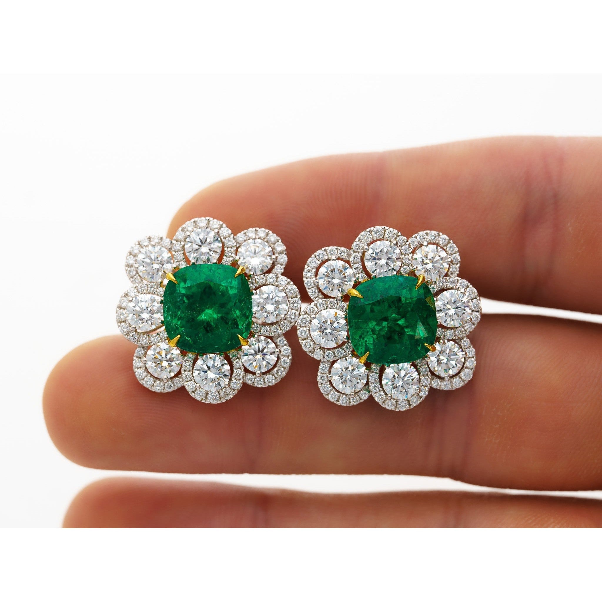Matching Pair Cushion Cut Colombian Emerald Round Diamond Earrings