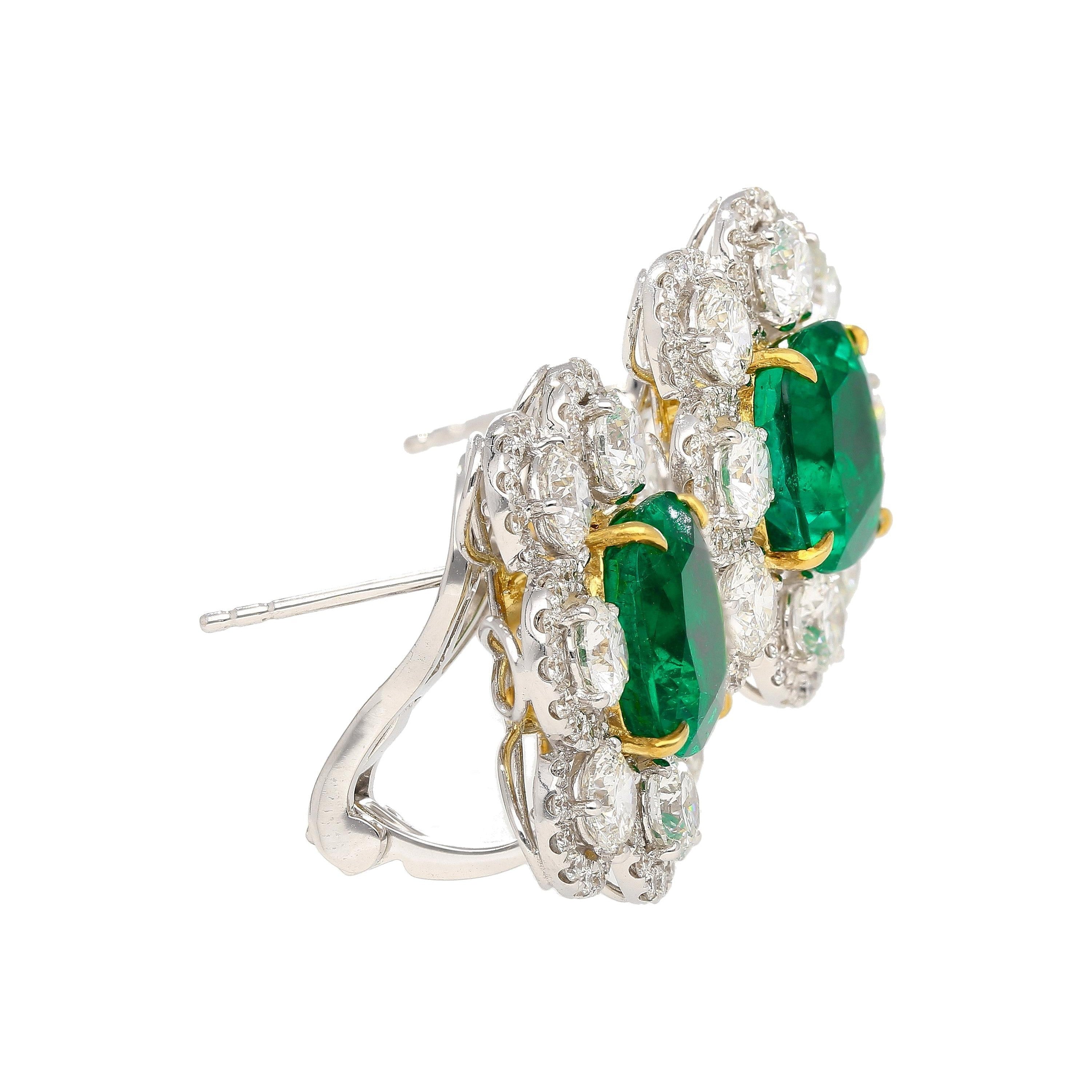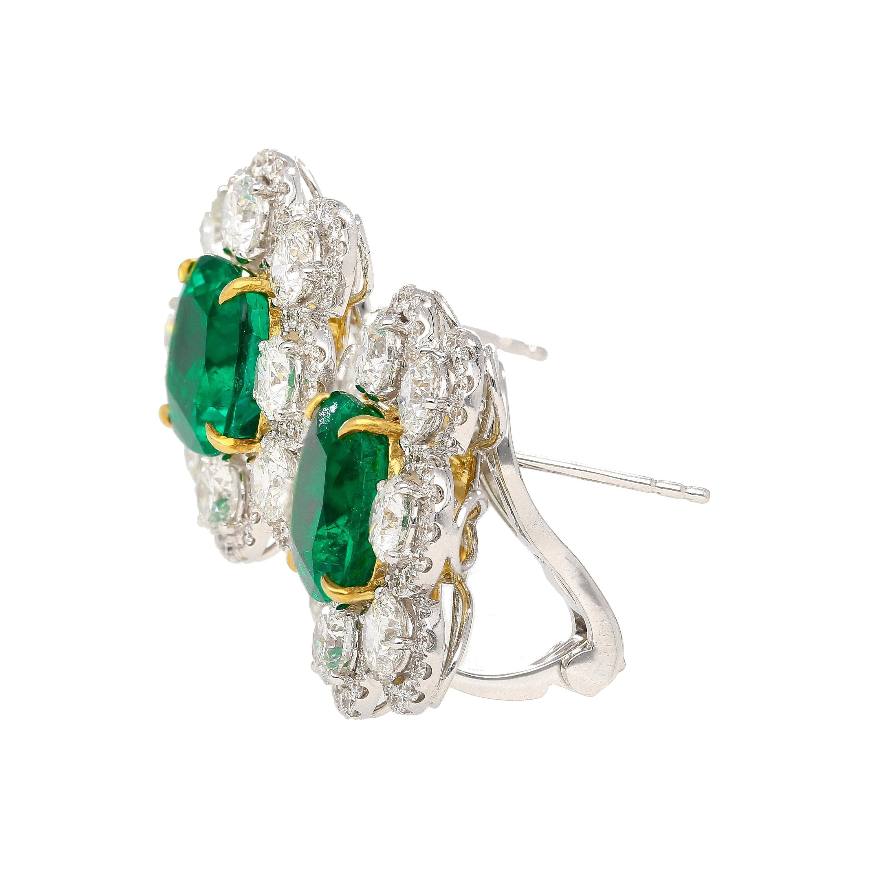 GRS certified matching pair of natural Colombian emerald earrings set in 18K white and yellow gold. These are cushion cut vivid green emerald earrings with round brilliant cut diamond accents.