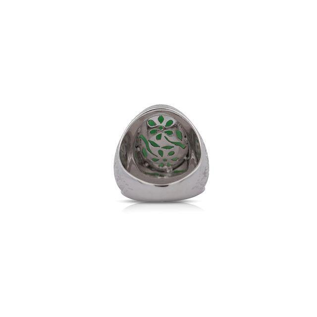 HK Jade and Stone Lab certified 11.05 carat oval cabochon cut untreated green jadeite jade set in 10K white gold mens solitaire ring with filigree detailing. The Grade A Fei Cui jade displays bright green and white translucent coloring with bezel setting on tapered band.