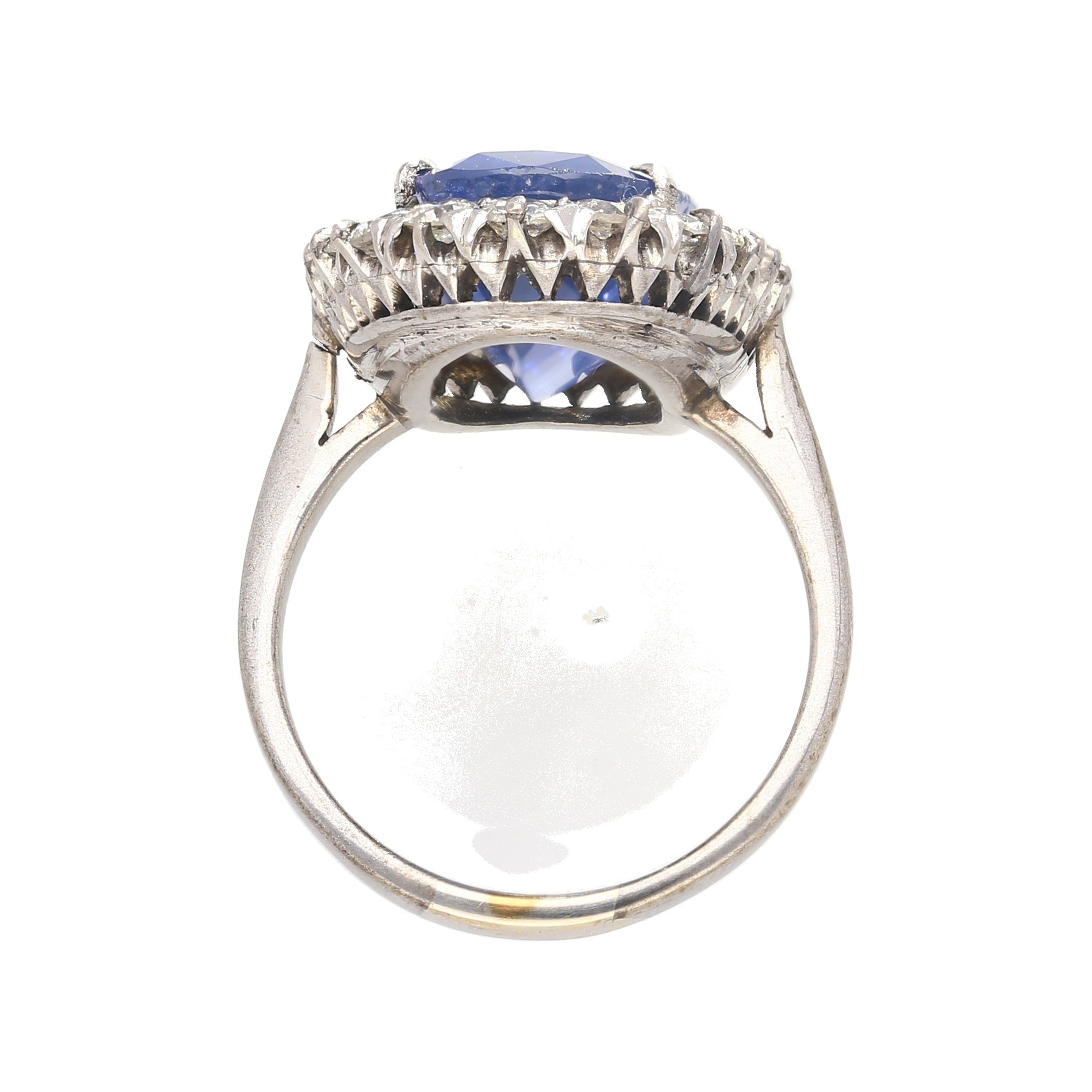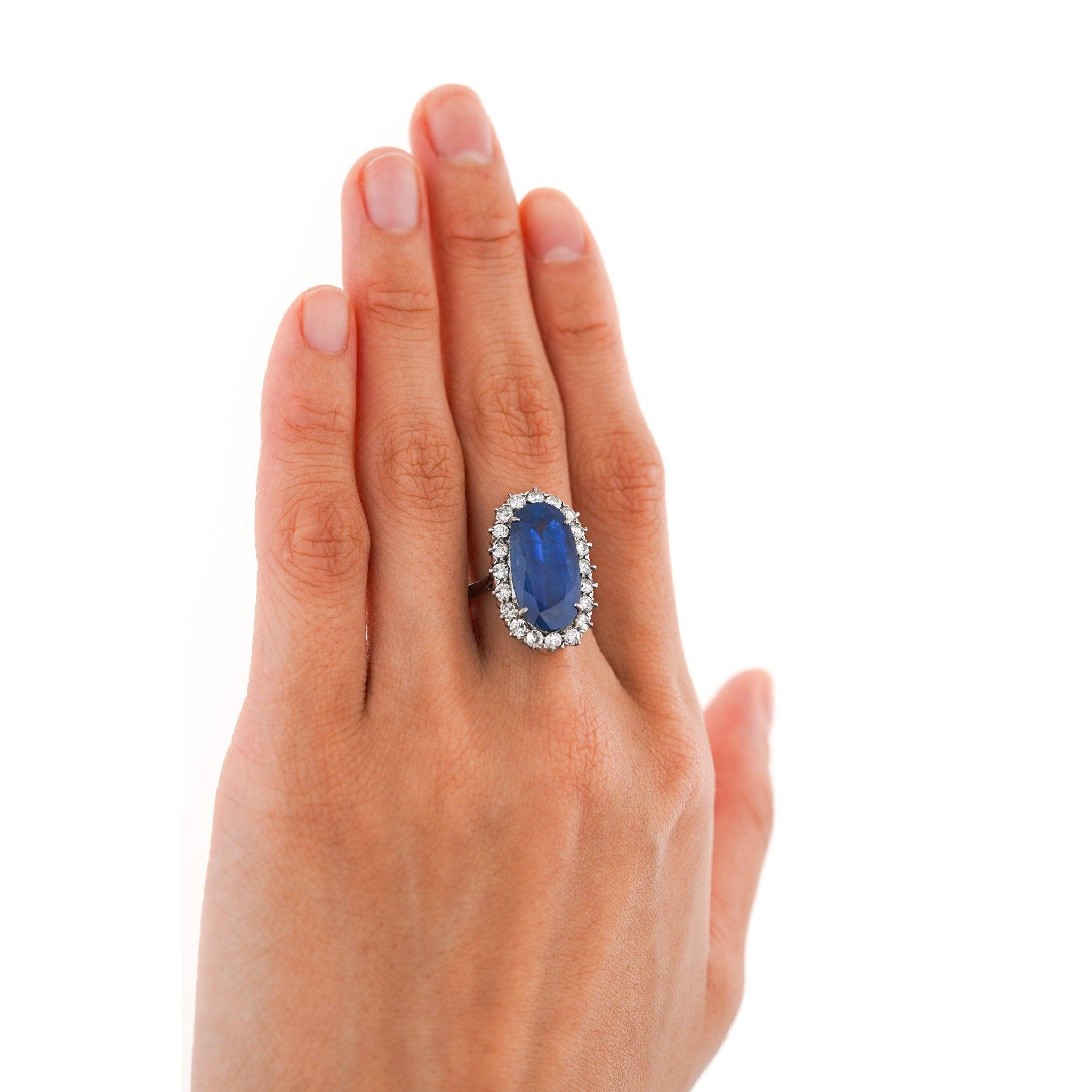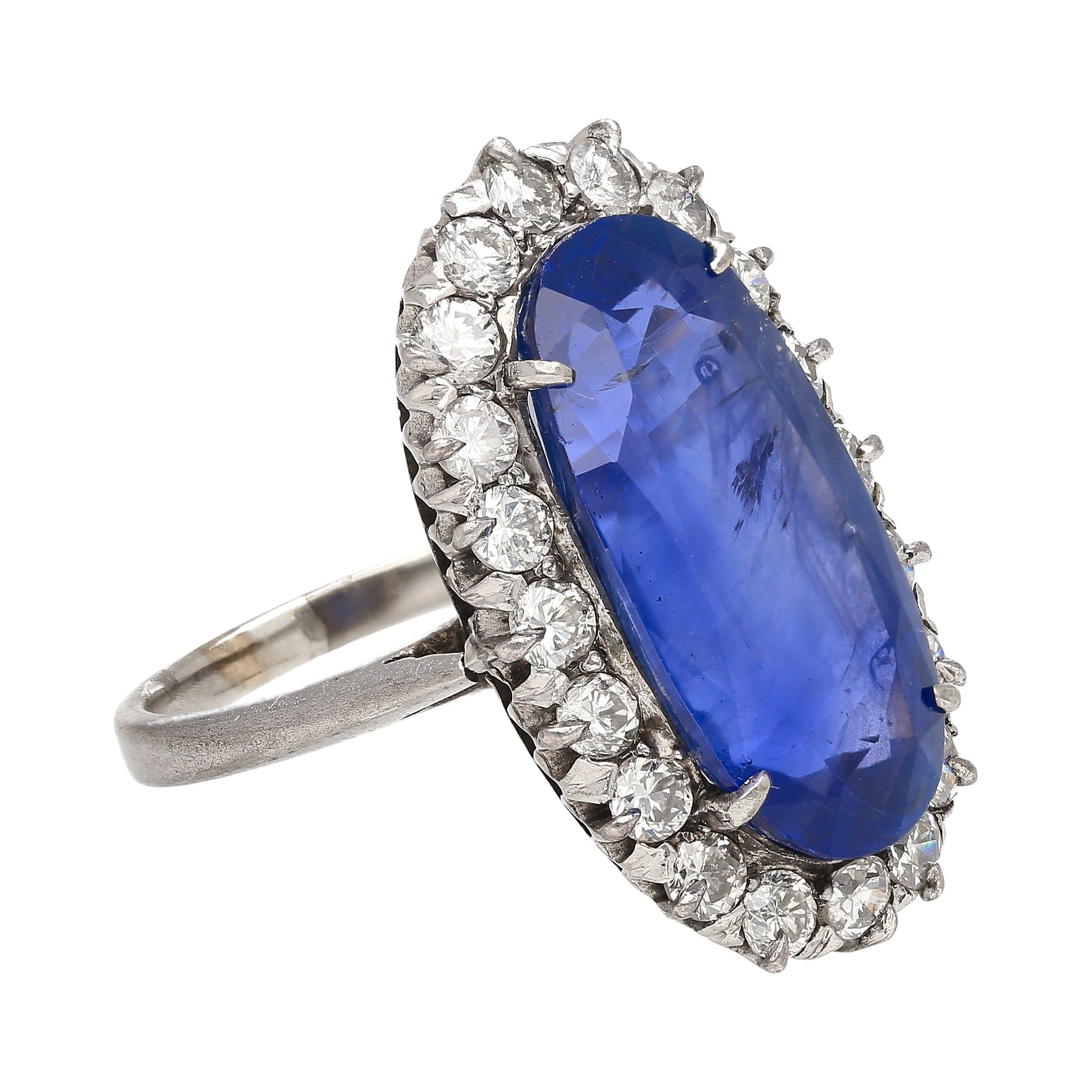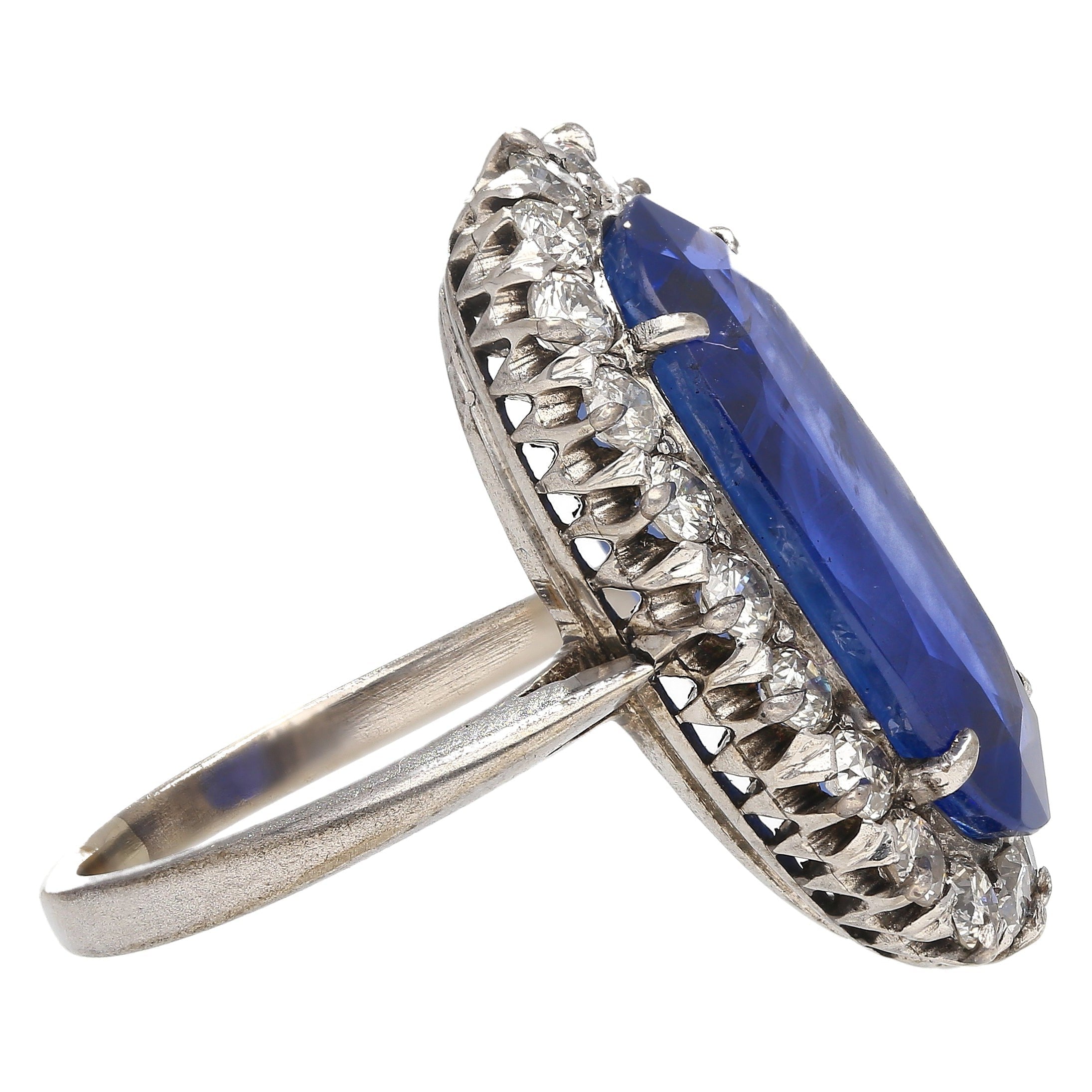 Shop this antique relic from a simpler time. An unheated 11.30-carat oval cut Blue Sapphire of Burmese origin. Set in platinum with a round-cut diamond halo. GRS certified with origin report. Circa late 1800's. The sapphire's natural inclusions, akin to distinctive birthmarks, give the stone a genuine authenticity and individuality, adding a unique personality and character.