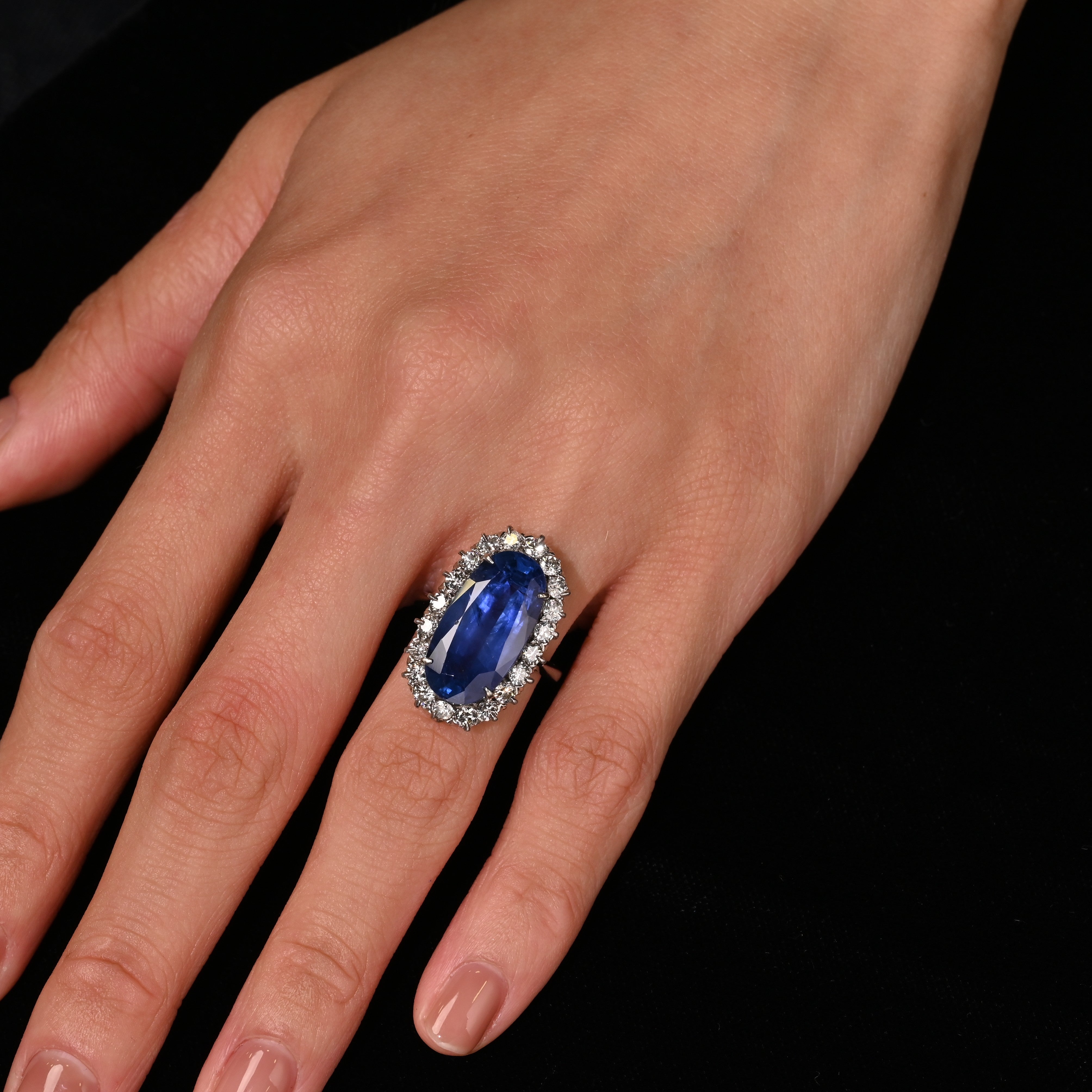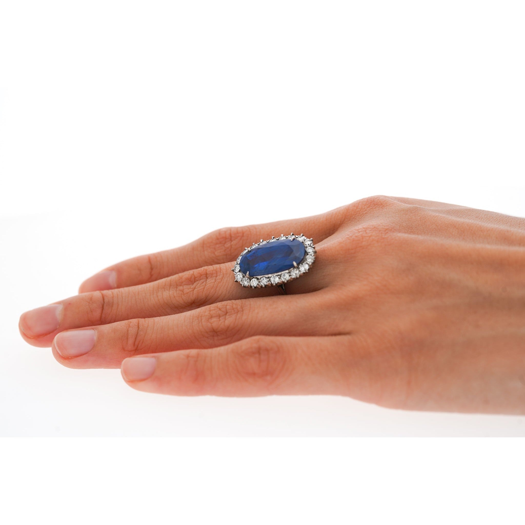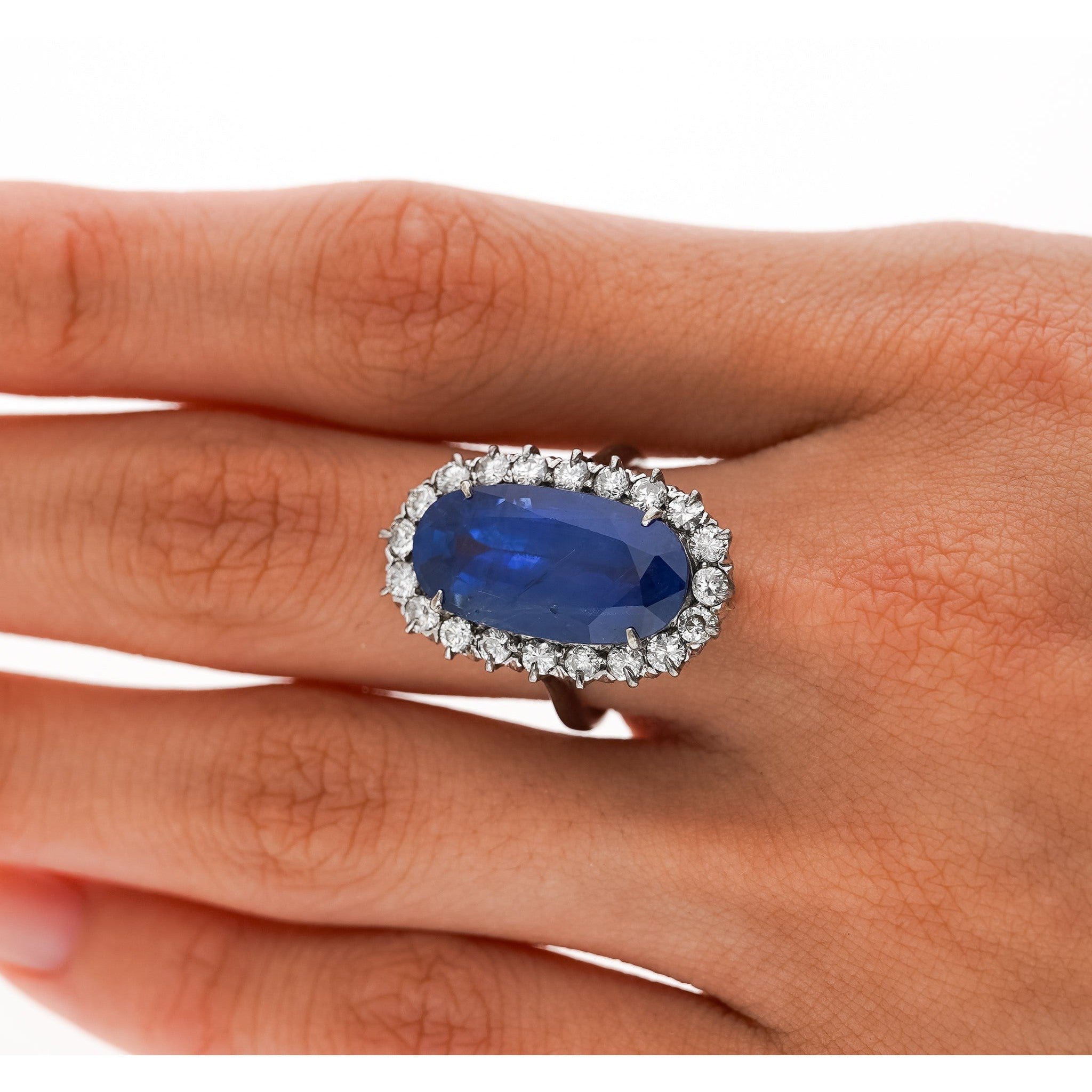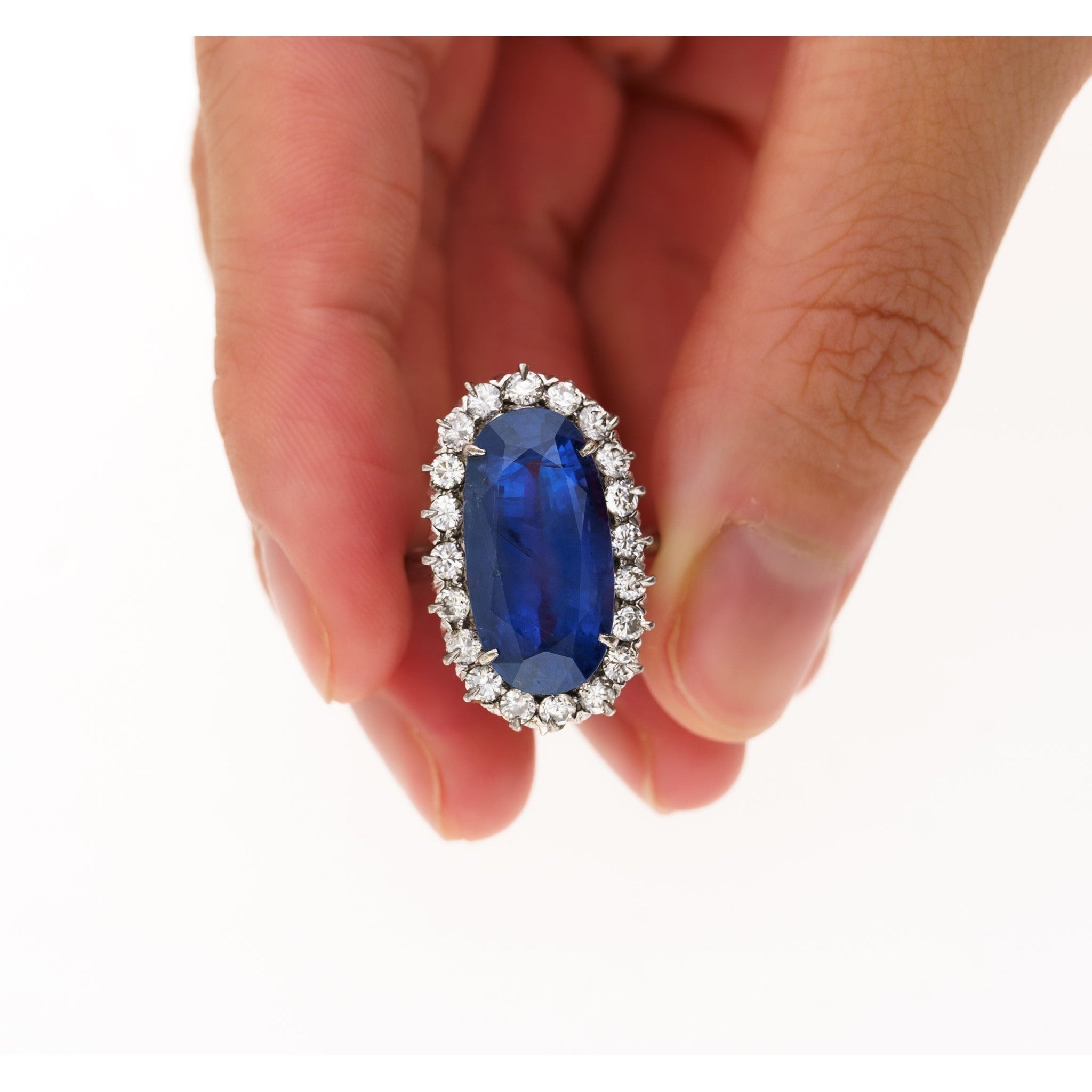 Shop this antique relic from a simpler time. An unheated 11.30-carat oval cut Blue Sapphire of Burmese origin. Set in platinum with a round-cut diamond halo. GRS certified with origin report. Circa late 1800's. The sapphire's natural inclusions, akin to distinctive birthmarks, give the stone a genuine authenticity and individuality, adding a unique personality and character.