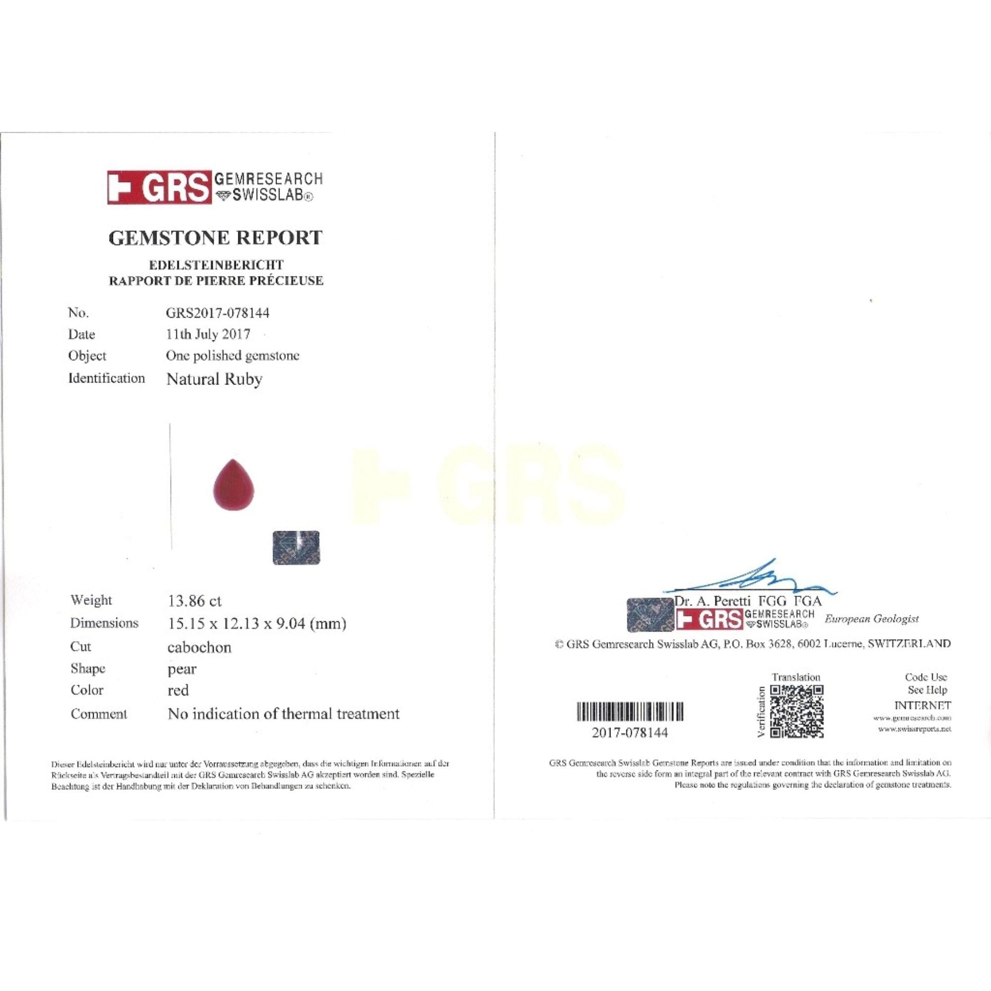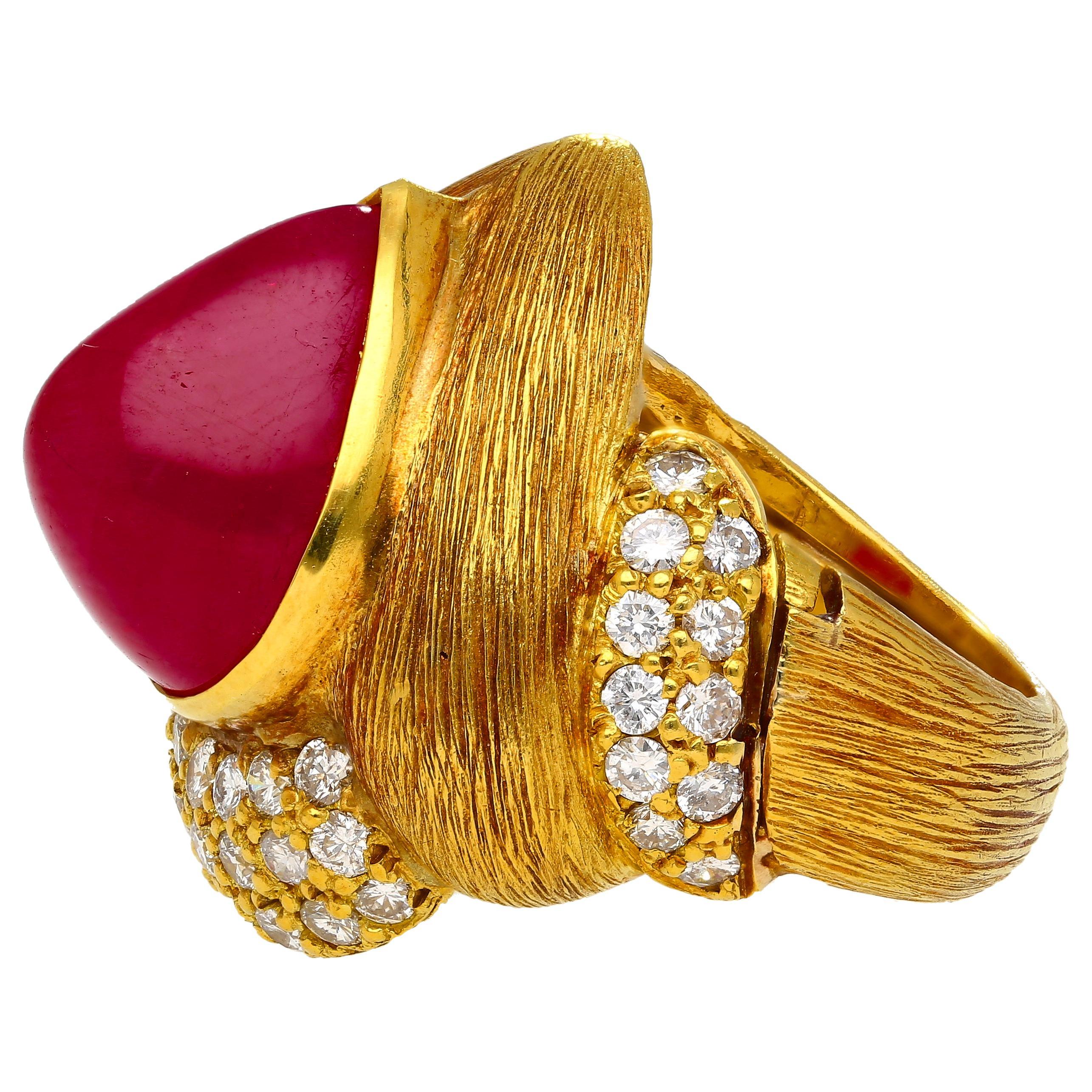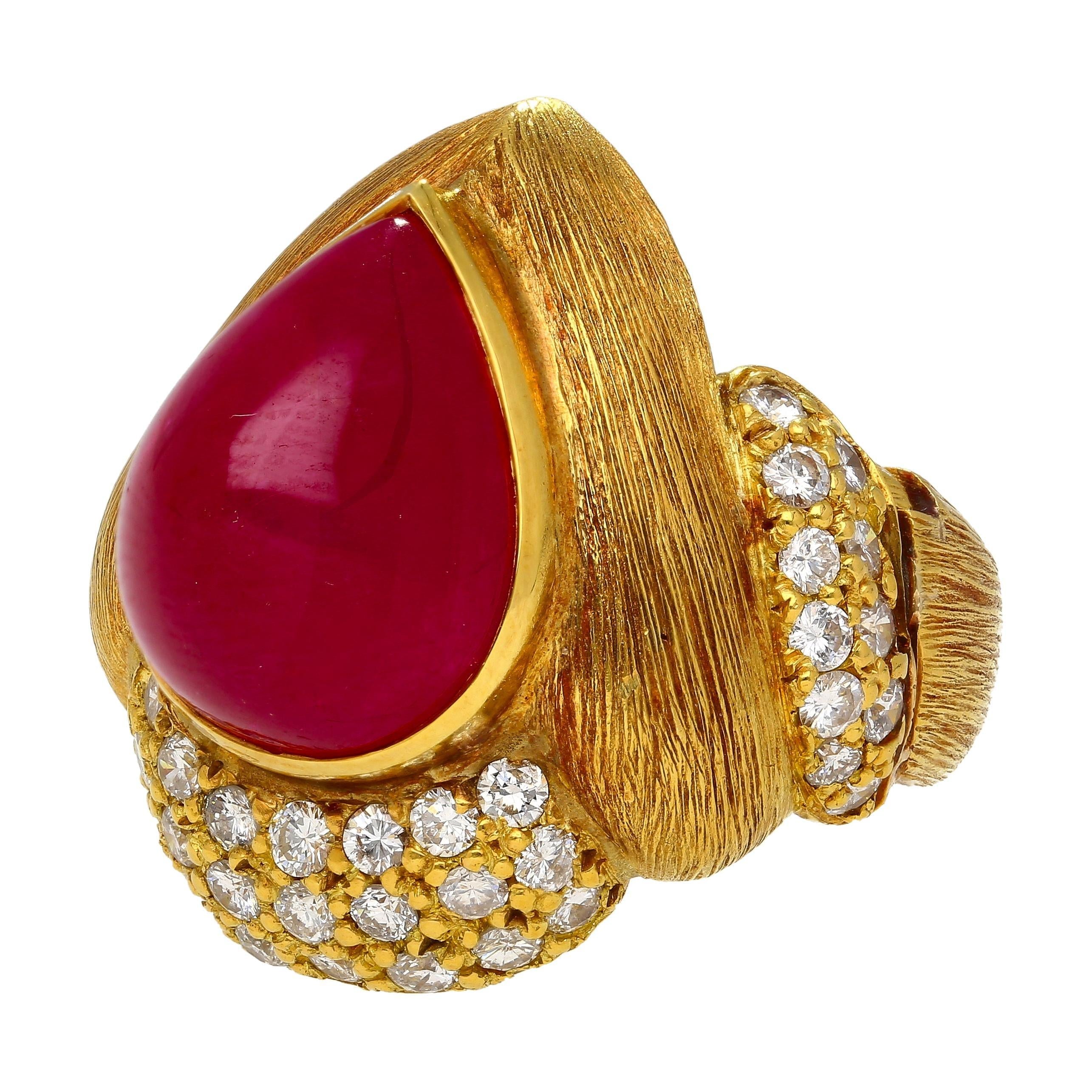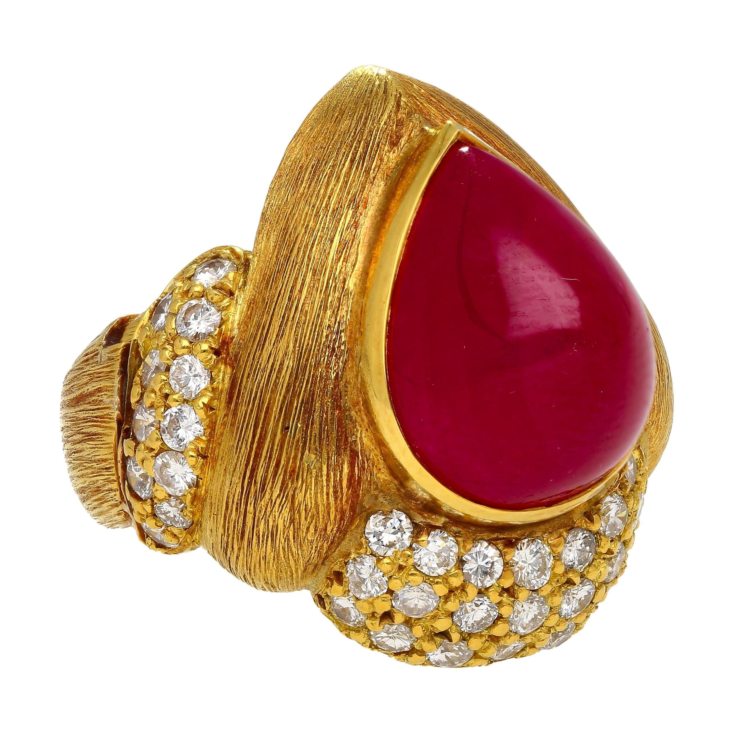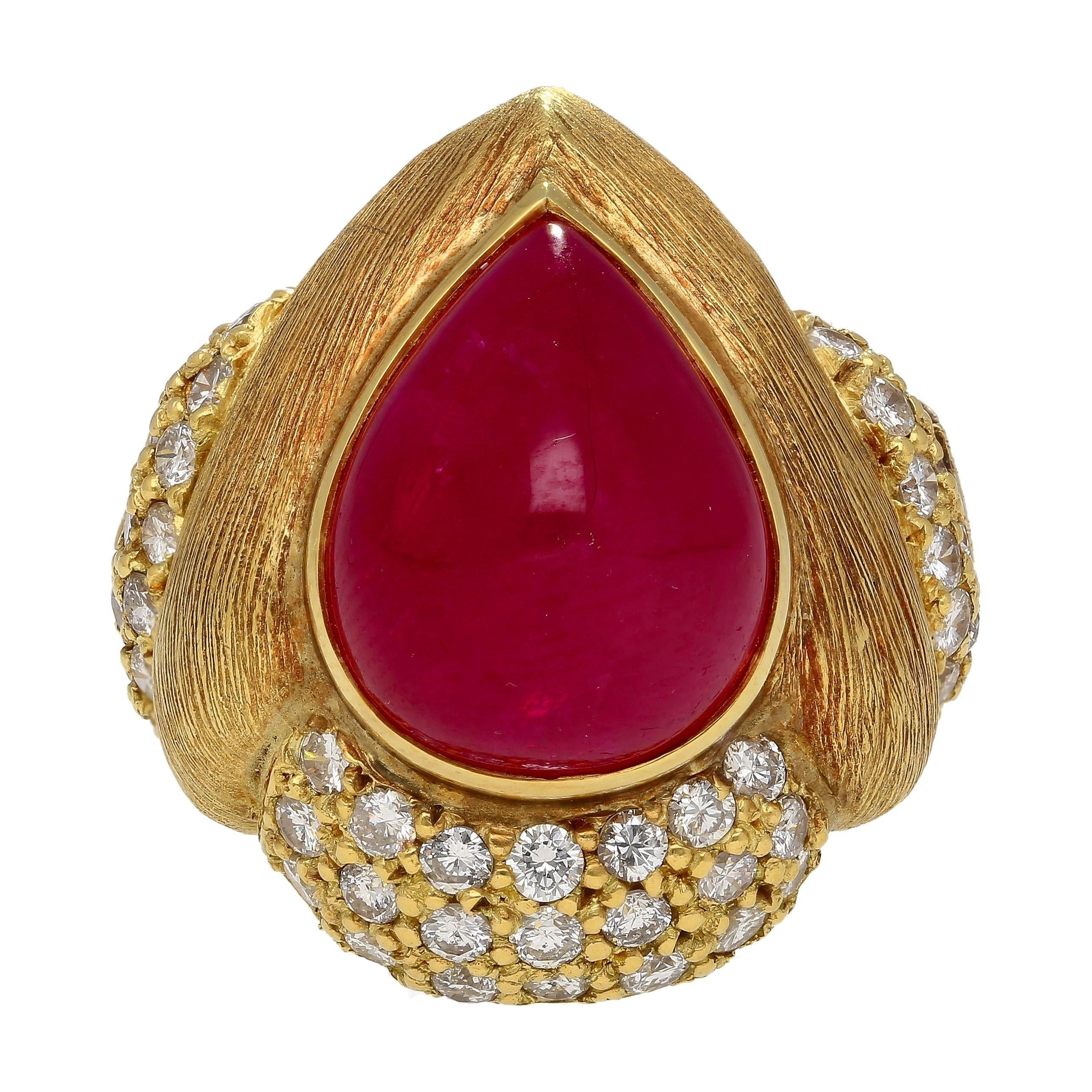 This 18K Yellow Gold ring features a 13.86 Carat cabochon pear cut Ruby and 1.75 Carats of round brilliant diamonds. The ruby is GRS Certified and unheated, showcasing its natural deep red color. The ring is designed with a textured line gold finish, adding a bold, vintage feel. Signed Eiseman.