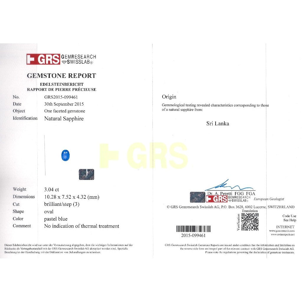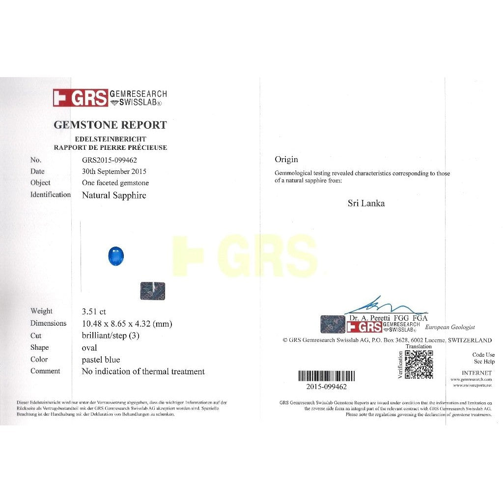 - Accompanied by multiple GRS reports confirming each sapphire is natural, Sri Lanka origin, oval cut, blue color, and untreated, including: