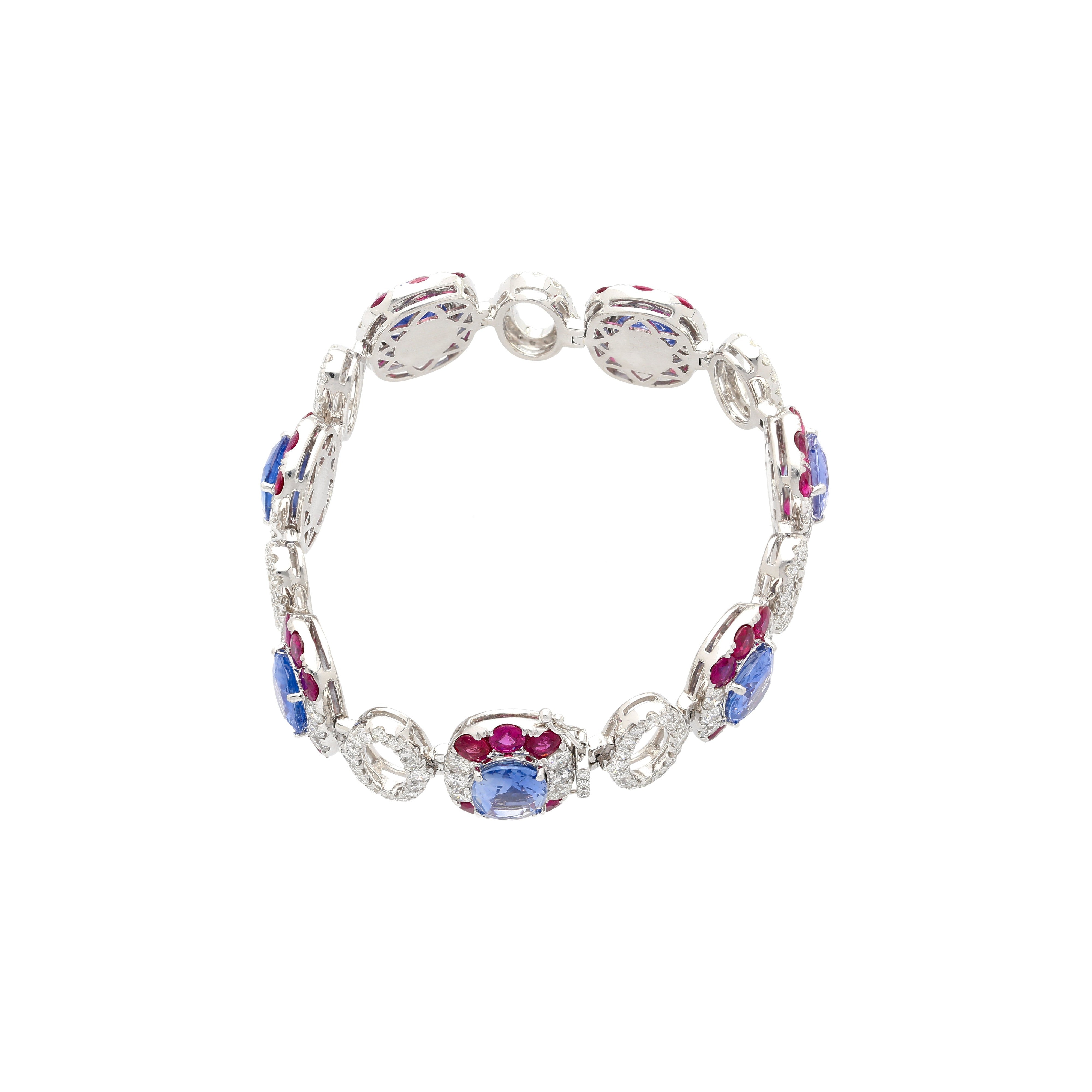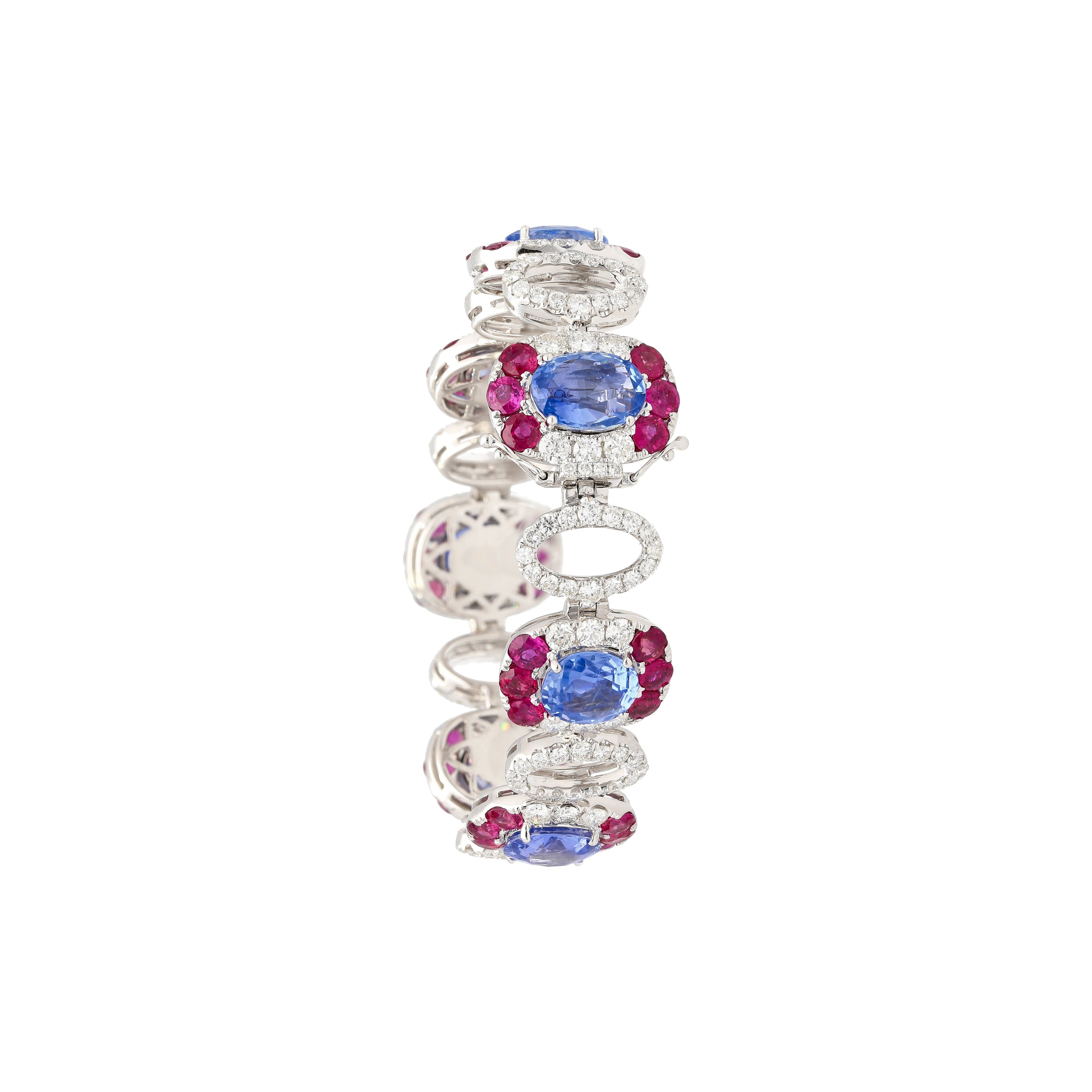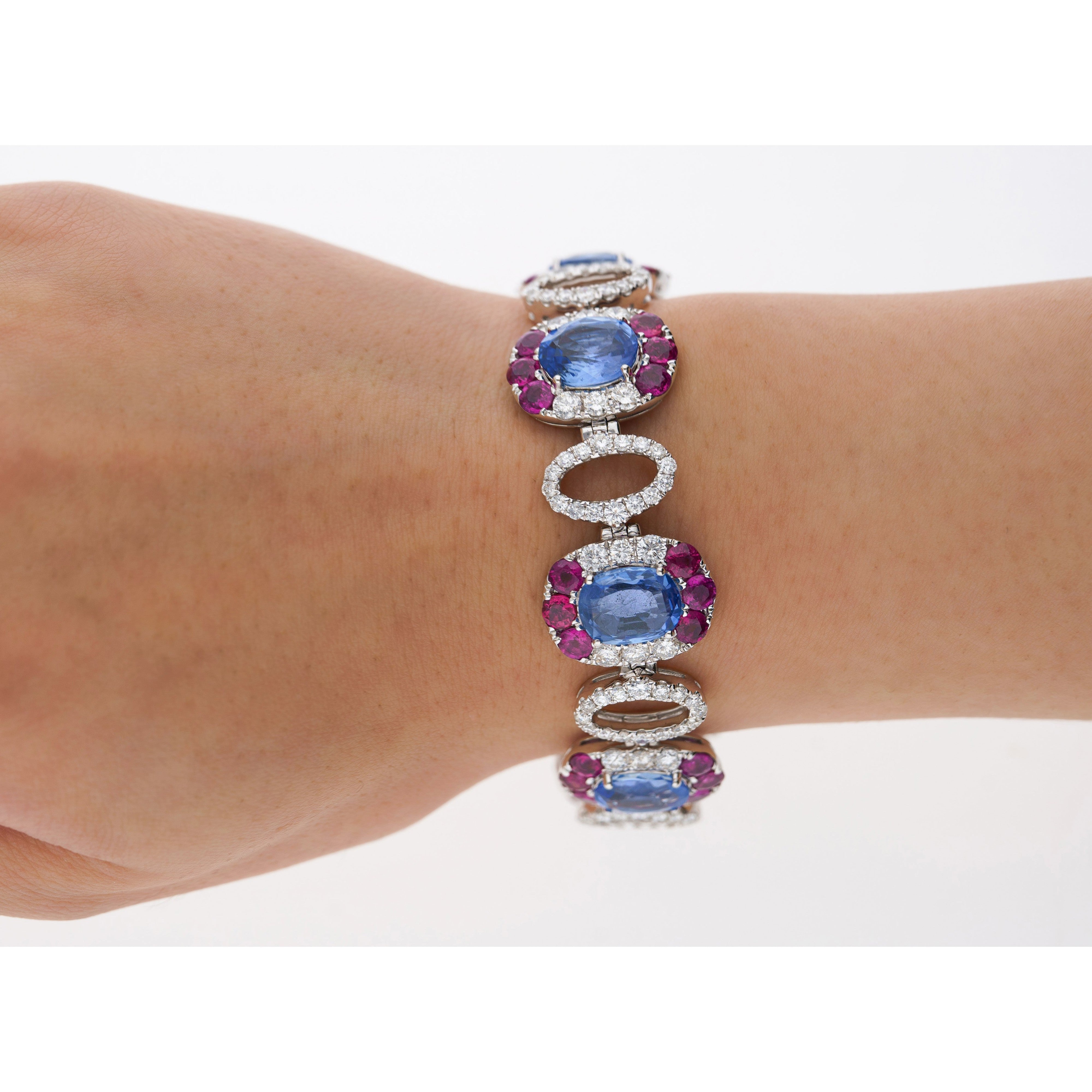 GRS certified natural blue sapphires totaling 23.72 carats set in an 18K white gold oval link bracelet. This is a multi gemstone bracelet with no heat oval cut Ceylon sapphires, round cut diamonds, and round cut rubies.