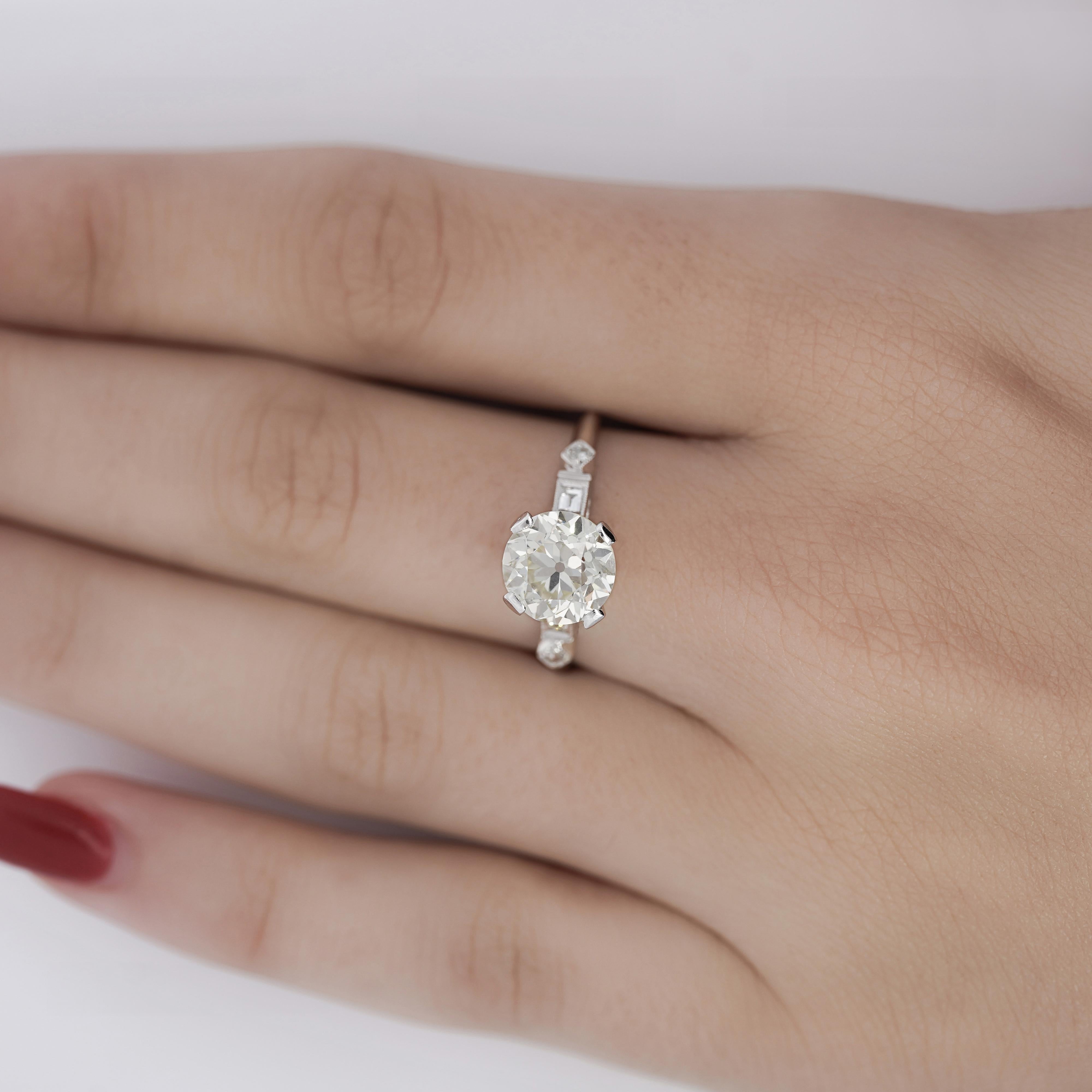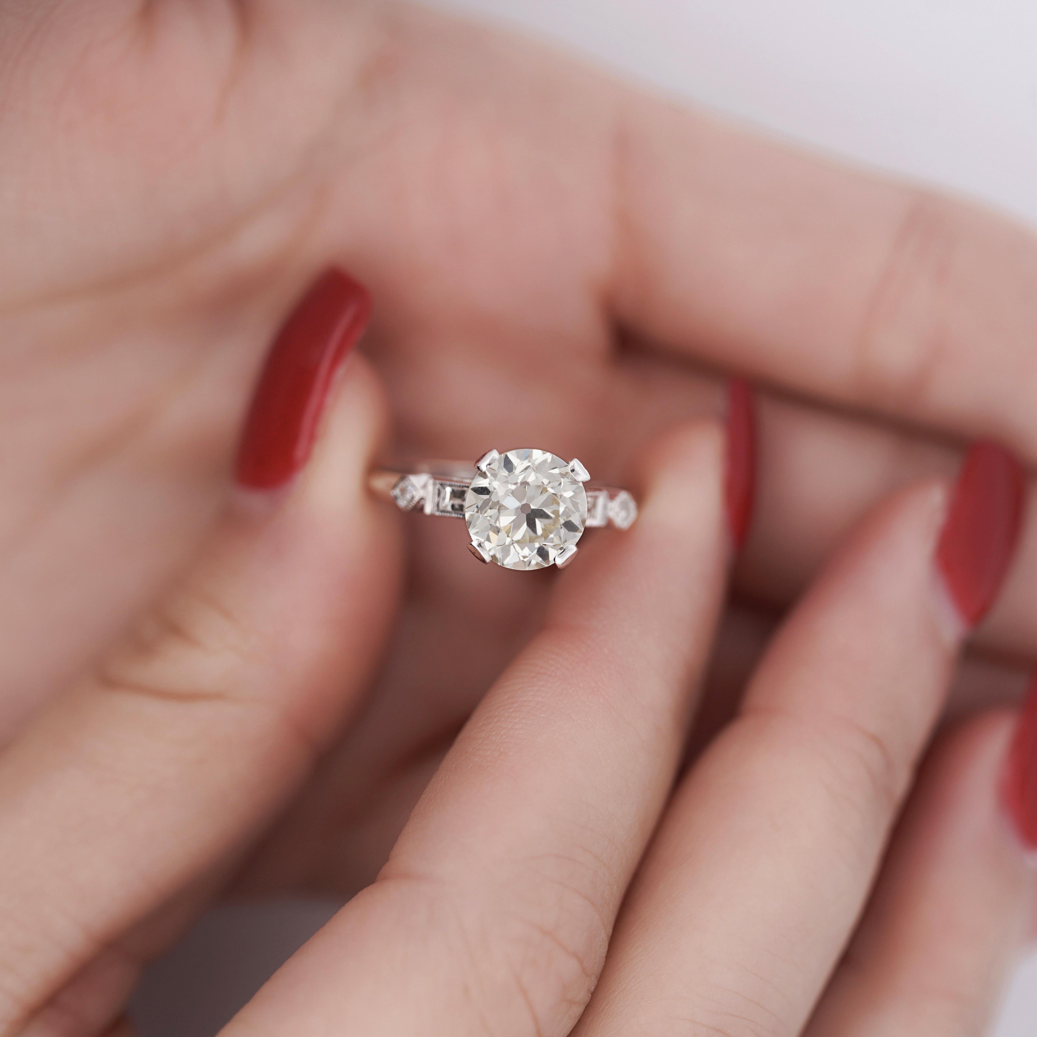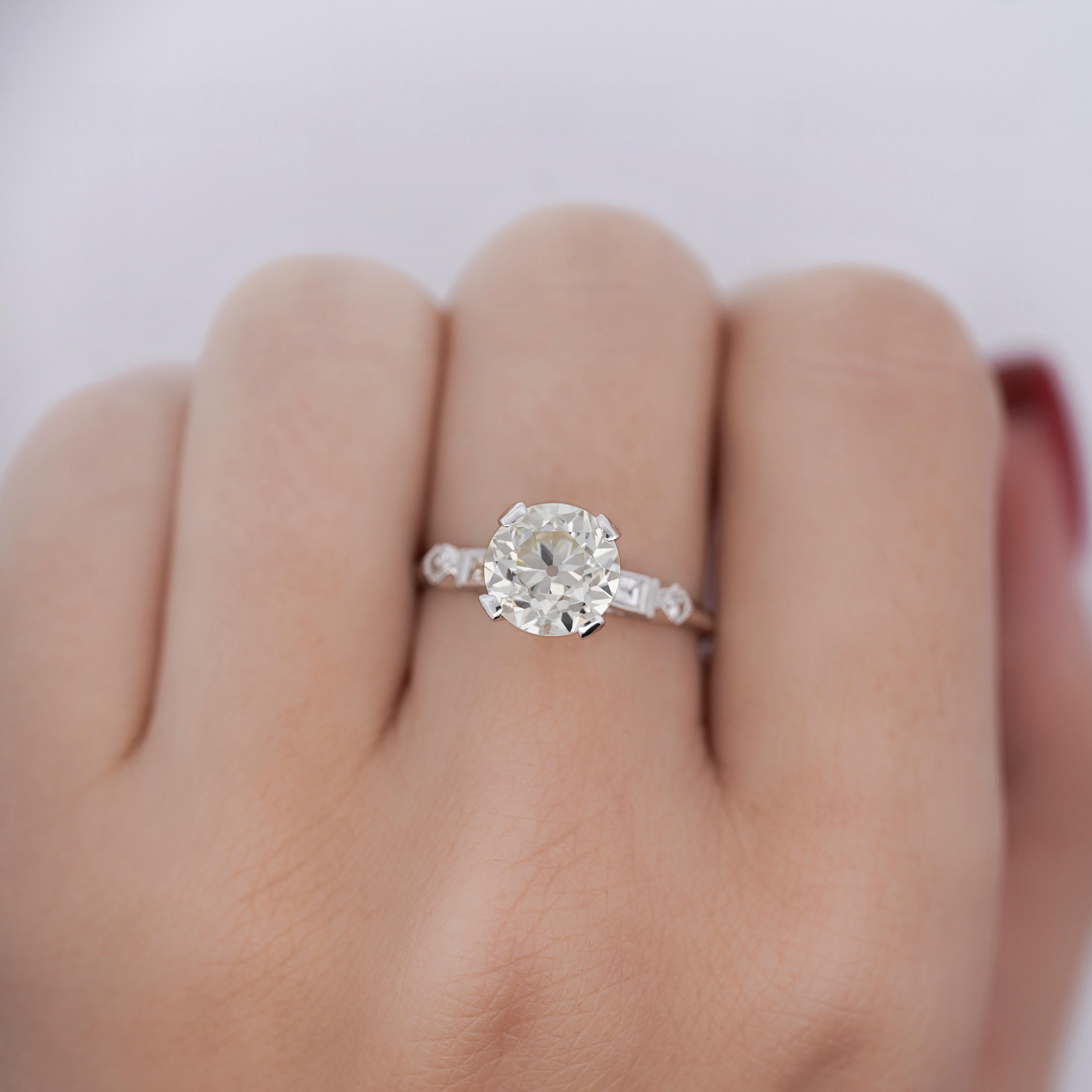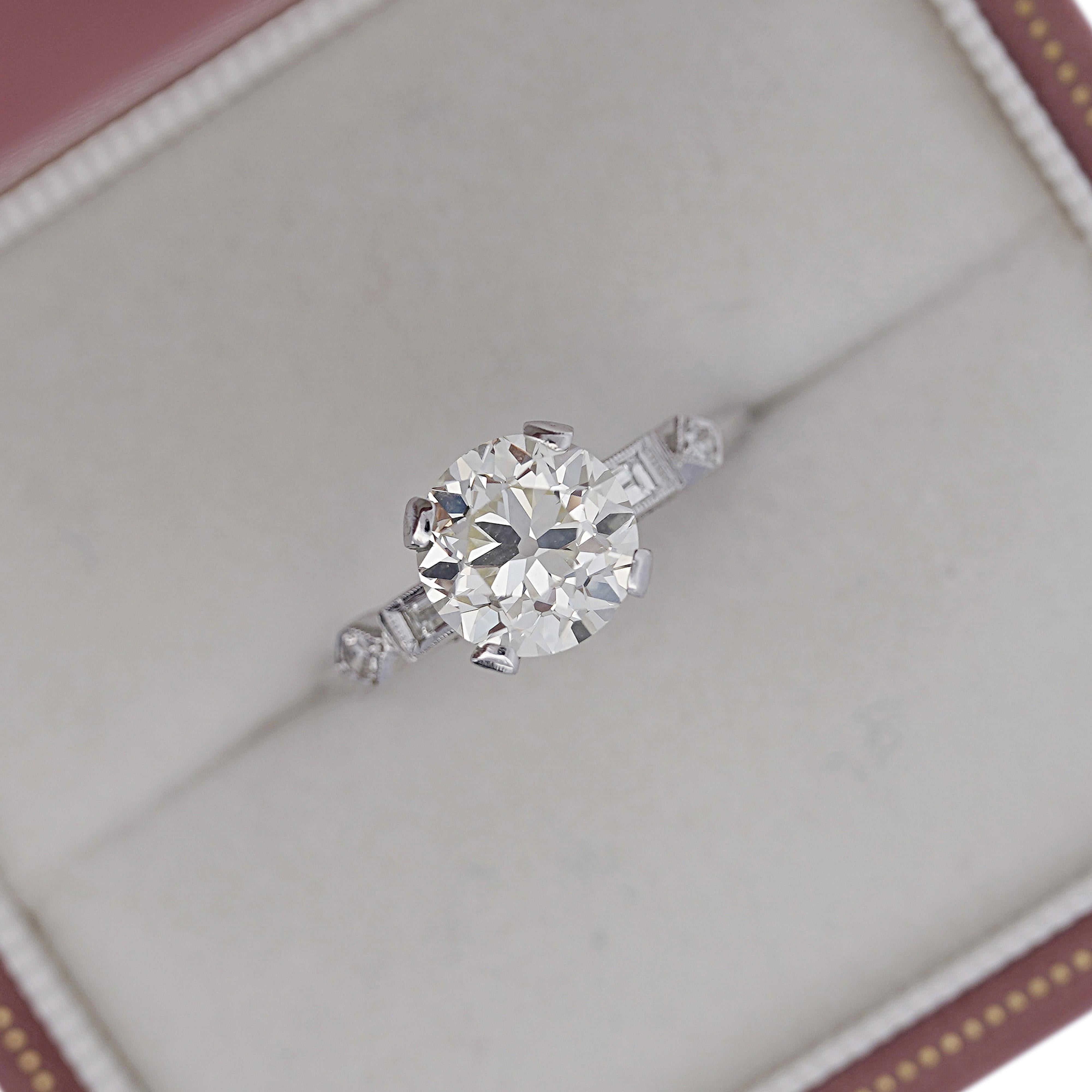EGL Certified Natural 2.61 Carat European Cut M-N color, VS1 clarity Diamond Vintage Art Deco Engagement Ring. Set in a vintage platinum setting with stunning filigree and milgrain finishes on the shank. The center stone is flanked by 4 baguette cut and round cut side stones.
