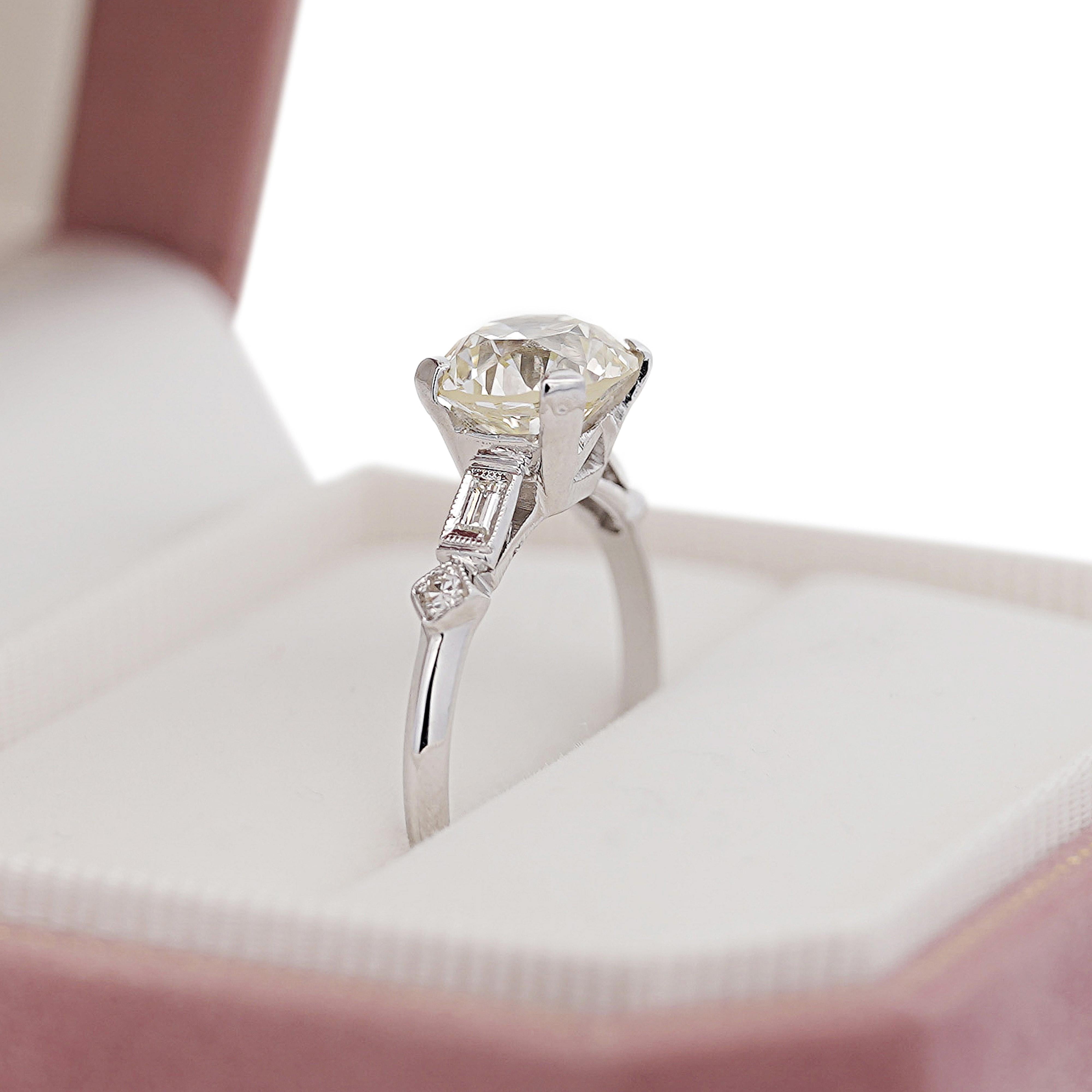 EGL Comments: A diamond ring, set in platinum (stamped ‘10% IRID.PLATINUM’), containing 1 natural old european brilliant white diamond, as reported. The ring also contains 2 baguette side diamonds that are G - H in color, VS1 - VS2 in clarity, with a cumulative weight of 0.08 carats. The ring also contains 2 single cut side diamonds that are F - G in color, VS1 - VS2 in clarity, with a cumulative weight of 0.04 carats. Total diamond weight of the ring is 2.73 carats. Total gram weight of the ring is 3.40 grams. Jewelry setting may affect analyses.