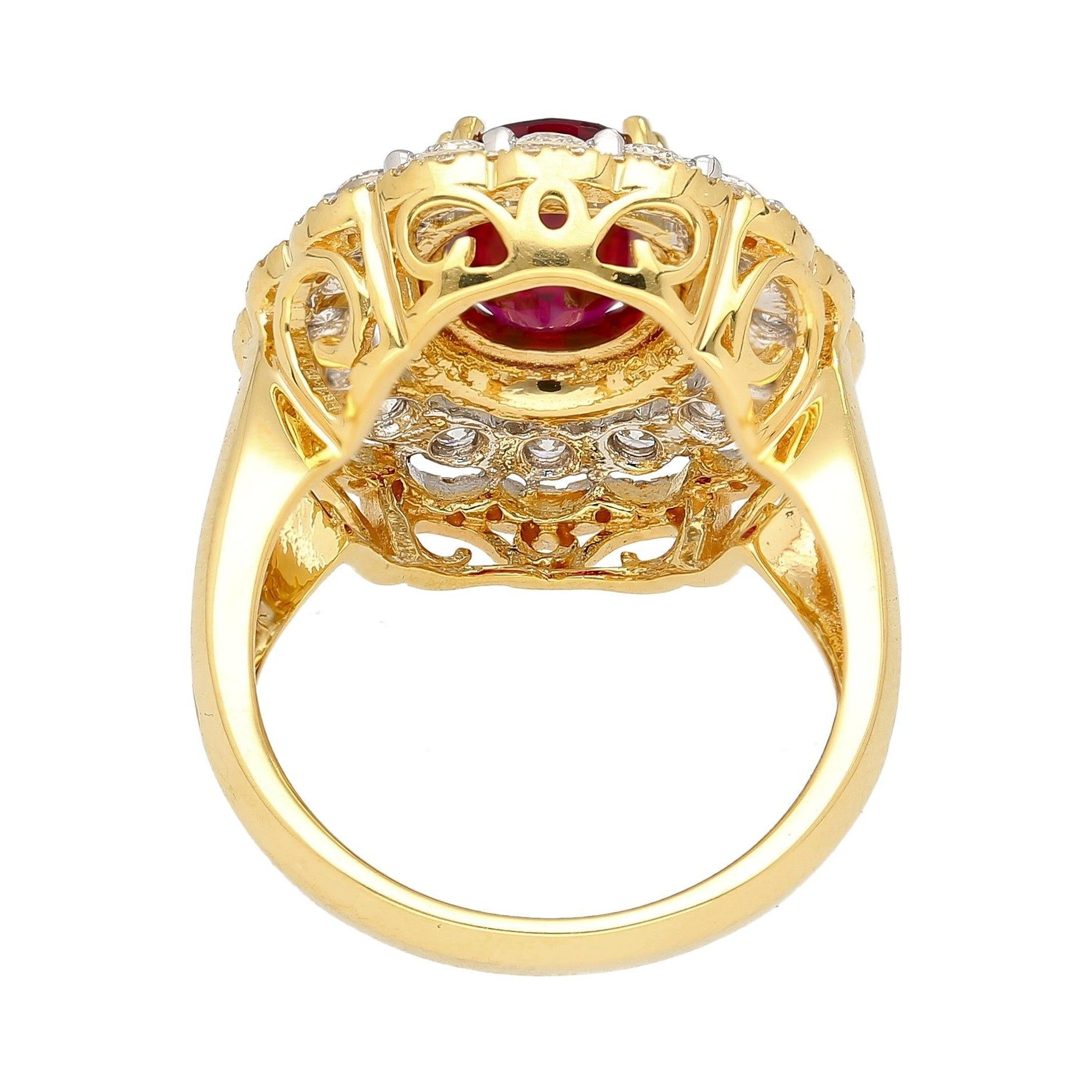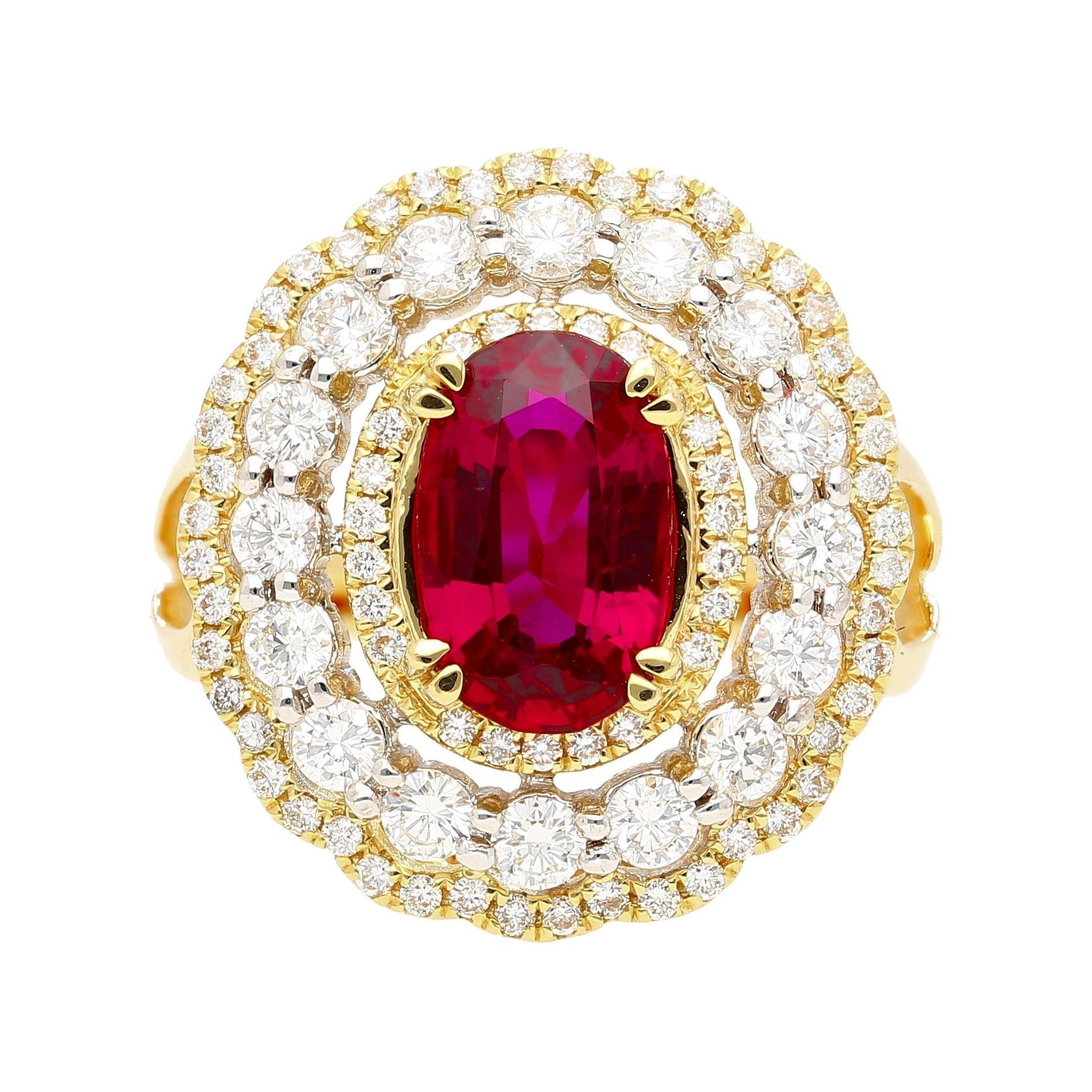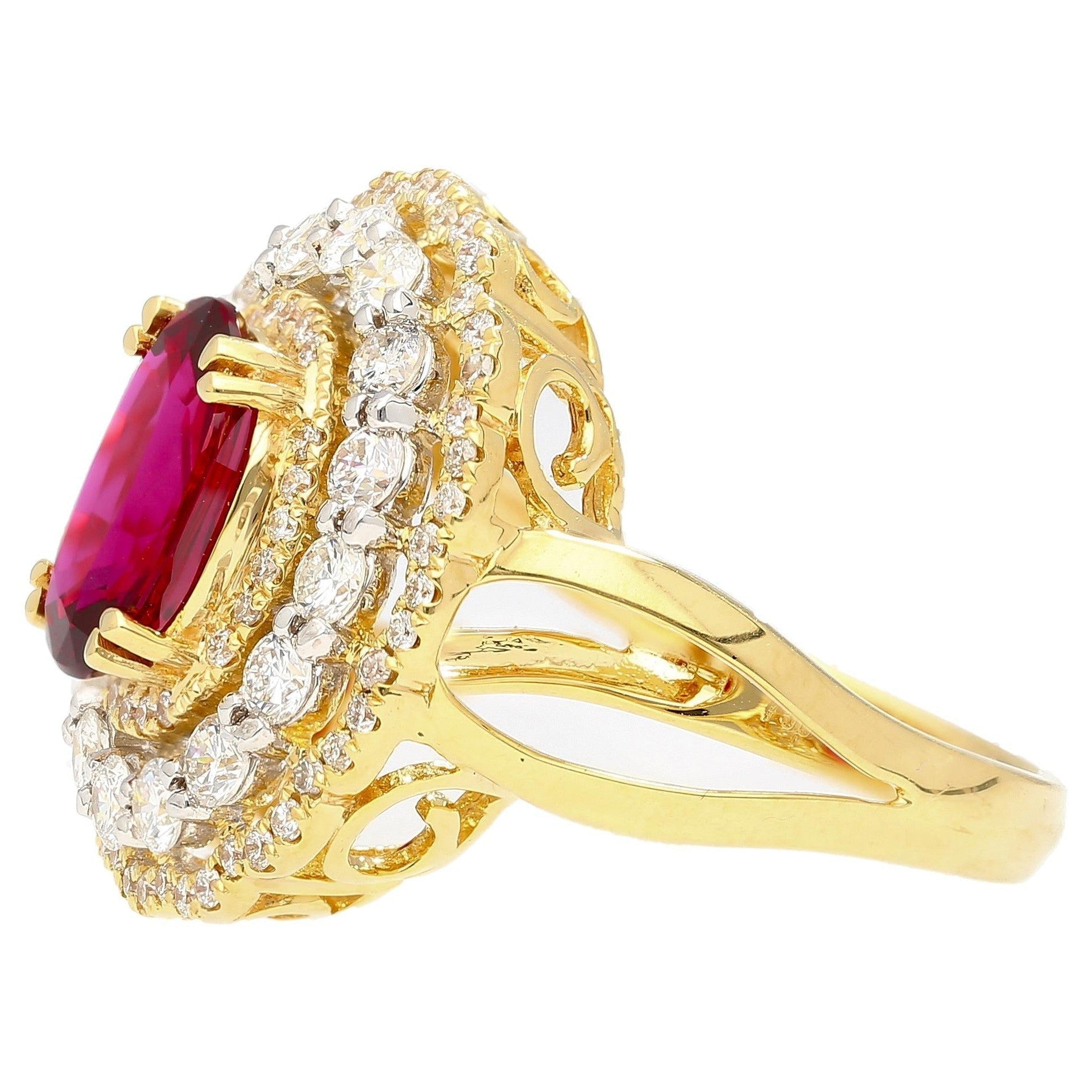 GRS certified 2.58 carat oval cut Thai ruby set in 18K white and yellow gold retro vintage cocktail ring with triple diamond halo. The two-tone design features cathedral split shank, open back setting, and round diamond accents in prong setting.
