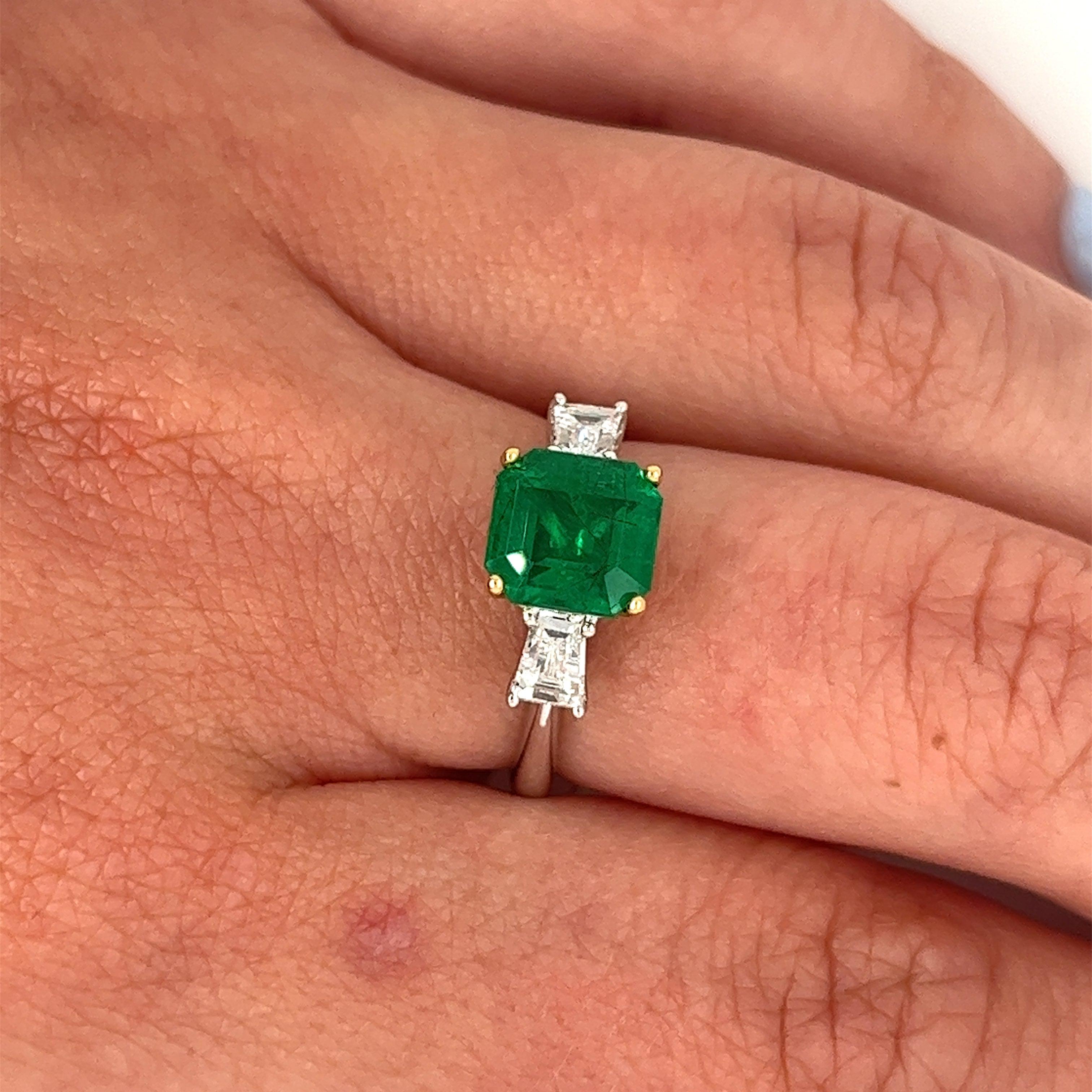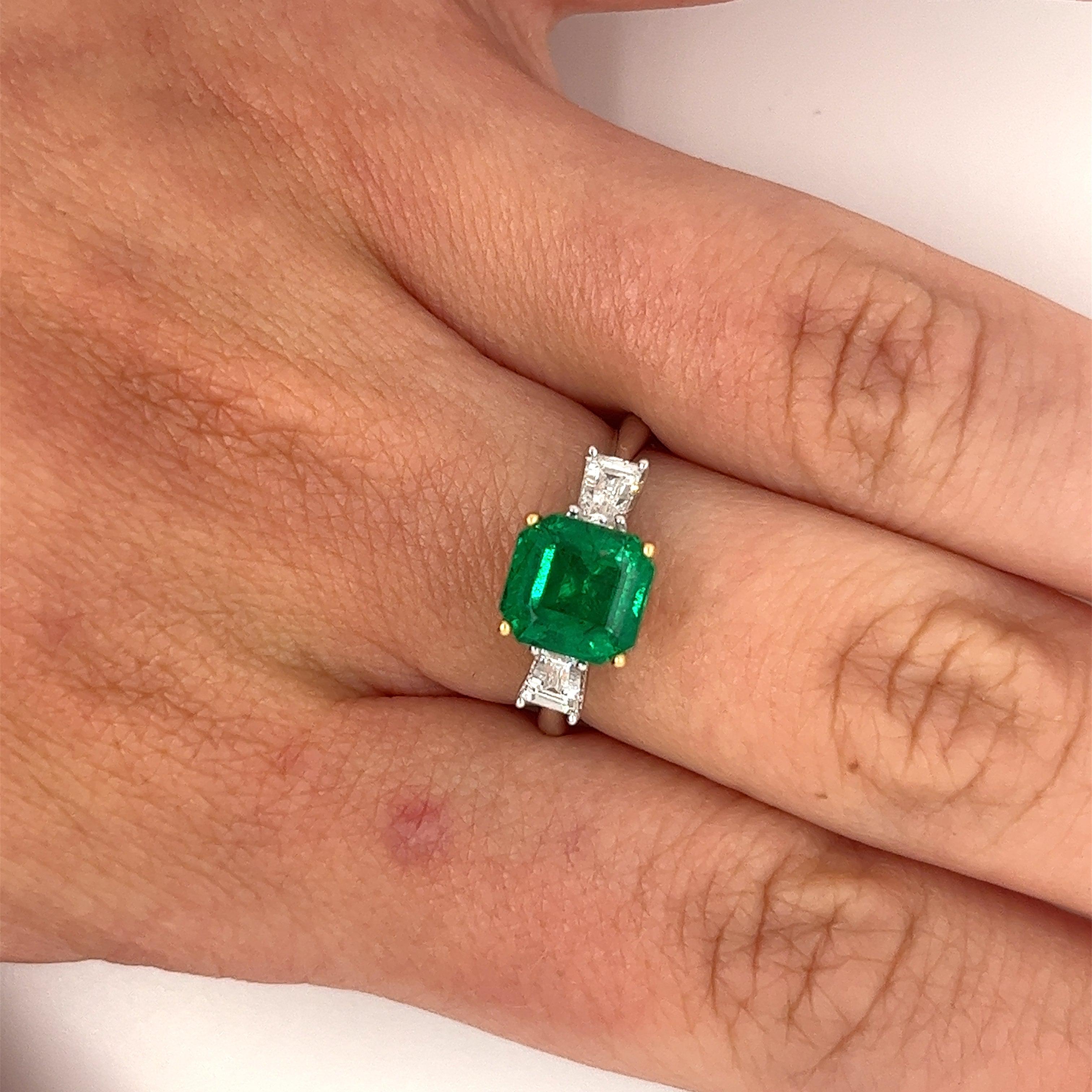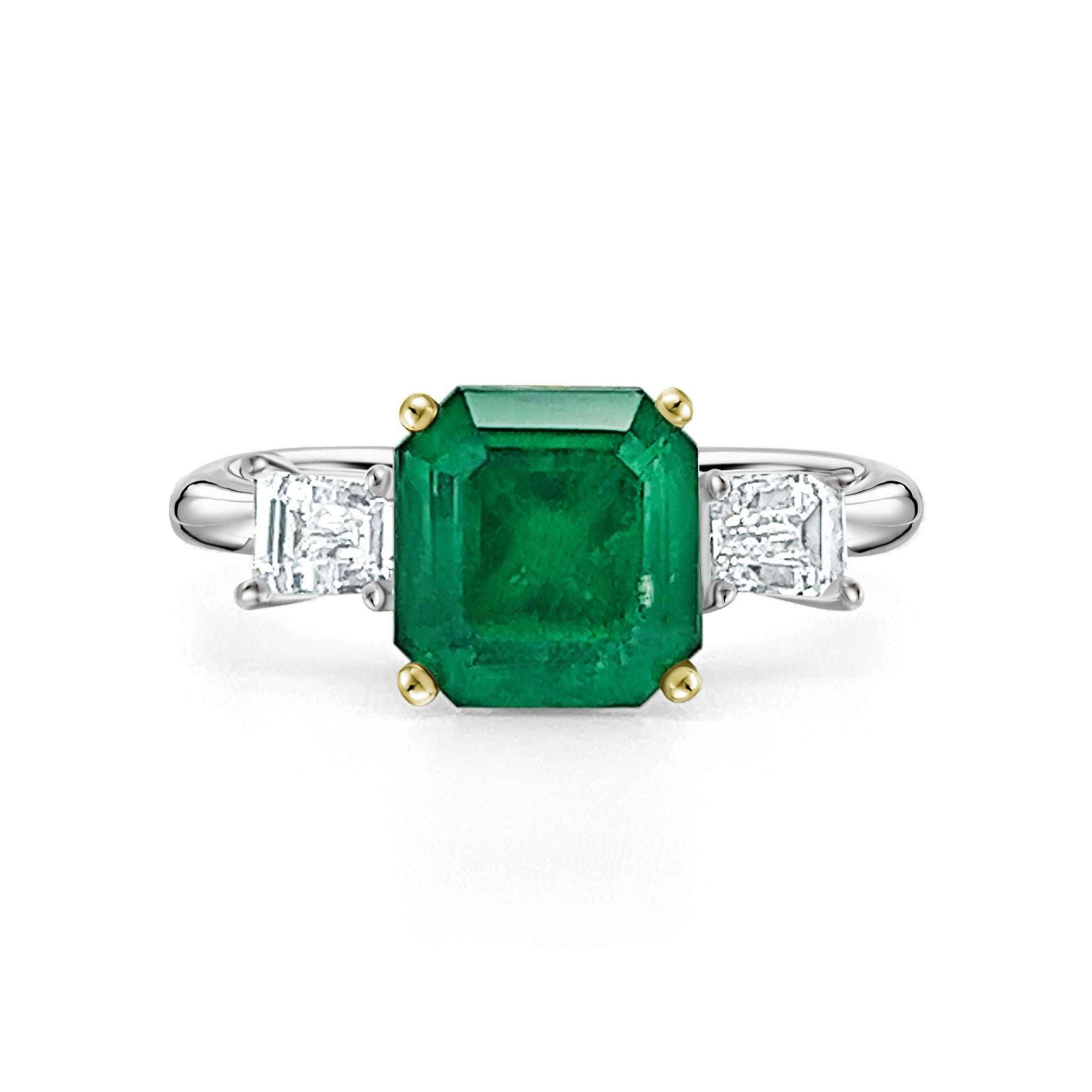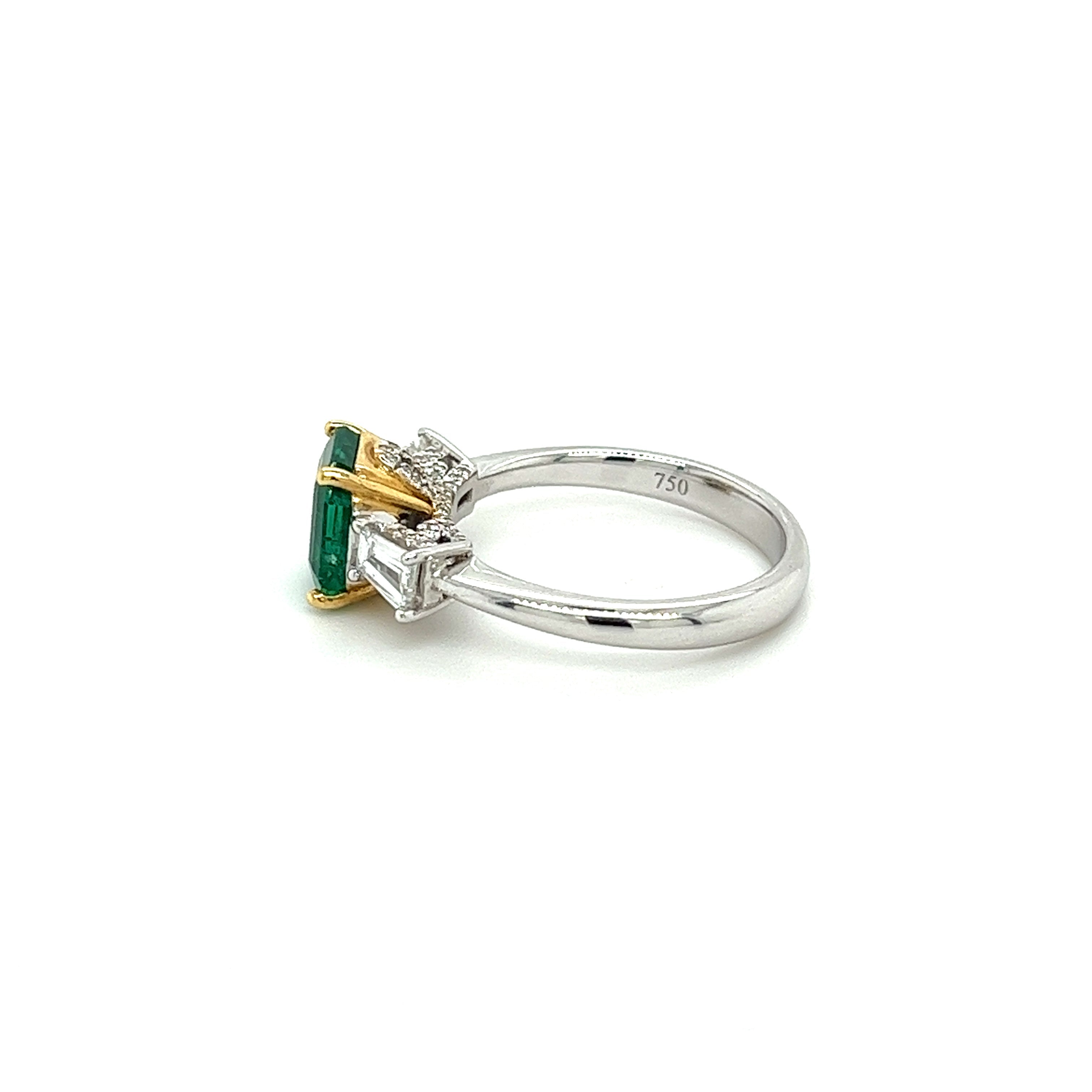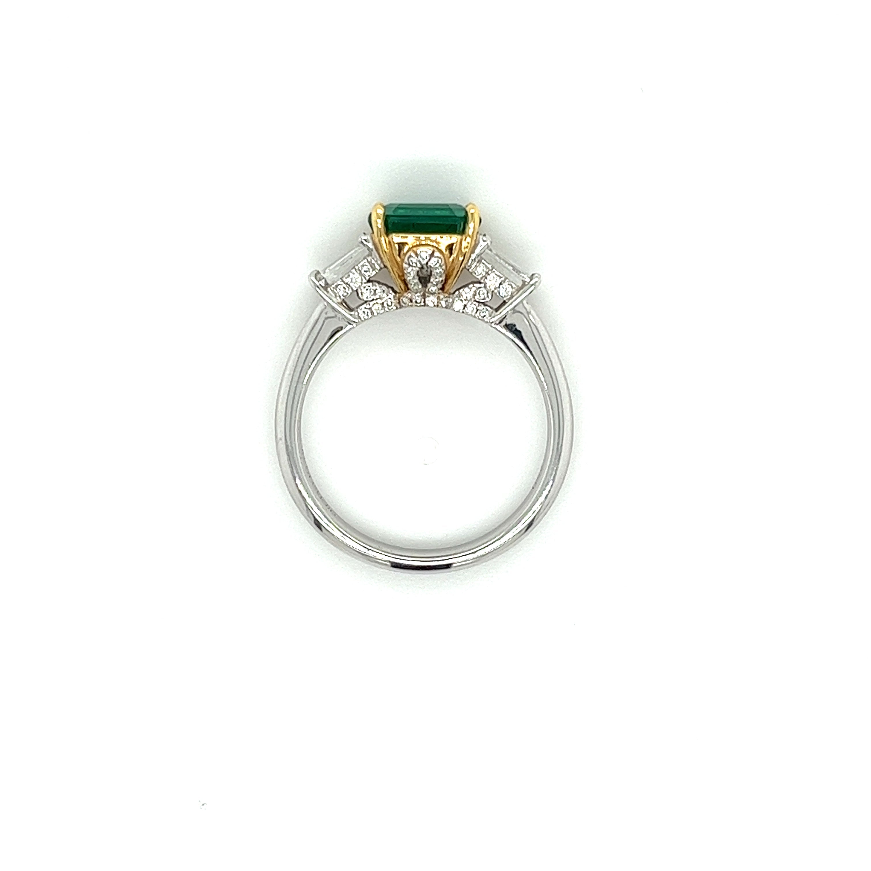 2.19 carat natural Zambian emerald and diamond ring in two-tone 18k white and yellow gold.