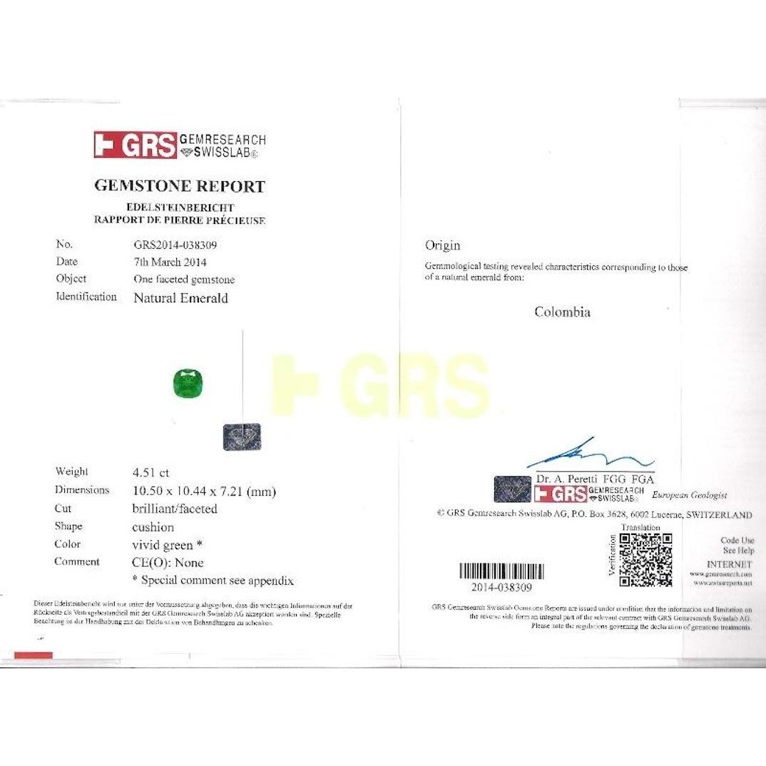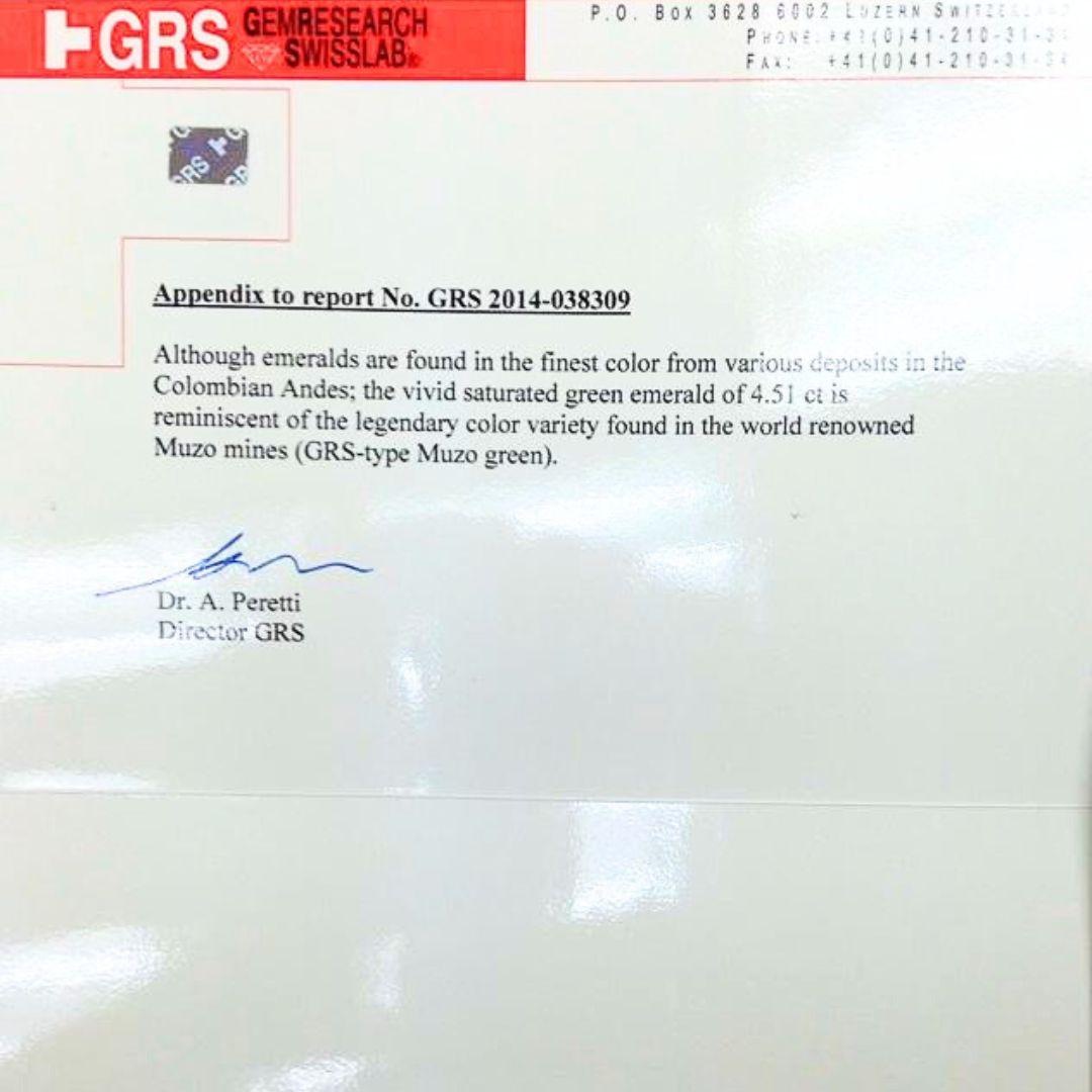 - GRS appendix noting the 4.51 carat emerald shows no oil treatment and origin consistent with the Muzo mine in Colombia