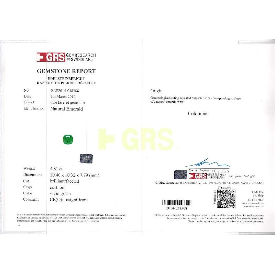 - Accompanied by GRS certification stating all emeralds are natural, Colombian origin, vivid green color, with oil treatments ranging from none to insignificant