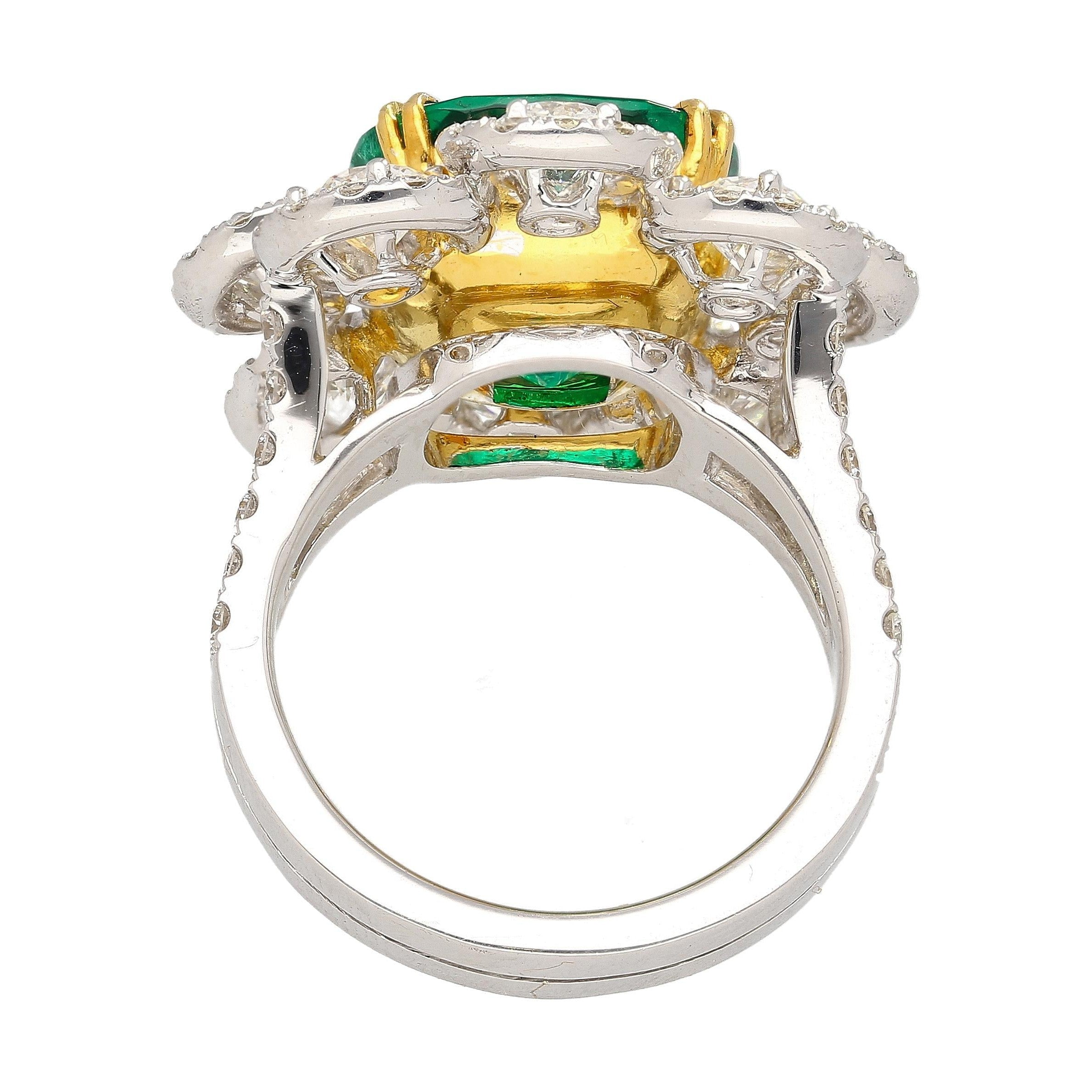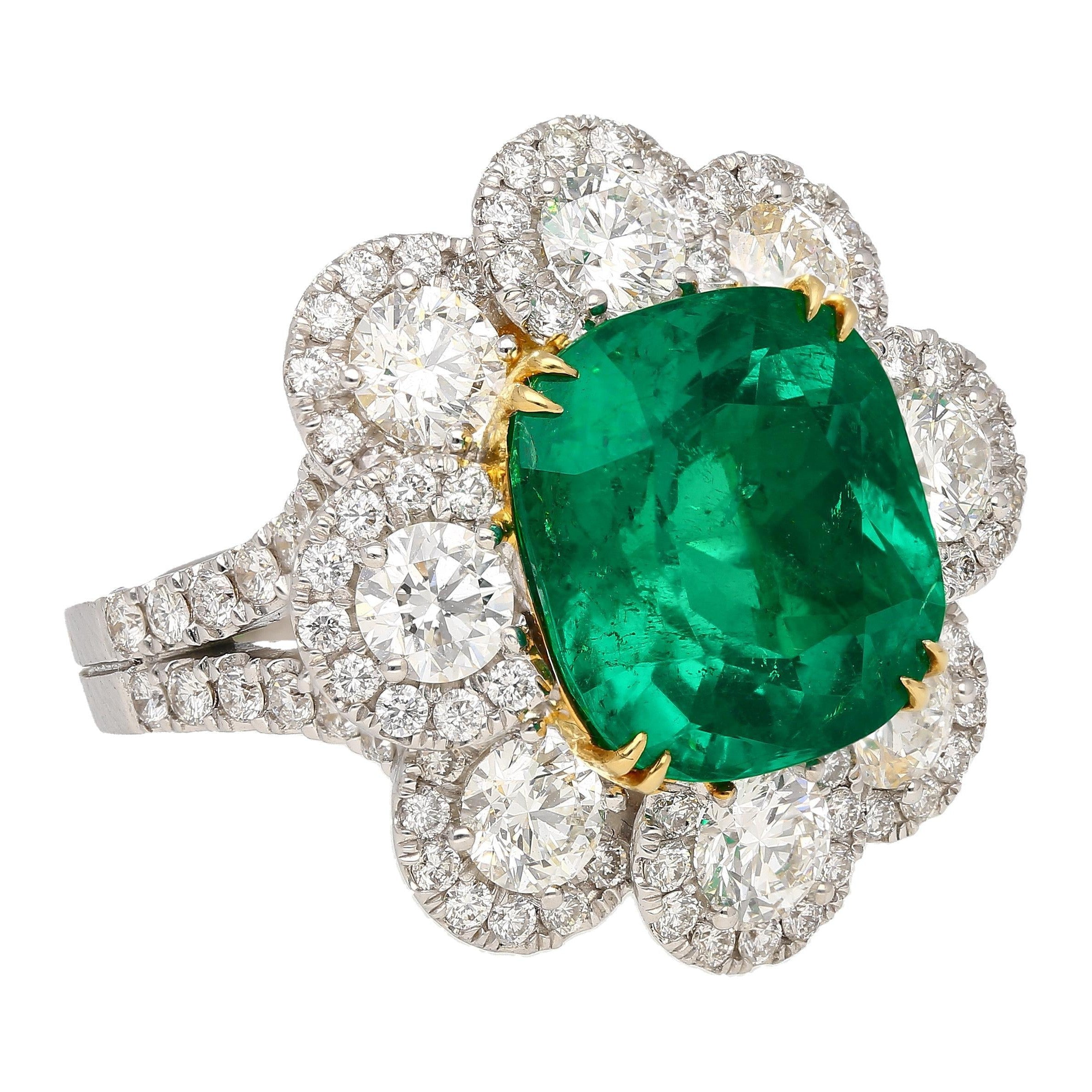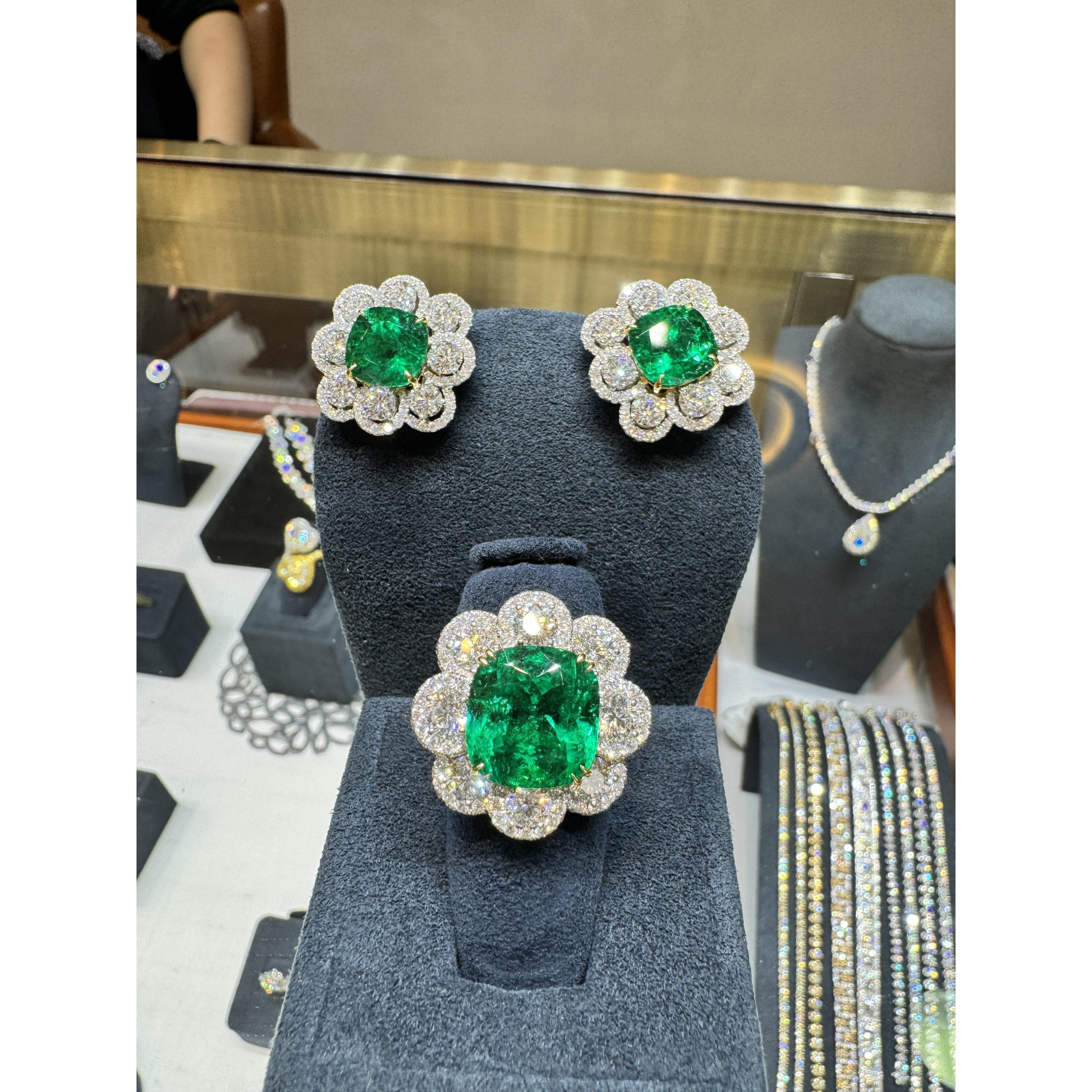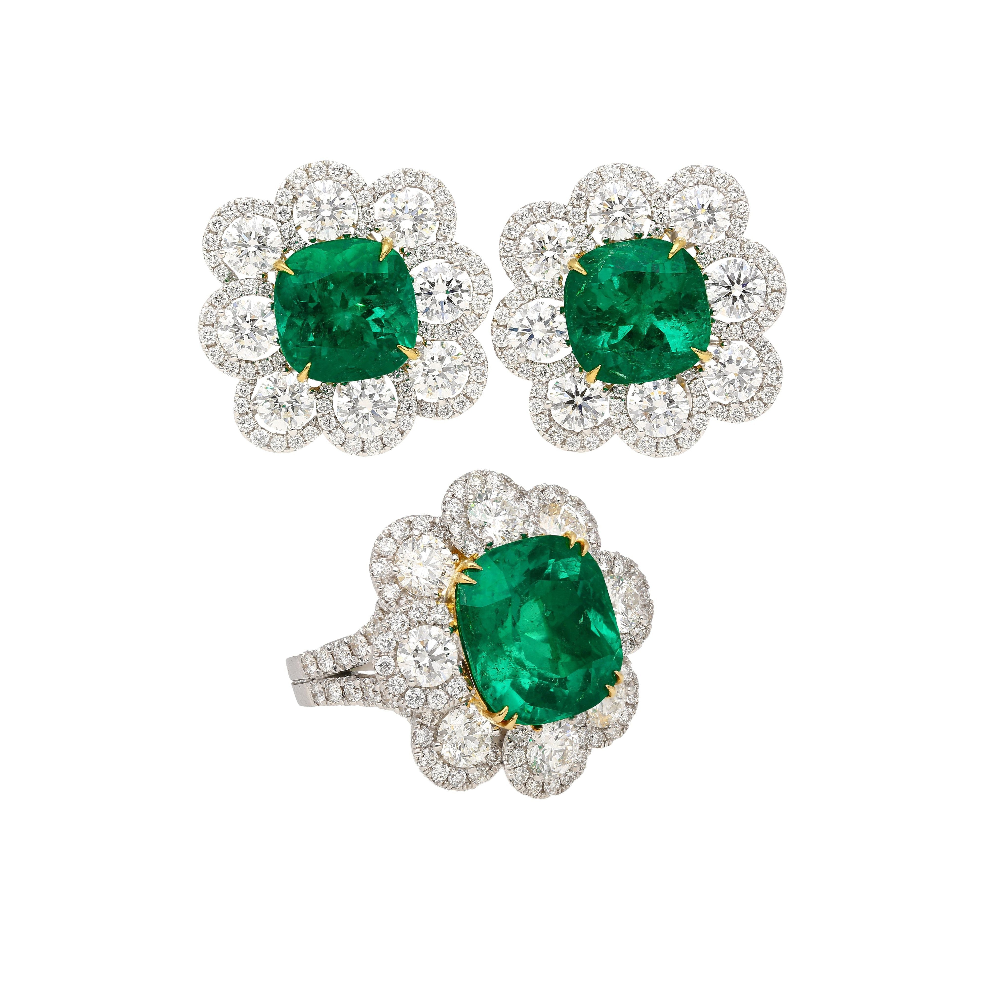 GRS certified Colombian emerald and diamond ring and earrings set crafted in 18K white and yellow gold. This set includes a cushion cut emerald ring and a matching pair of emerald and diamond earrings, all featuring vivid green Colombian emeralds with oil treatments ranging from none to insignificant.