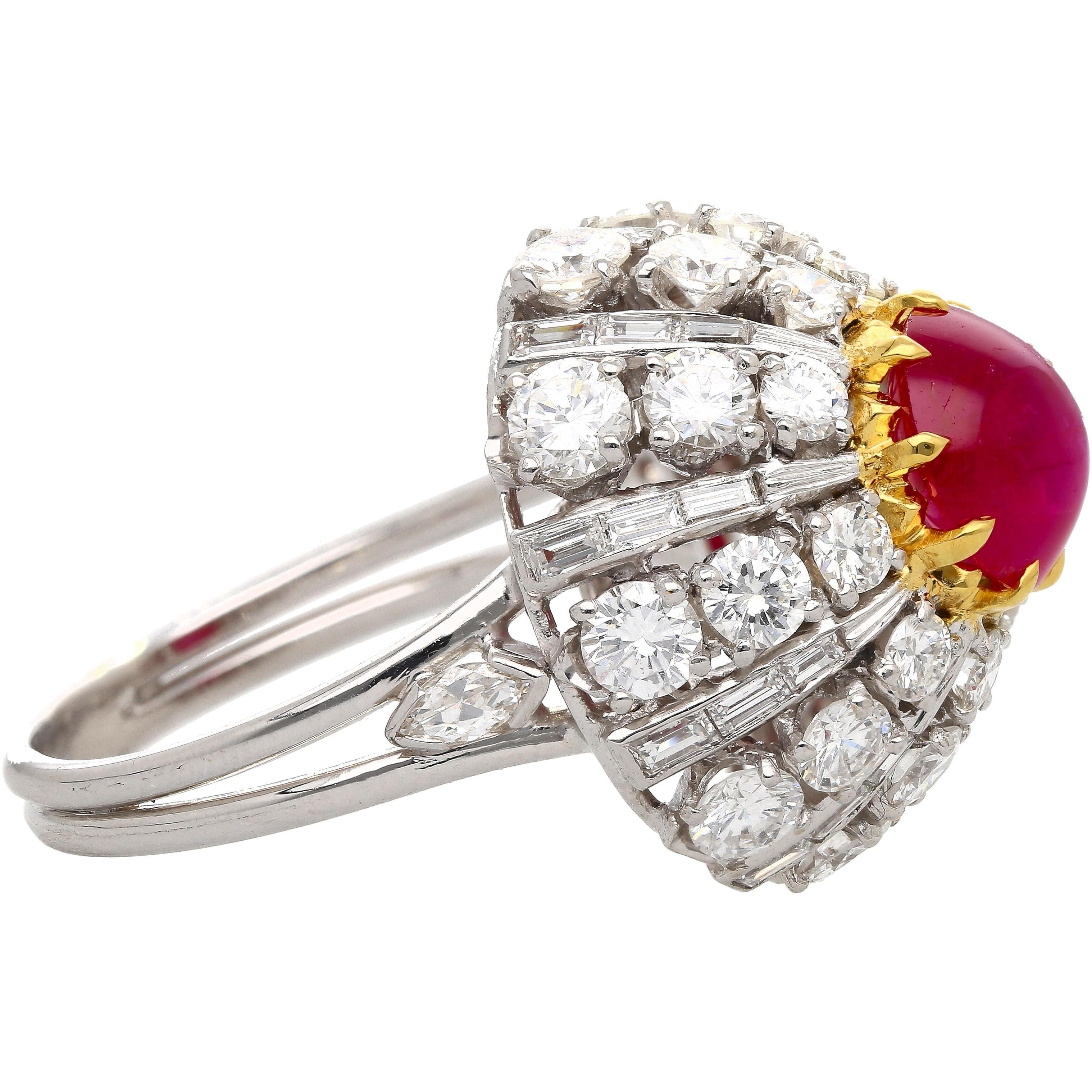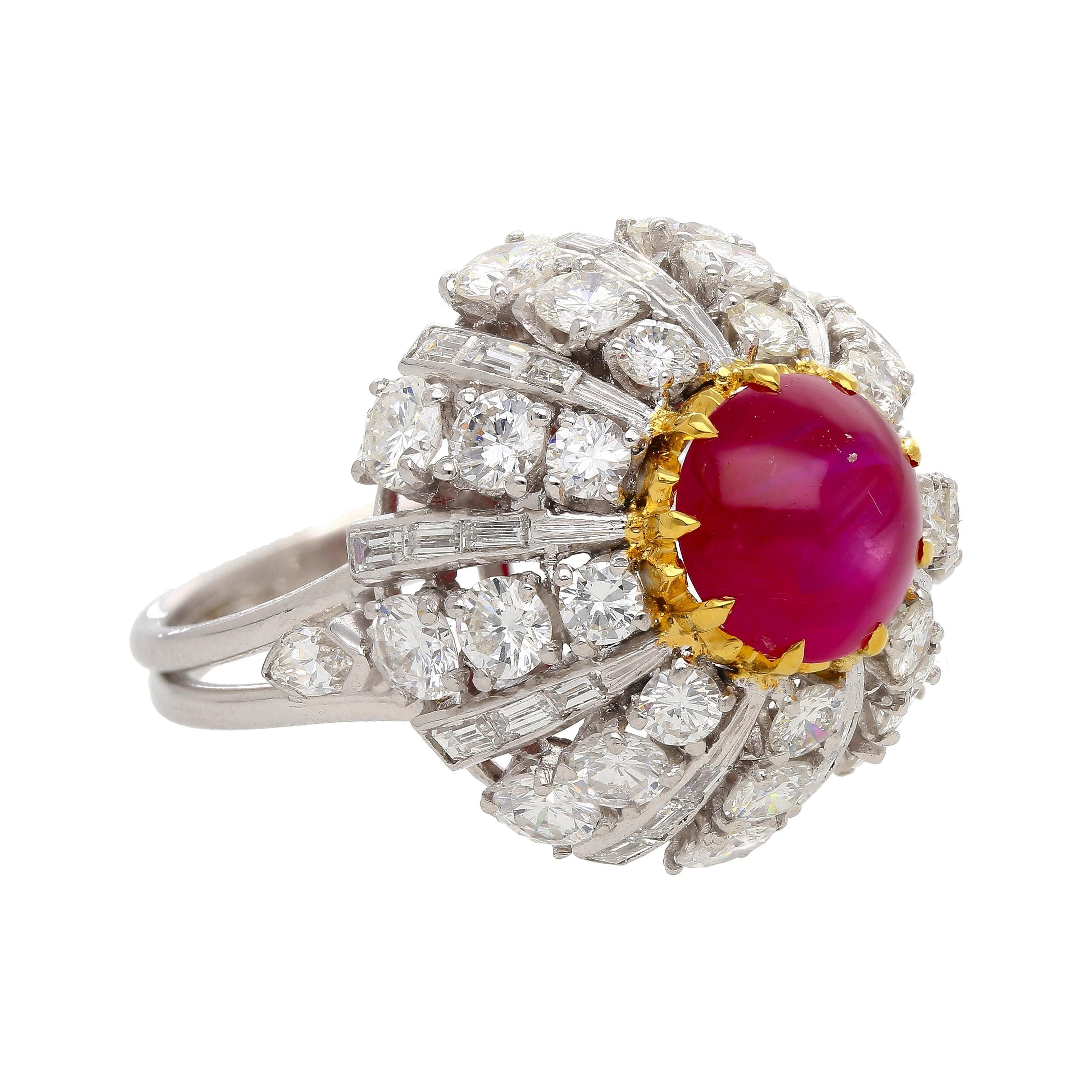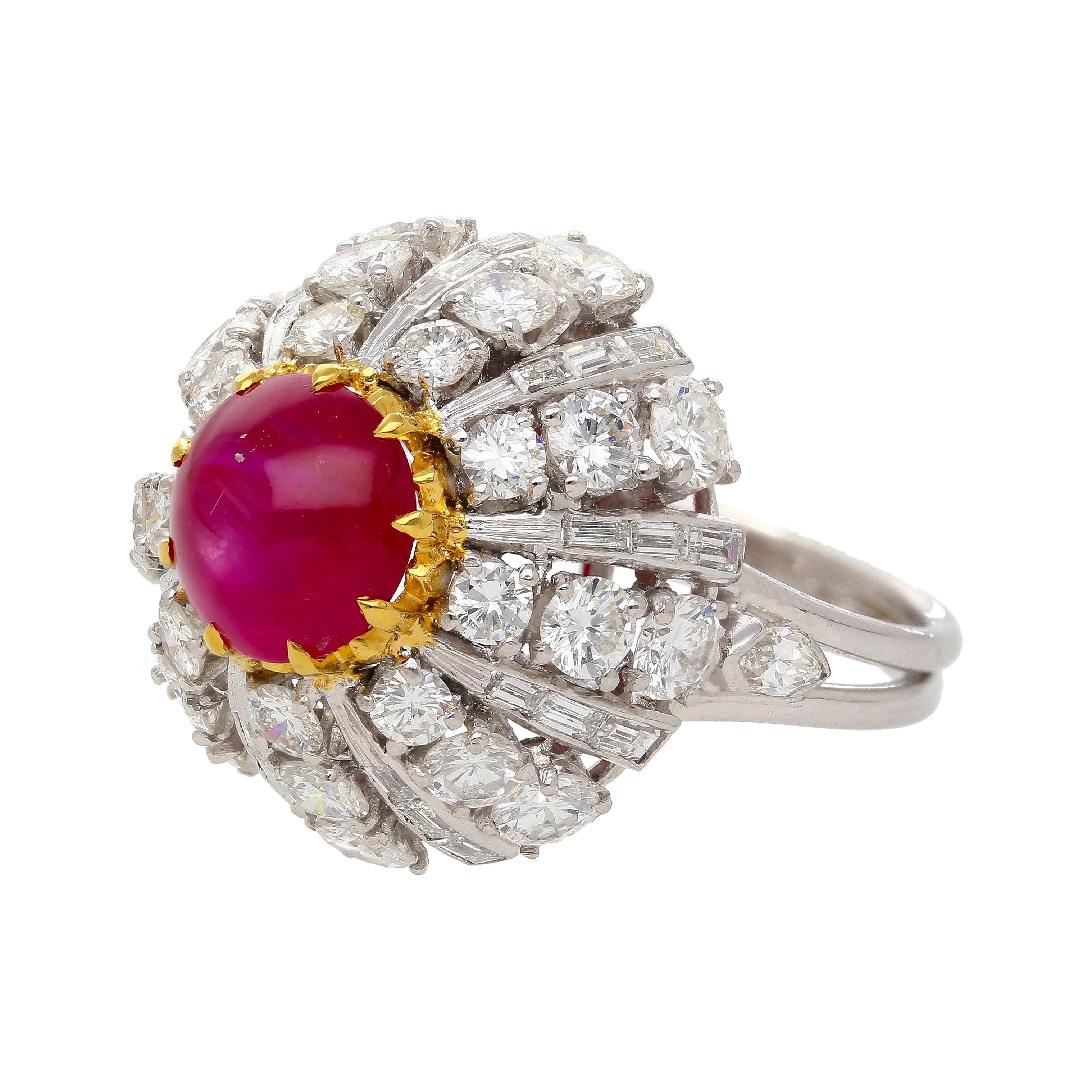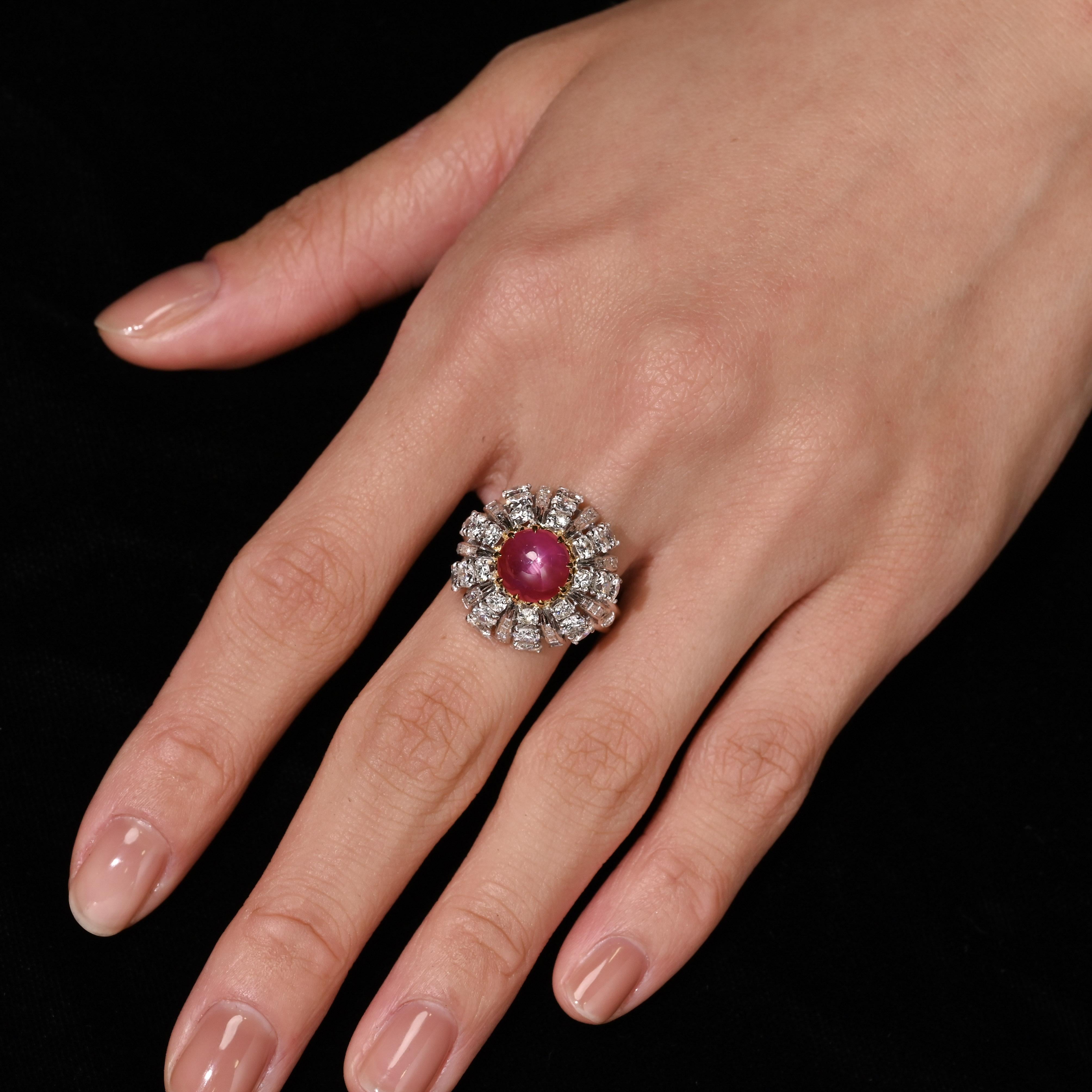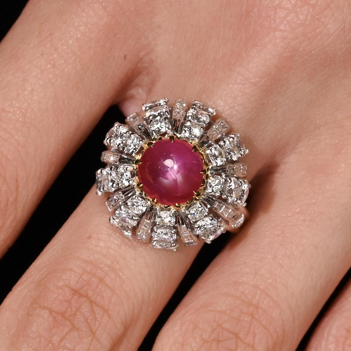 A collector’s masterpiece featuring a 3.04 carat no-heat Burmese Star Ruby with striking asterism, elegantly encircled by natural baguette and round diamonds in a handcrafted 18K white gold sunburst dome shank ring setting. A rare heirloom-grade investment piece.