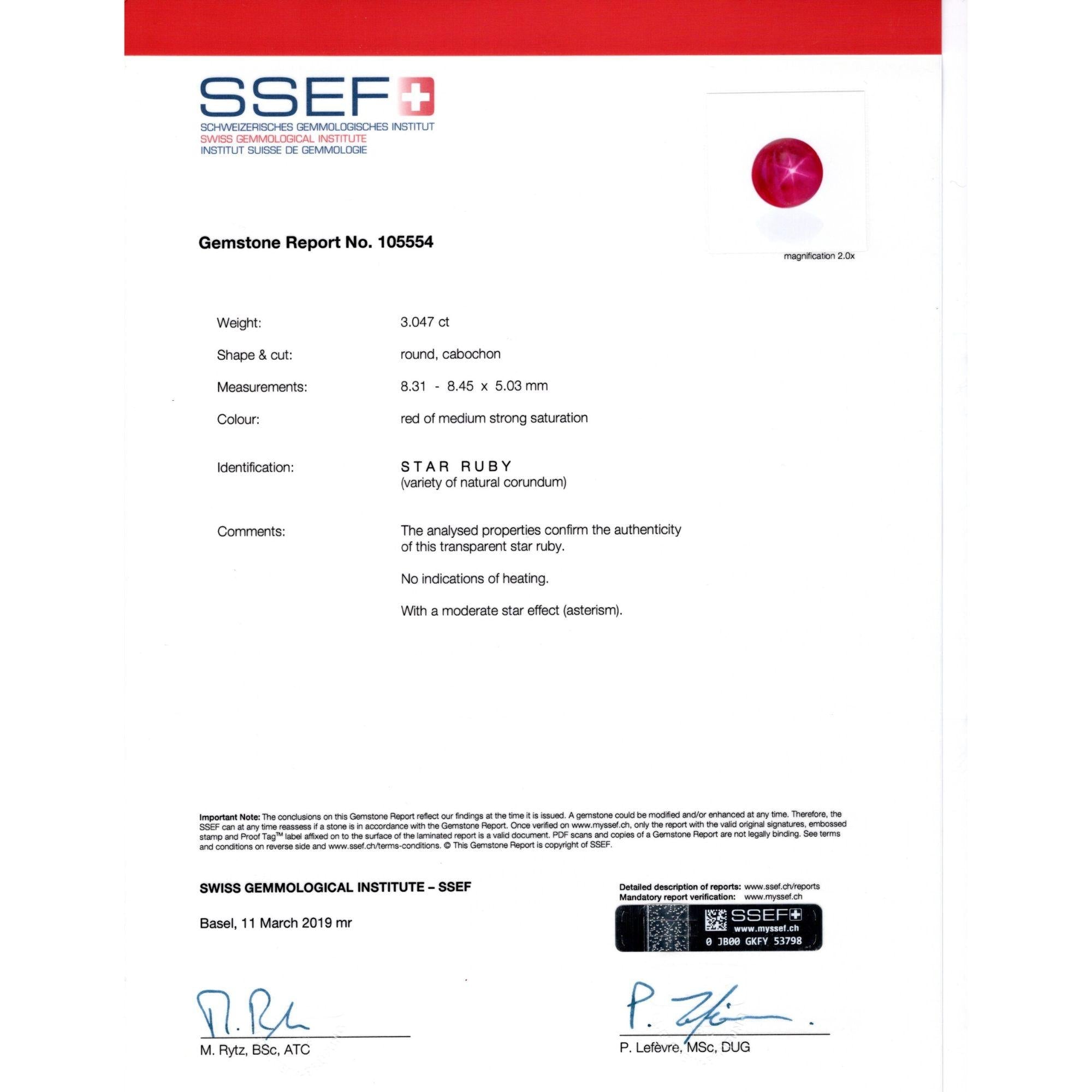 A luxurious collector’s treasure, this star ruby ring is not just rare, it's refined. At the heart of this handcrafted masterpiece lies a 3.04ct natural star ruby from Burma, certified by both AGL and SSEF as untreated and exhibiting a moderate, authentic asterism (star). This design draws inspiration from celestial elegance. The bold sunburst motif, formed through a combination of high-polish gold and step-cut diamond geometry, brings a regal yet modern aesthetic. A powerful statement piece ideal for collectors of rare gems or those seeking heirloom-level craftsmanship with certification-backed authenticity.