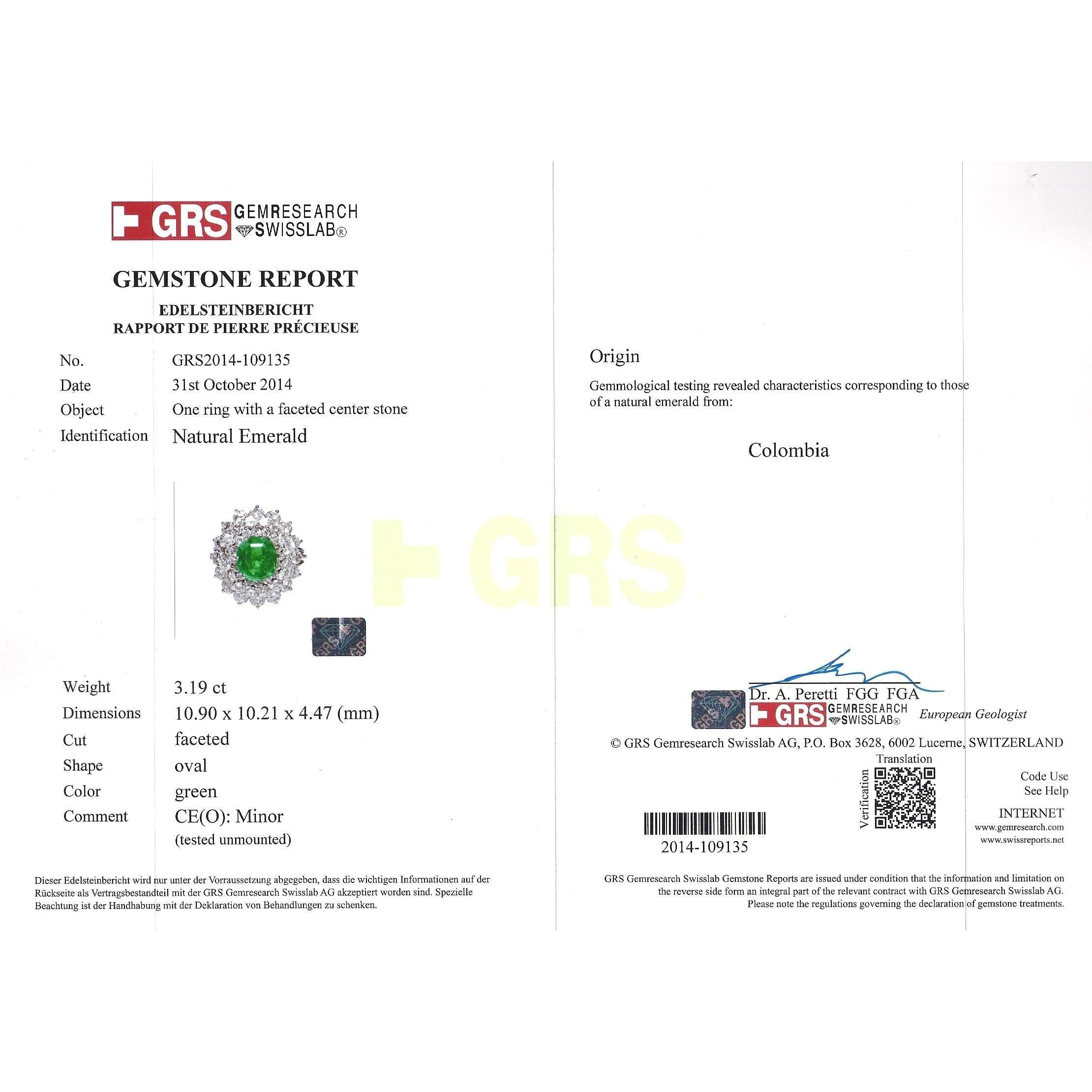 - Accompanied by GRS certification stating the emerald is natural, Colombian origin, oval cut, green color, and with minor oil treatment