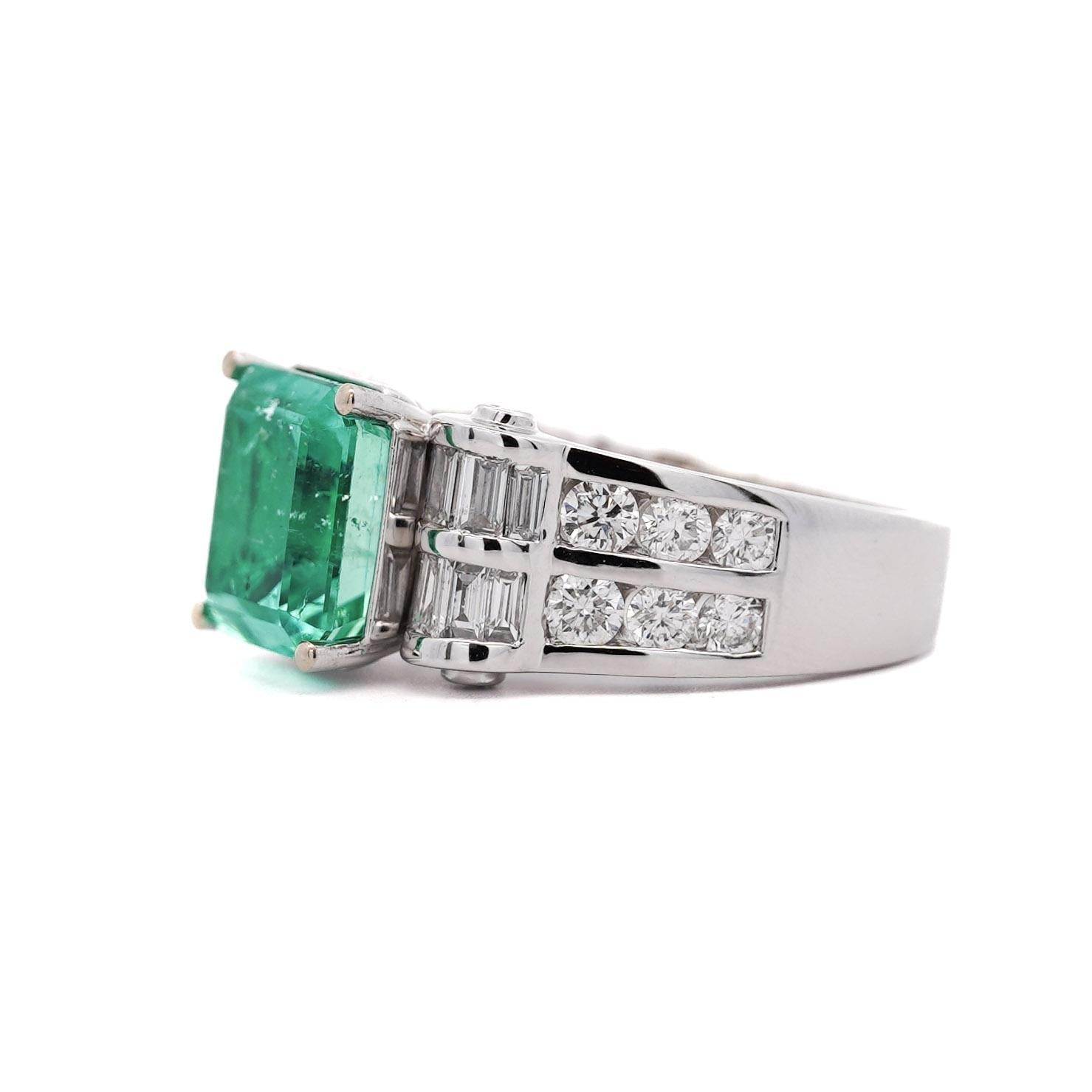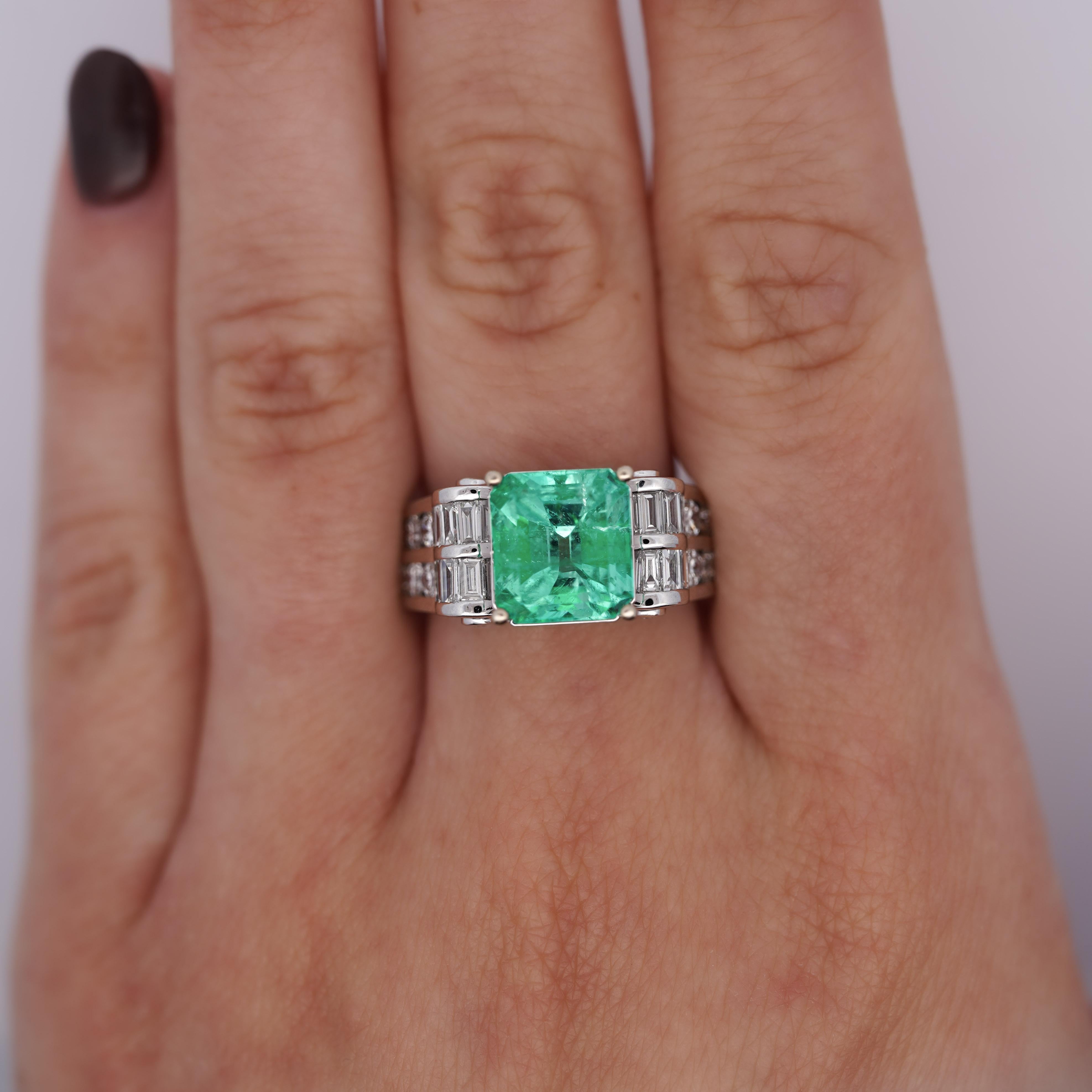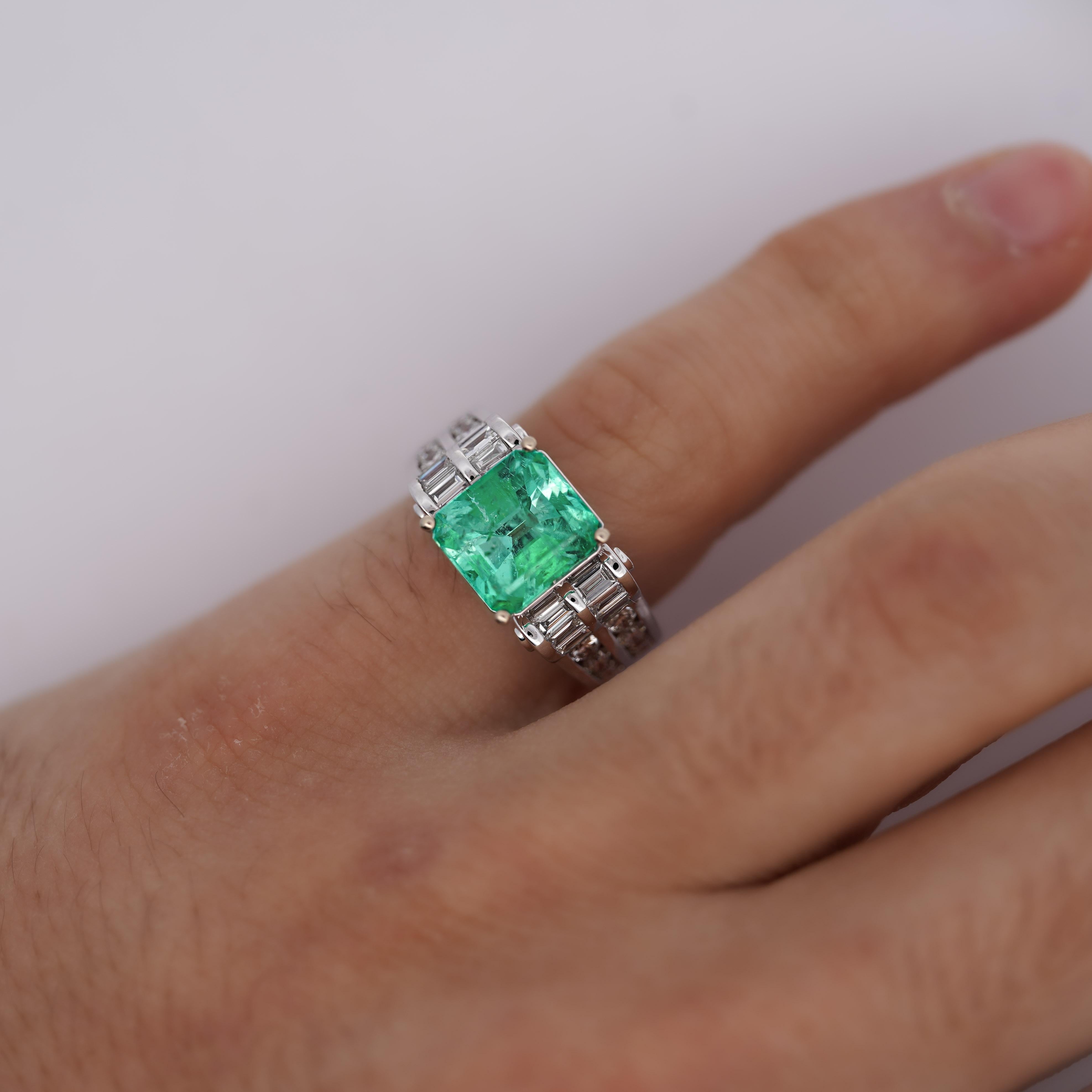 This one-of-a-kind cocktail ring is designed to turn heads. At its heart, a 4.17-carat Colombian emerald glows with a rich, natural presence, enhanced by its expertly cut facets. A shimmering array of baguette and round diamonds frame the centerpiece, creating a striking contrast against the sleek 14K white gold setting. The bold 8mm band gives it a structured, statement look while maintaining a refined balance. Every detail—from the precise craftsmanship to the emerald’s color, luster, and unmistakable origin—makes this piece an exquisite addition to any collection.