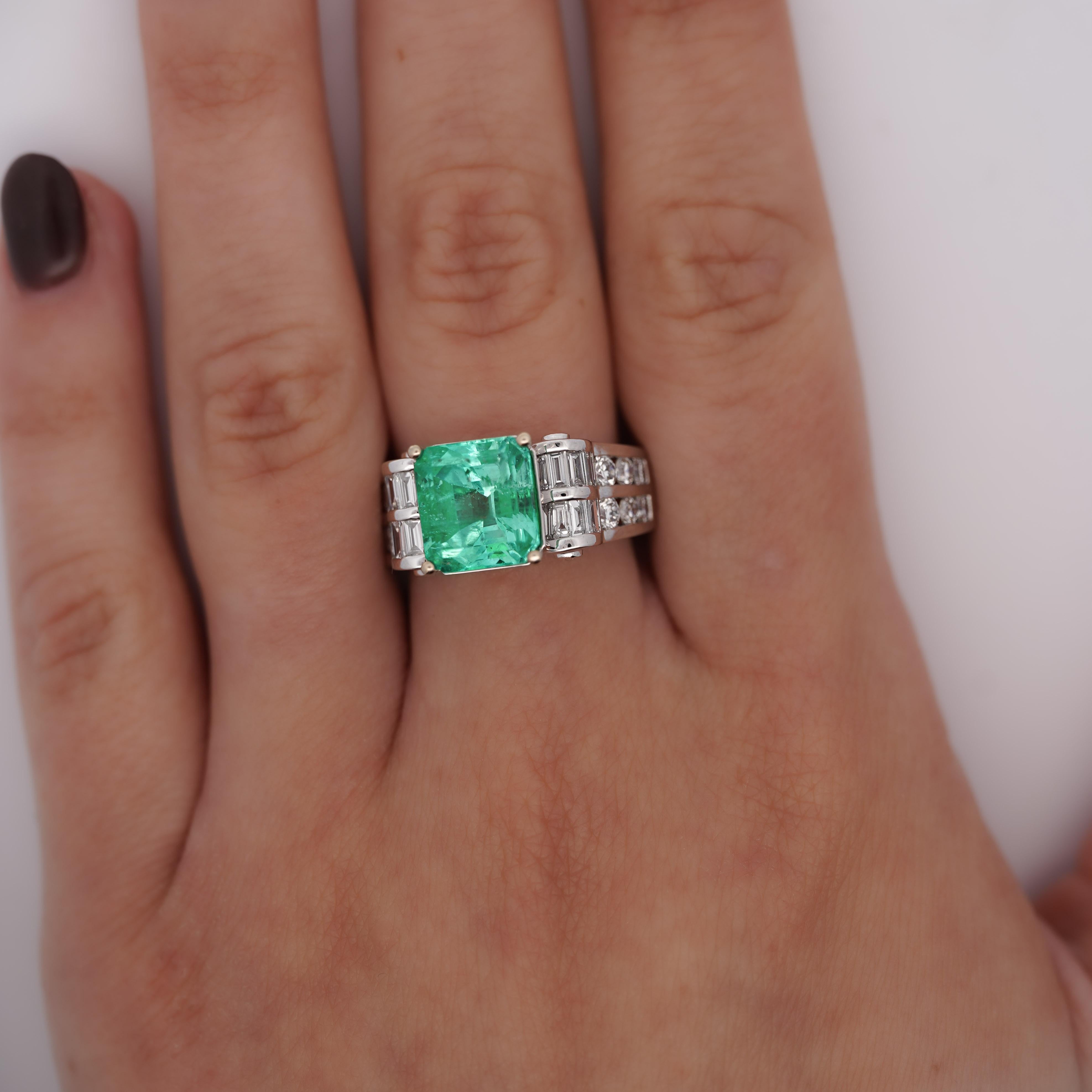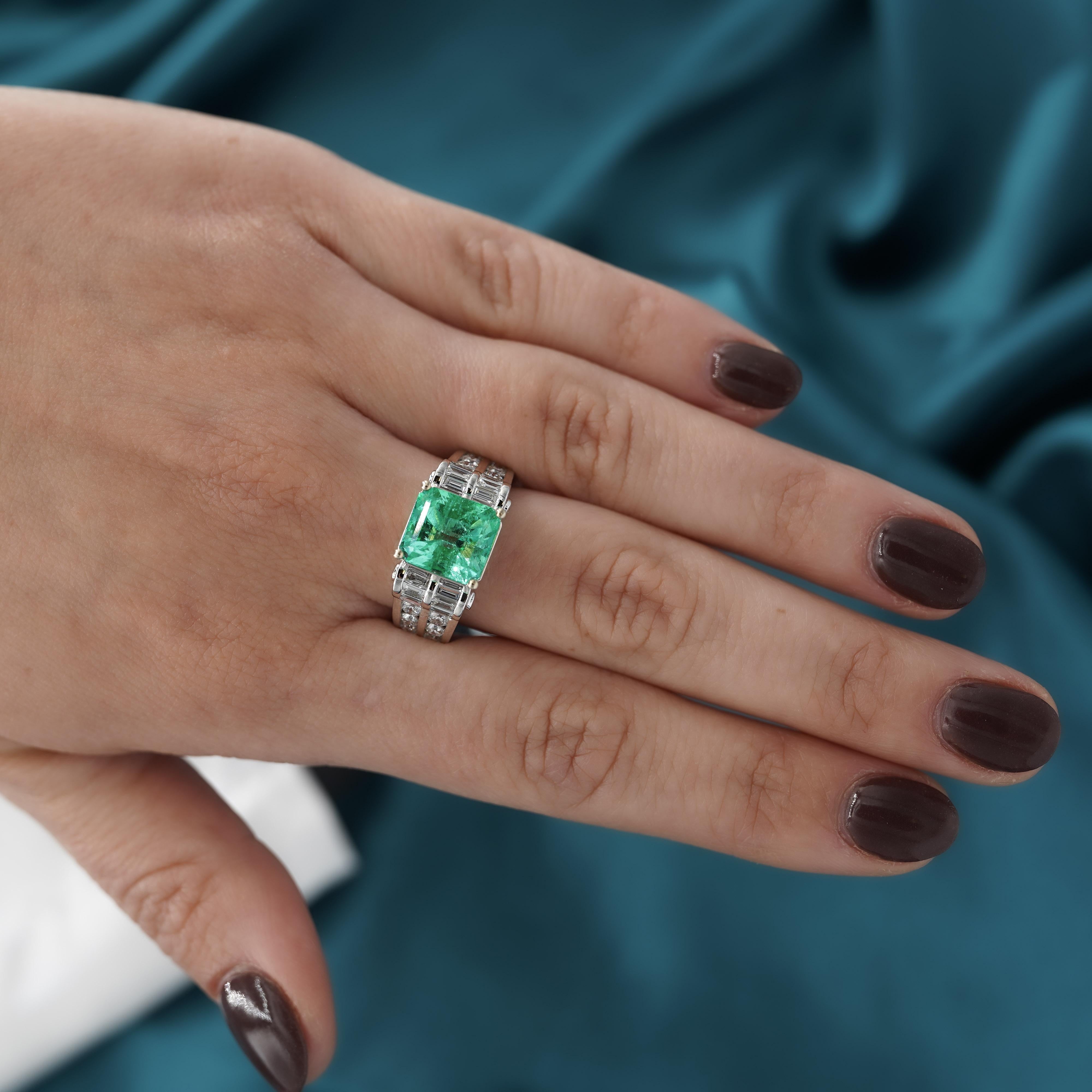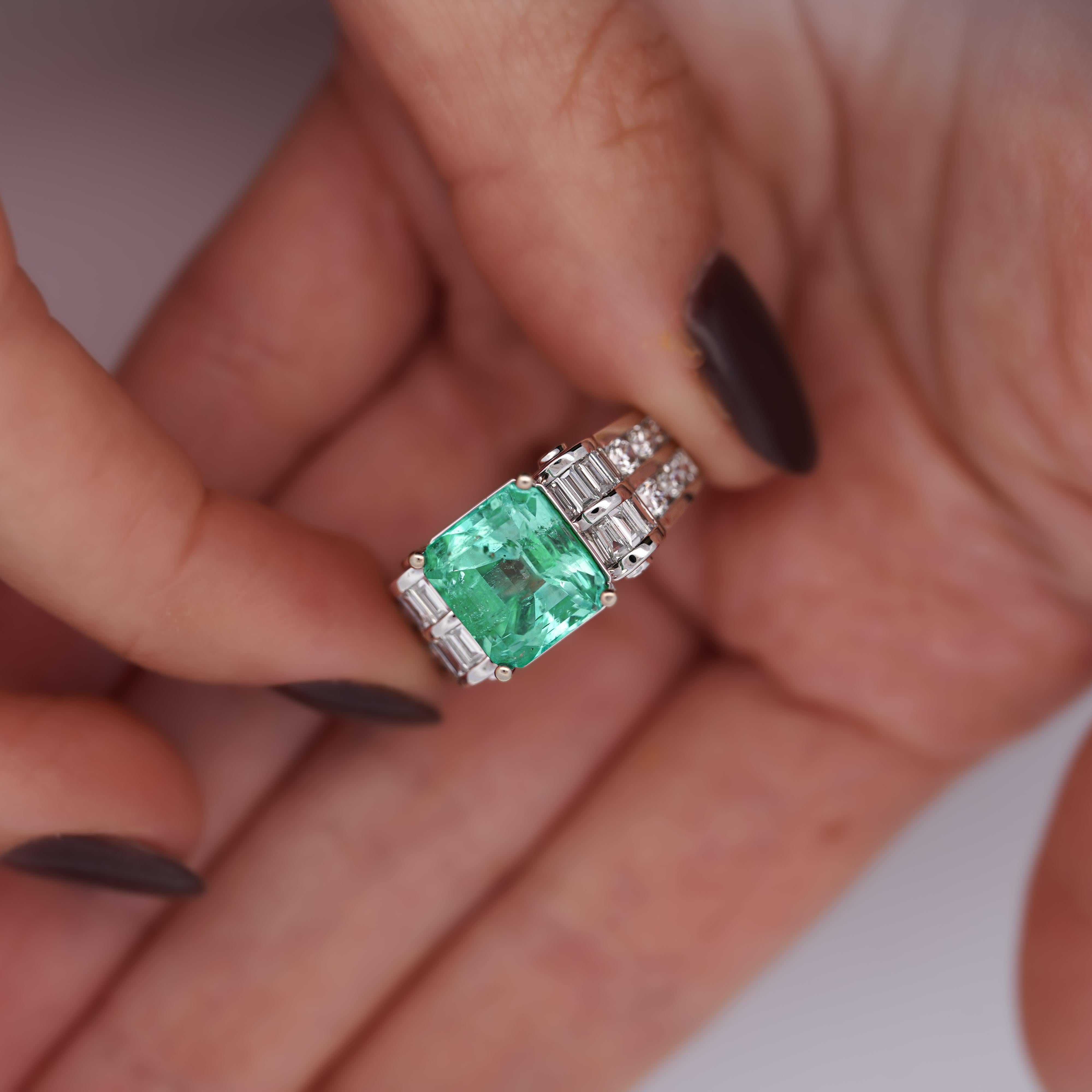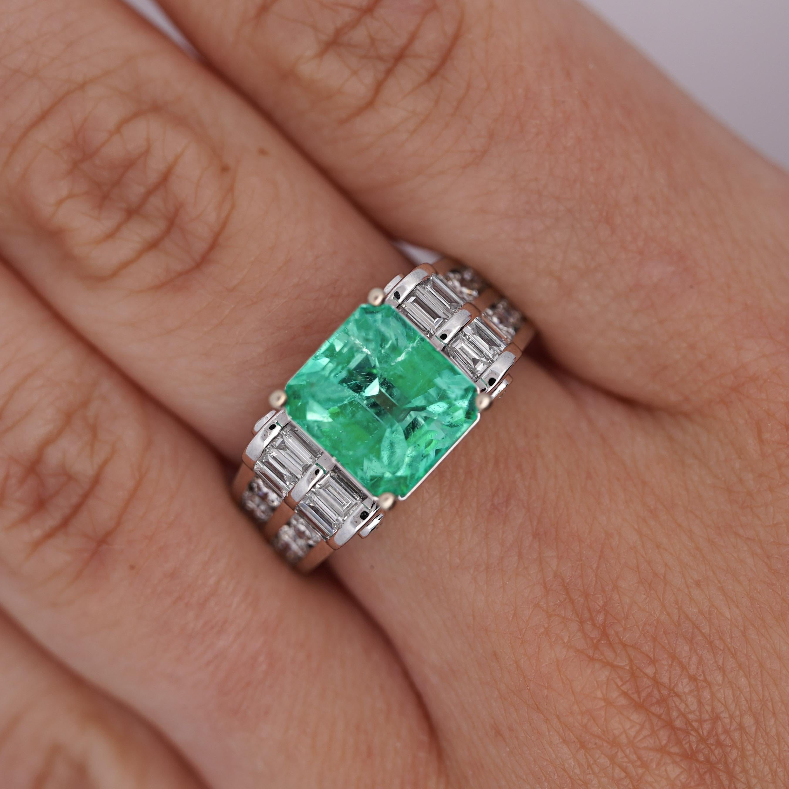 This one-of-a-kind cocktail ring is designed to turn heads. At its heart, a 4.17-carat Colombian emerald glows with a rich, natural presence, enhanced by its expertly cut facets. A shimmering array of baguette and round diamonds frame the centerpiece, creating a striking contrast against the sleek 14K white gold setting. The bold 8mm band gives it a structured, statement look while maintaining a refined balance. Every detail—from the precise craftsmanship to the emerald’s color, luster, and unmistakable origin—makes this piece an exquisite addition to any collection.