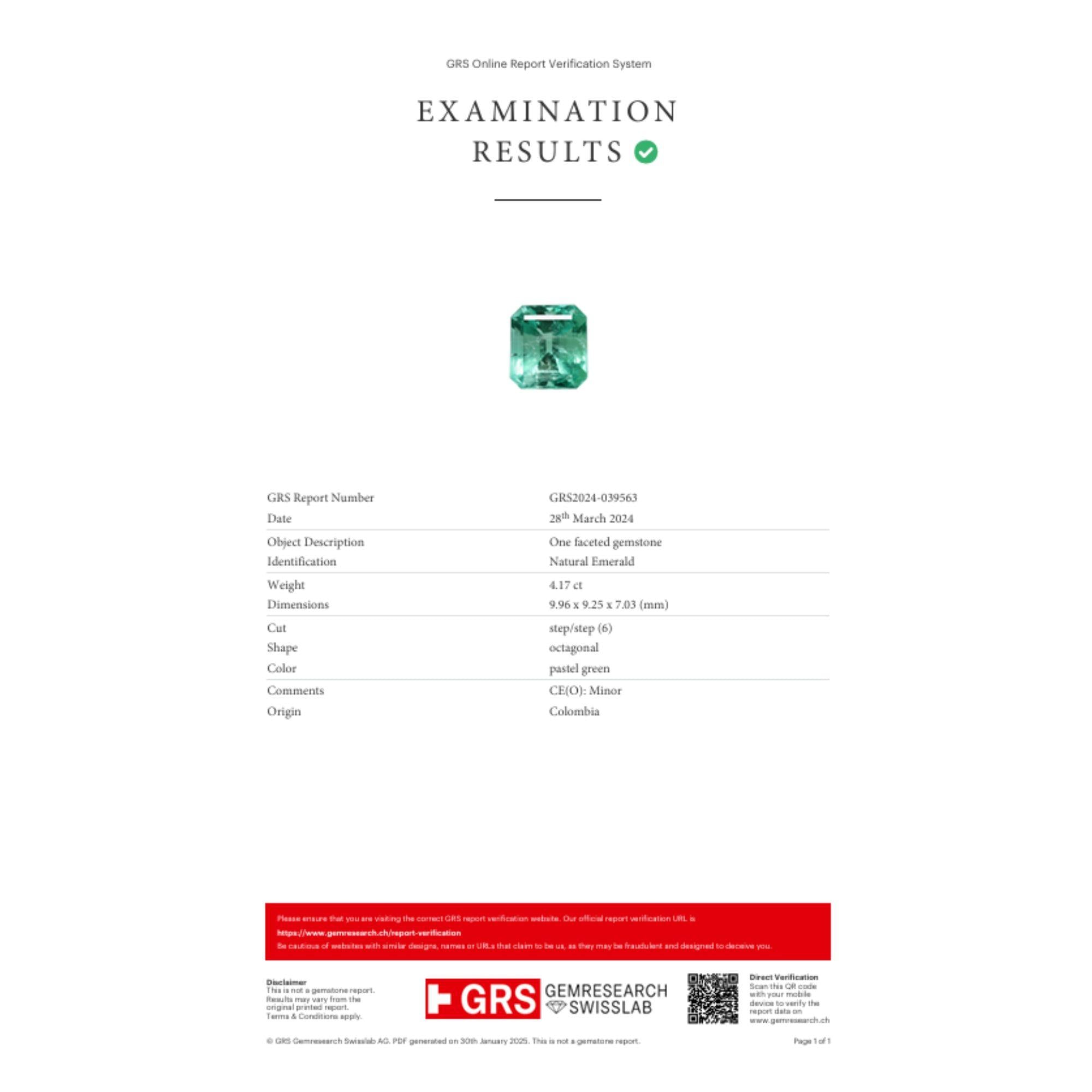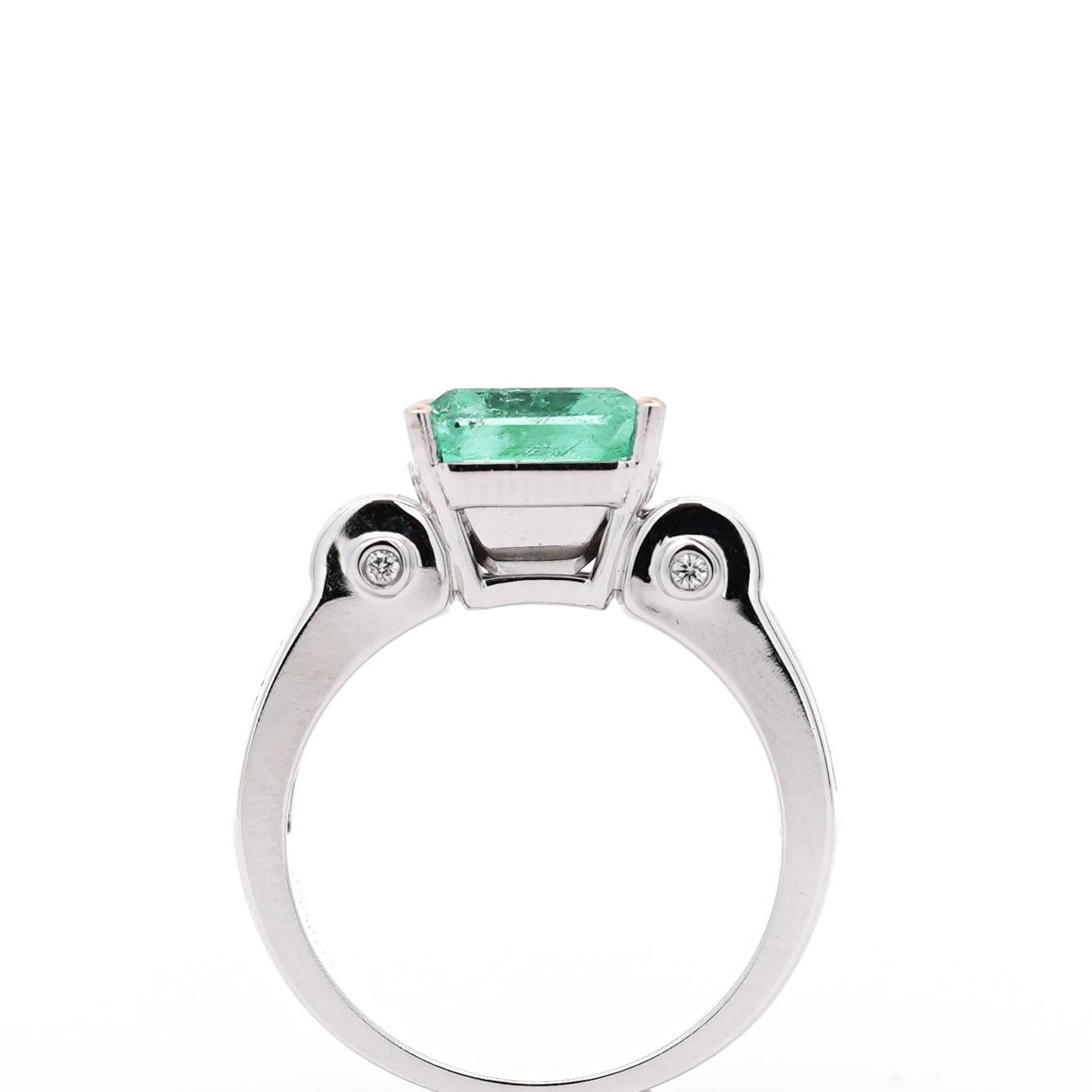 The emerald center stone bear incredible luster, with a pastel yellowish green color that's unmistakably of Colombian origin. The Gem displays very good clarity, with a rich, deep color and brilliance that's noticeably valuable - all with minor oil treatment, which is quite rare for an emerald of this color, brilliance and size.