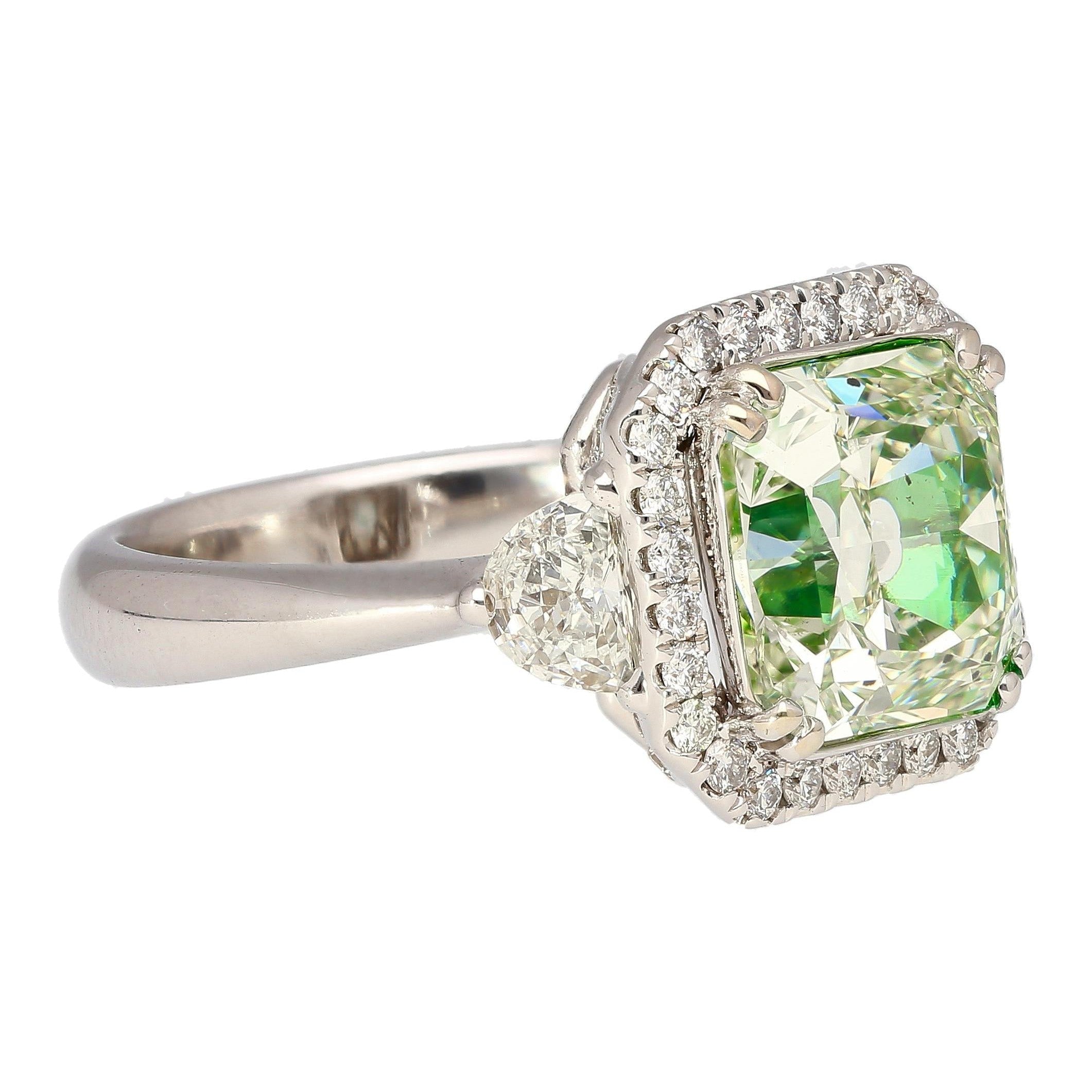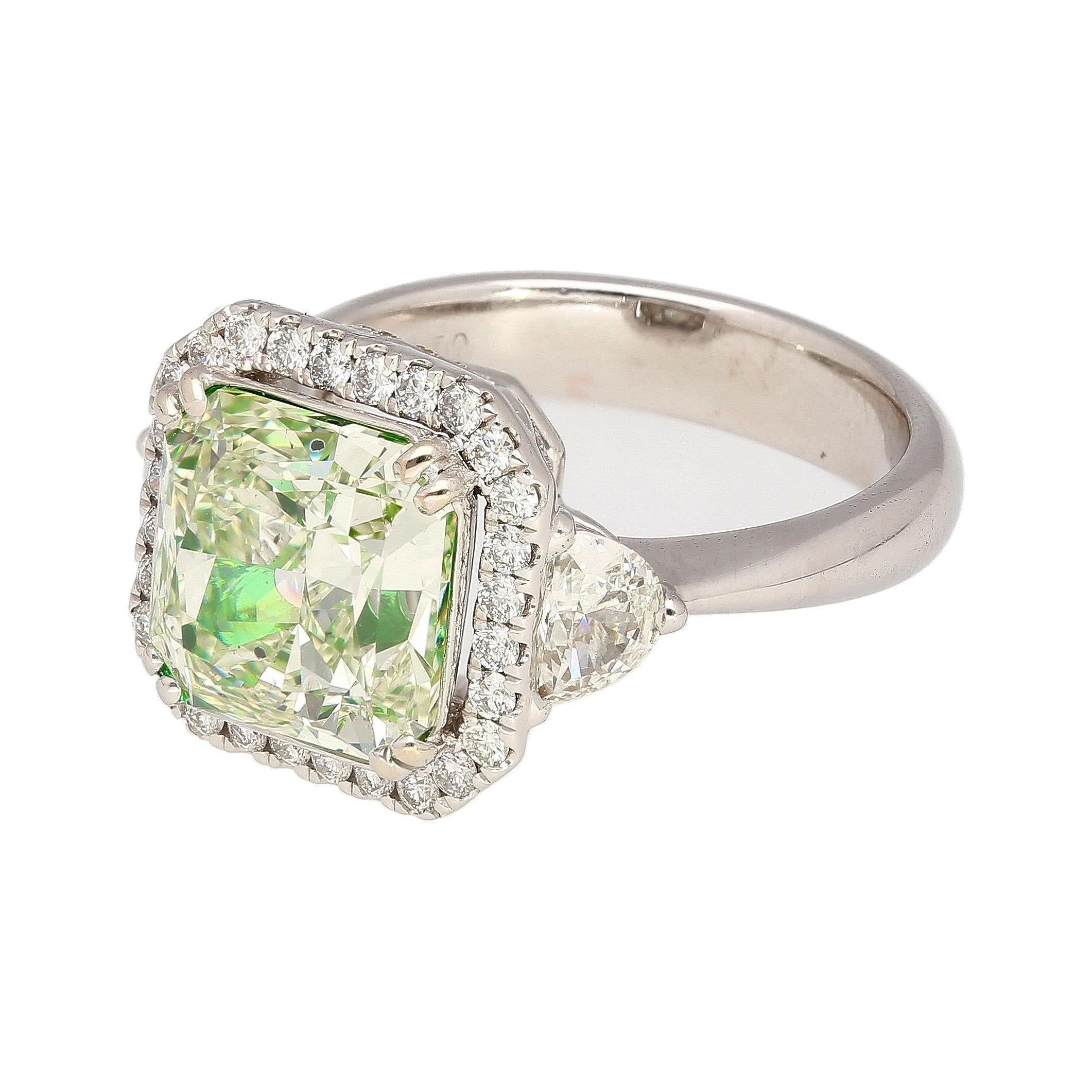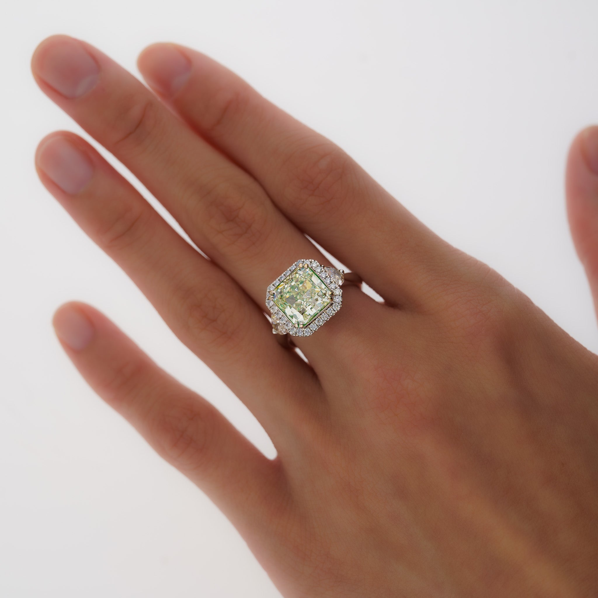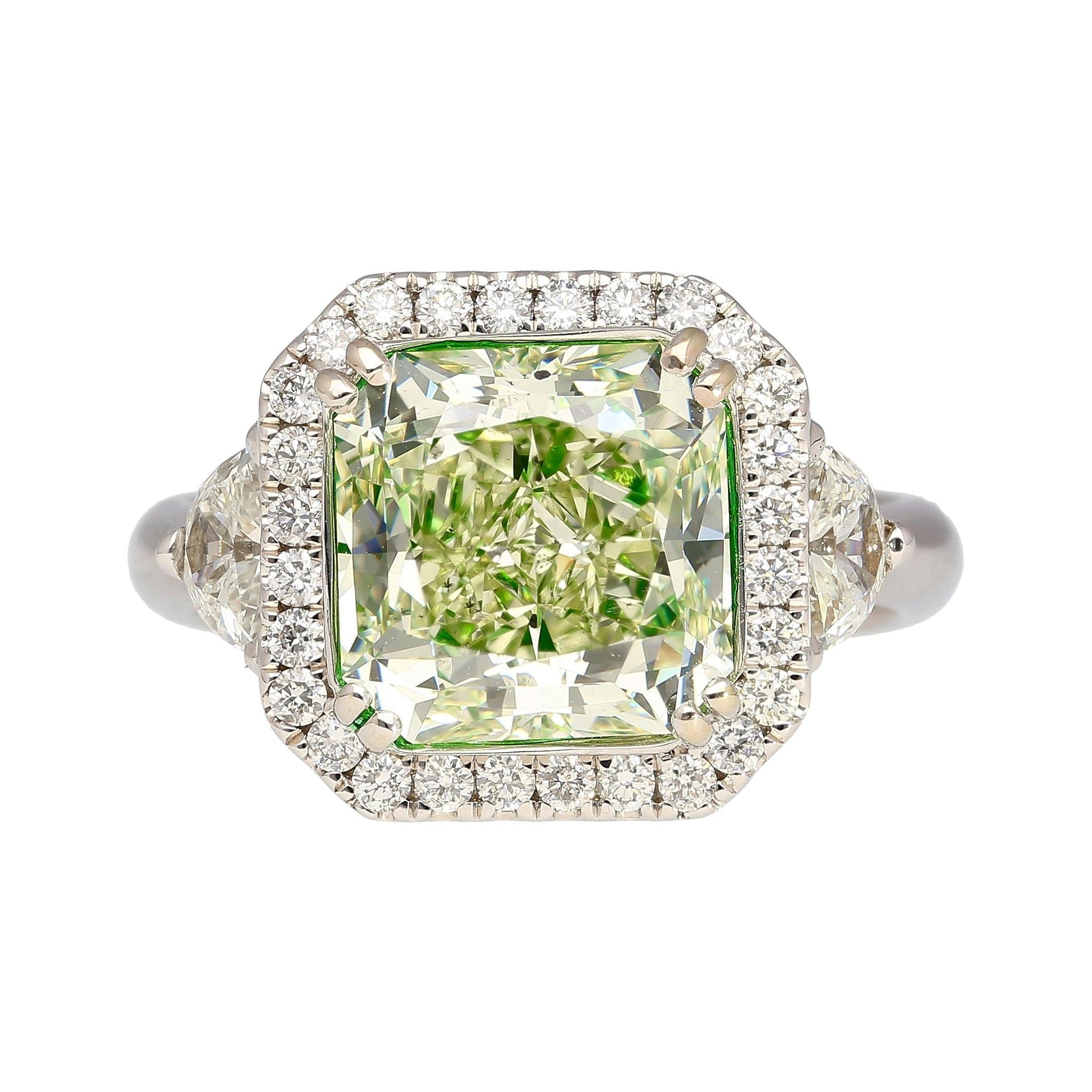 4.26 Carat Radiant Cut Fancy Yellowish Green SI1 Clarity Diamond Ring