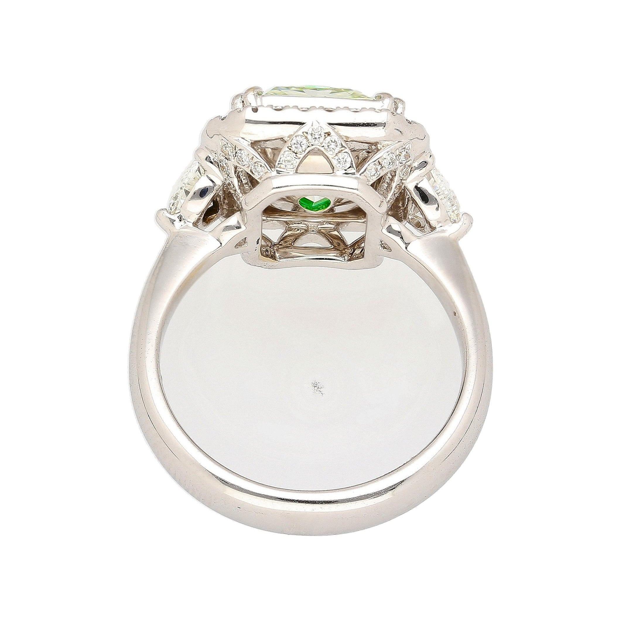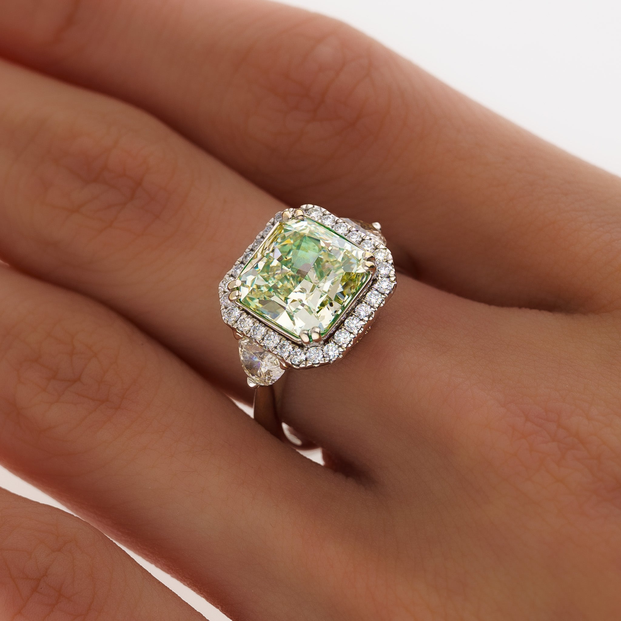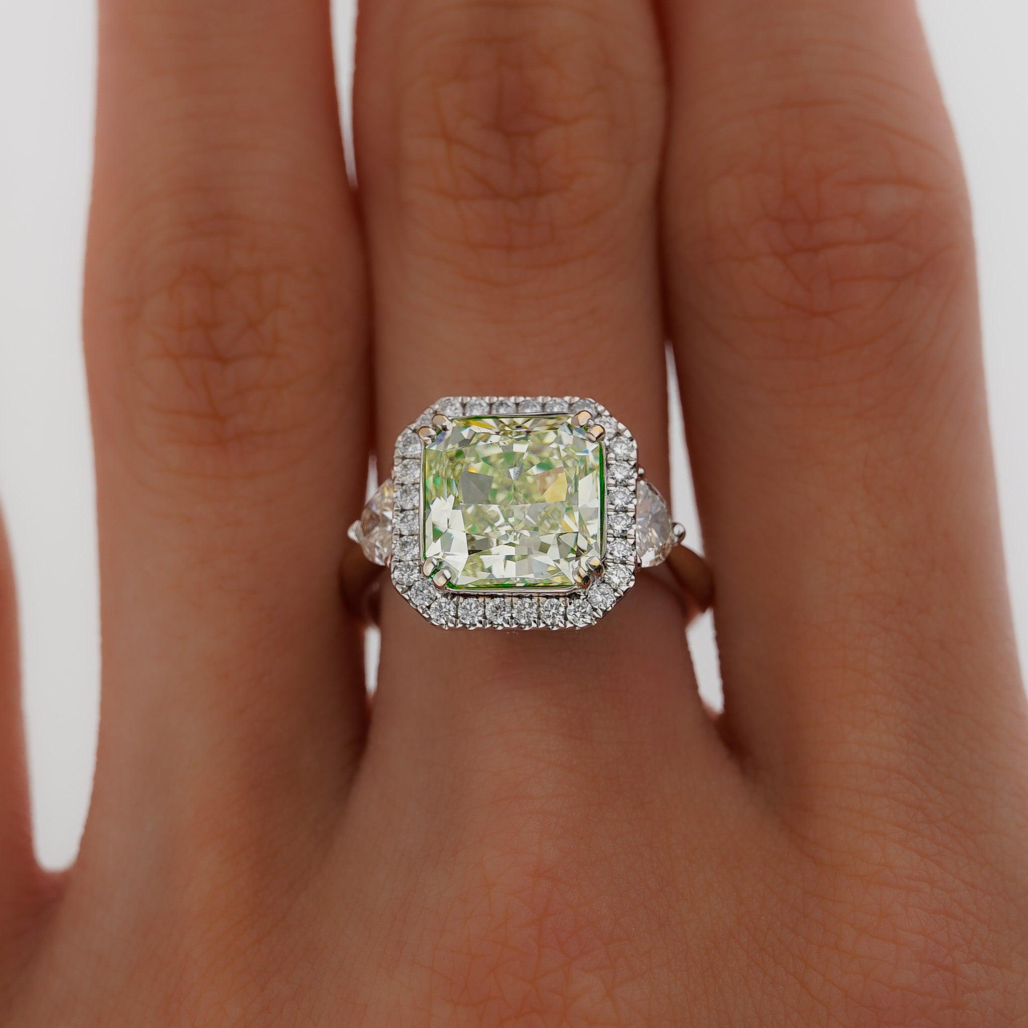 4.26 Carat Radiant Cut Fancy Yellowish Green SI1 Clarity Diamond Ring
