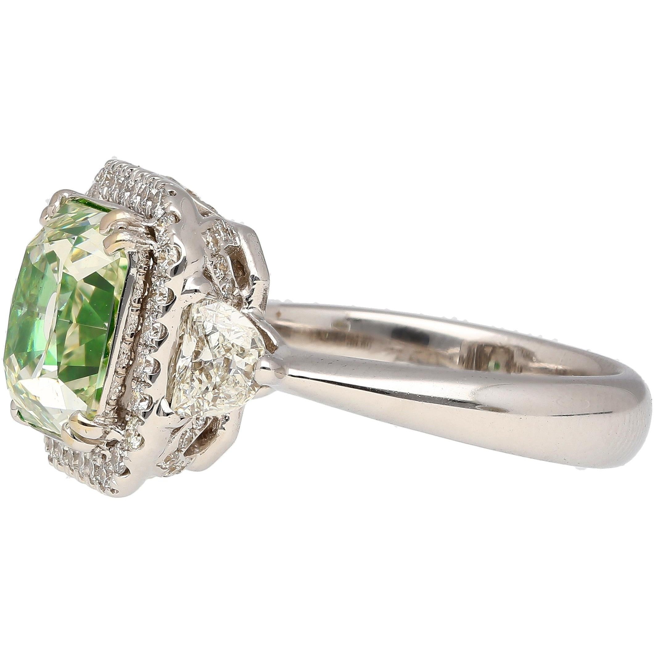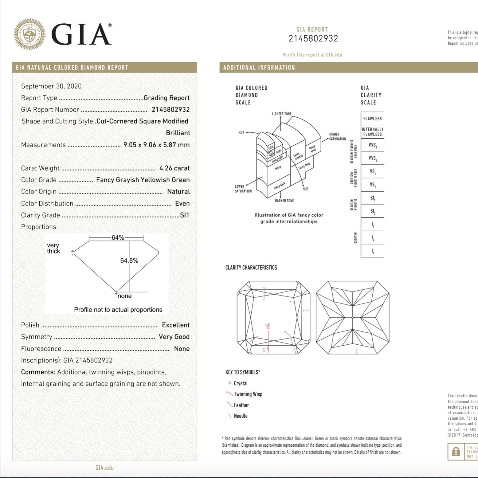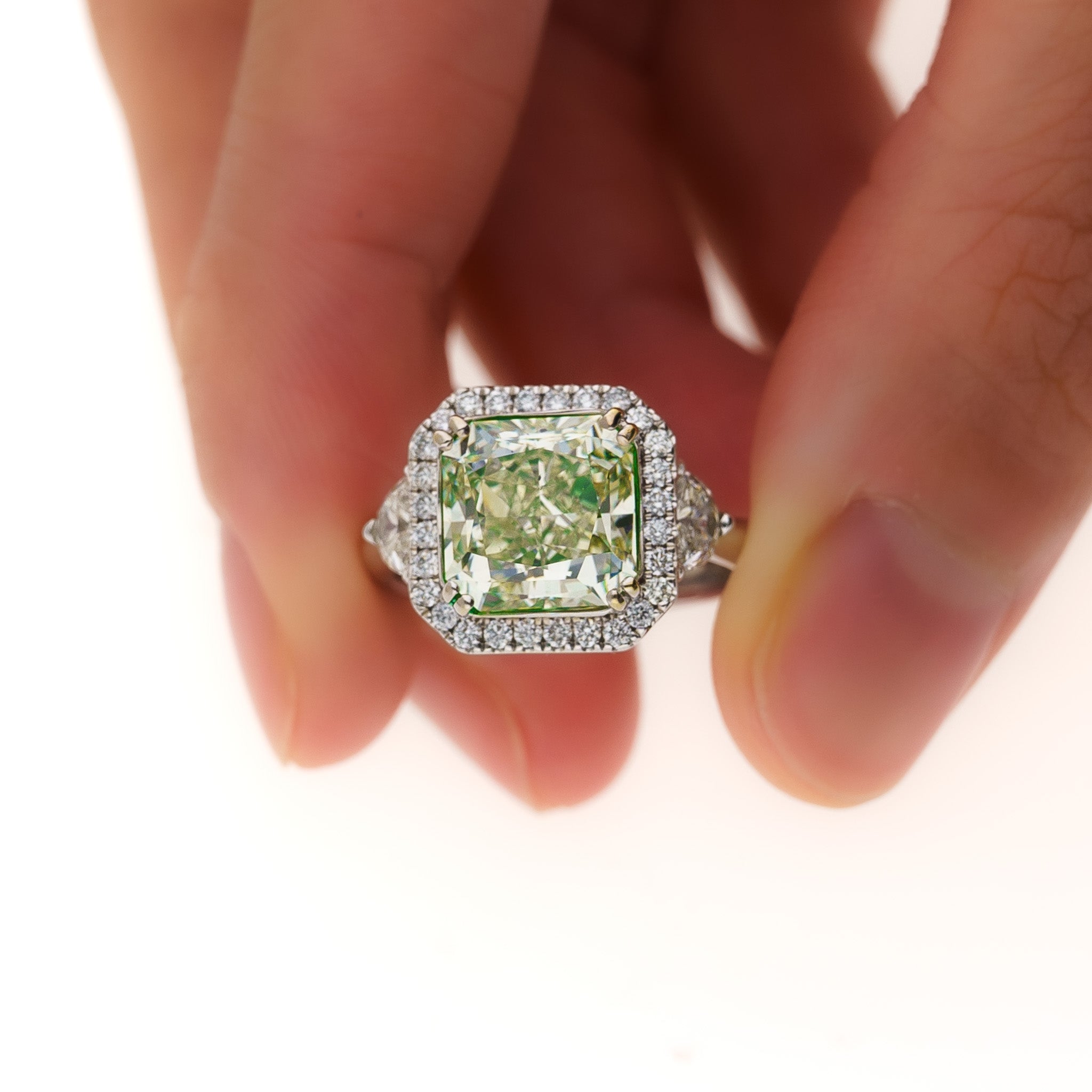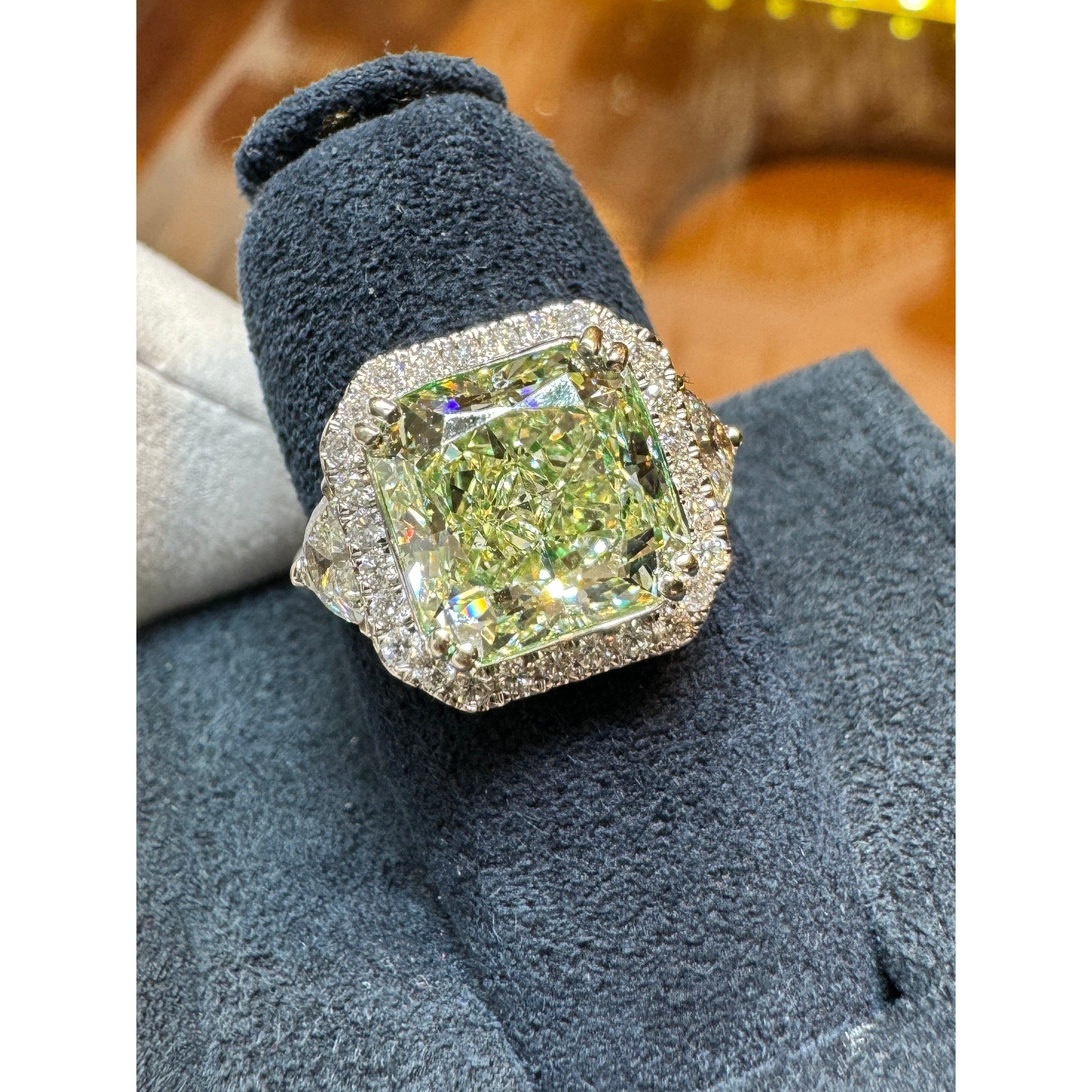 4.26 Carat Radiant Cut Fancy Yellowish Green SI1 Clarity Diamond Ring