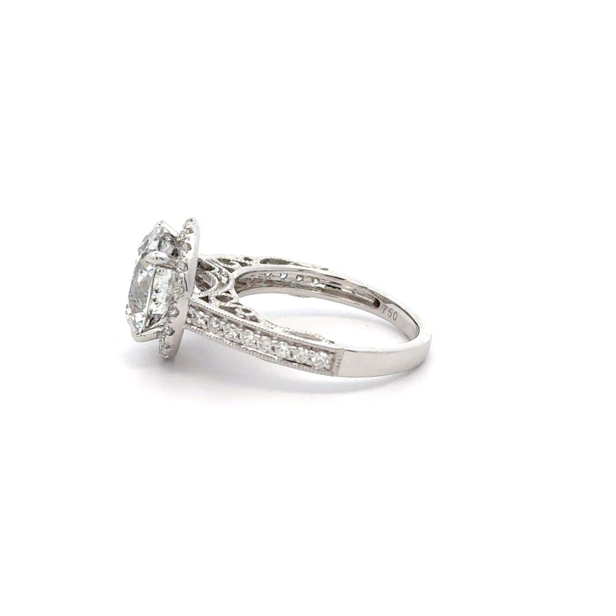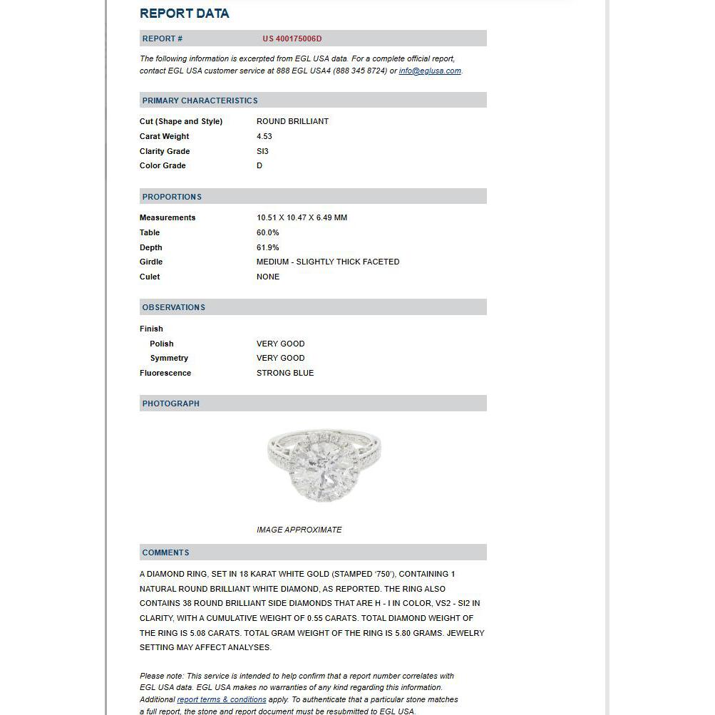 EGL Certified 4.53 Carat Round Cut Natural Diamond 18K White Gold Floral Shank and Round Halo Engagement Ring.