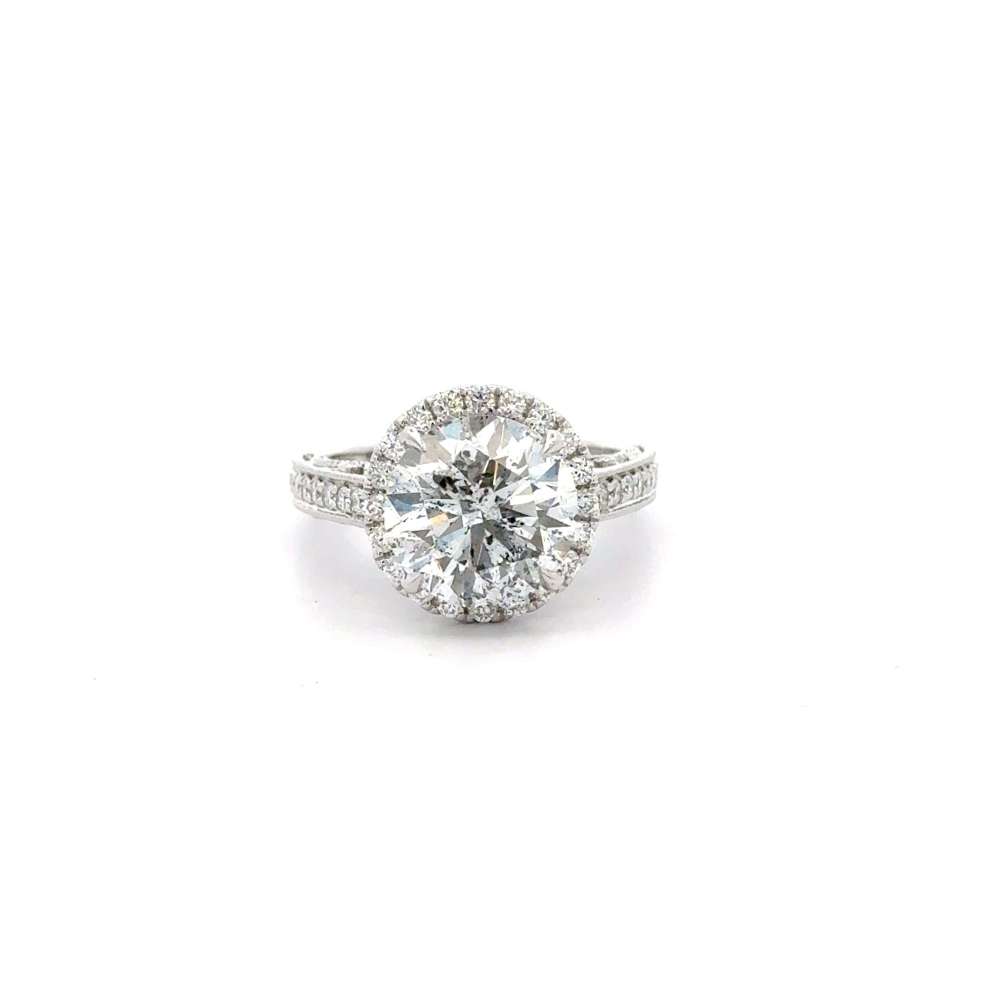 This exquisite engagement ring showcases a 4.53-carat natural round brilliant-cut diamond, certified by EGL (European Gemological Laboratory). Graded SI3 for clarity and D for color, this diamond radiates exceptional brilliance and purity. Set in 18K white gold, the ring combines modern sophistication with vintage-inspired detailing, highlighted by intricate filigree work along the band. Accentuating the central diamond are 38 round brilliant-cut side stones, collectively weighing 0.55 carats, graded H-I for color and VS2-SI2 for clarity. These side stones add a delicate sparkle, enhancing the overall allure of the ring. The band features a milgrain texture, adding a timeless touch to this masterpiece.