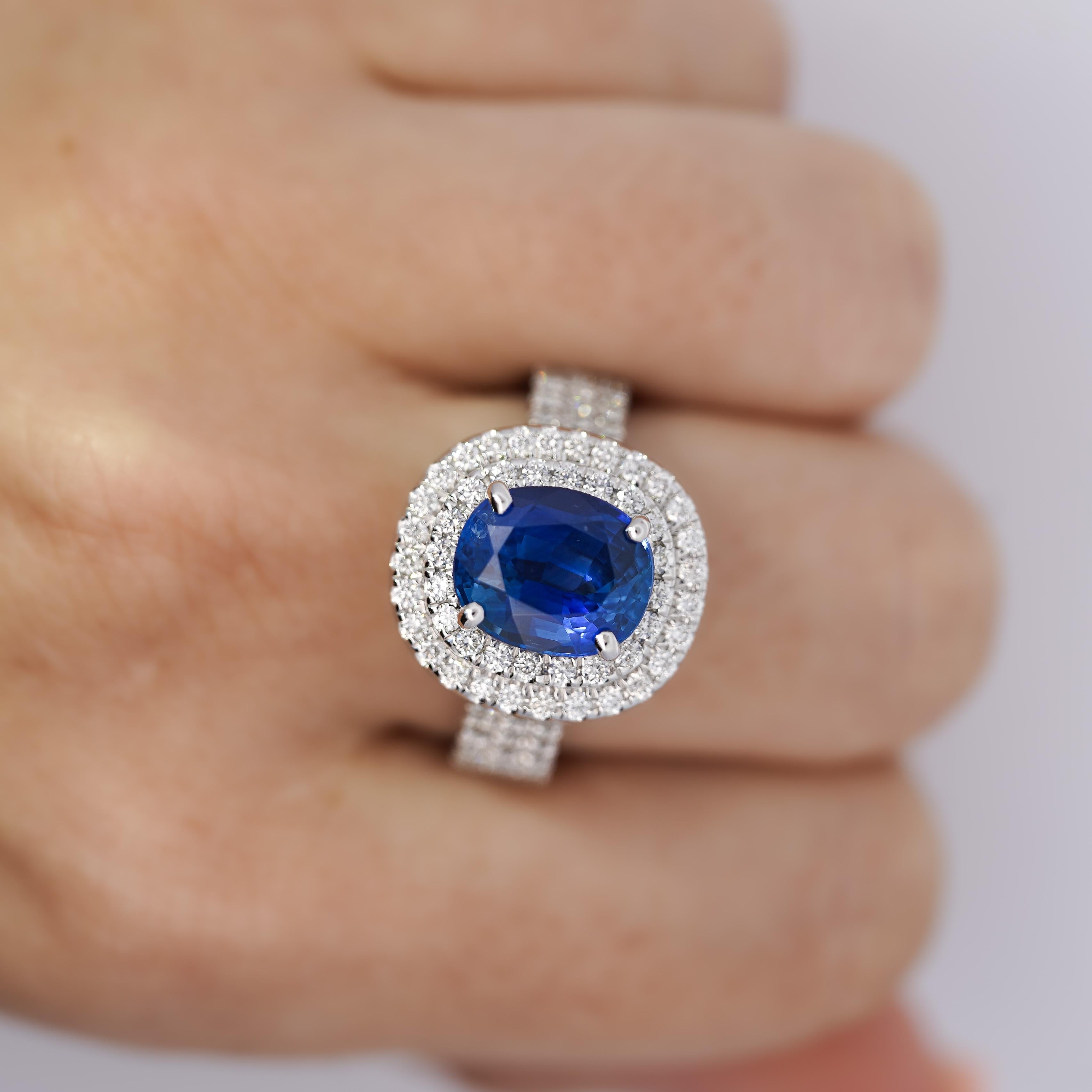 GRS Certified 4.73 Carat Blue Sapphire of Ceylon Origin with Pave Set Double Round Cut Diamond Halo.