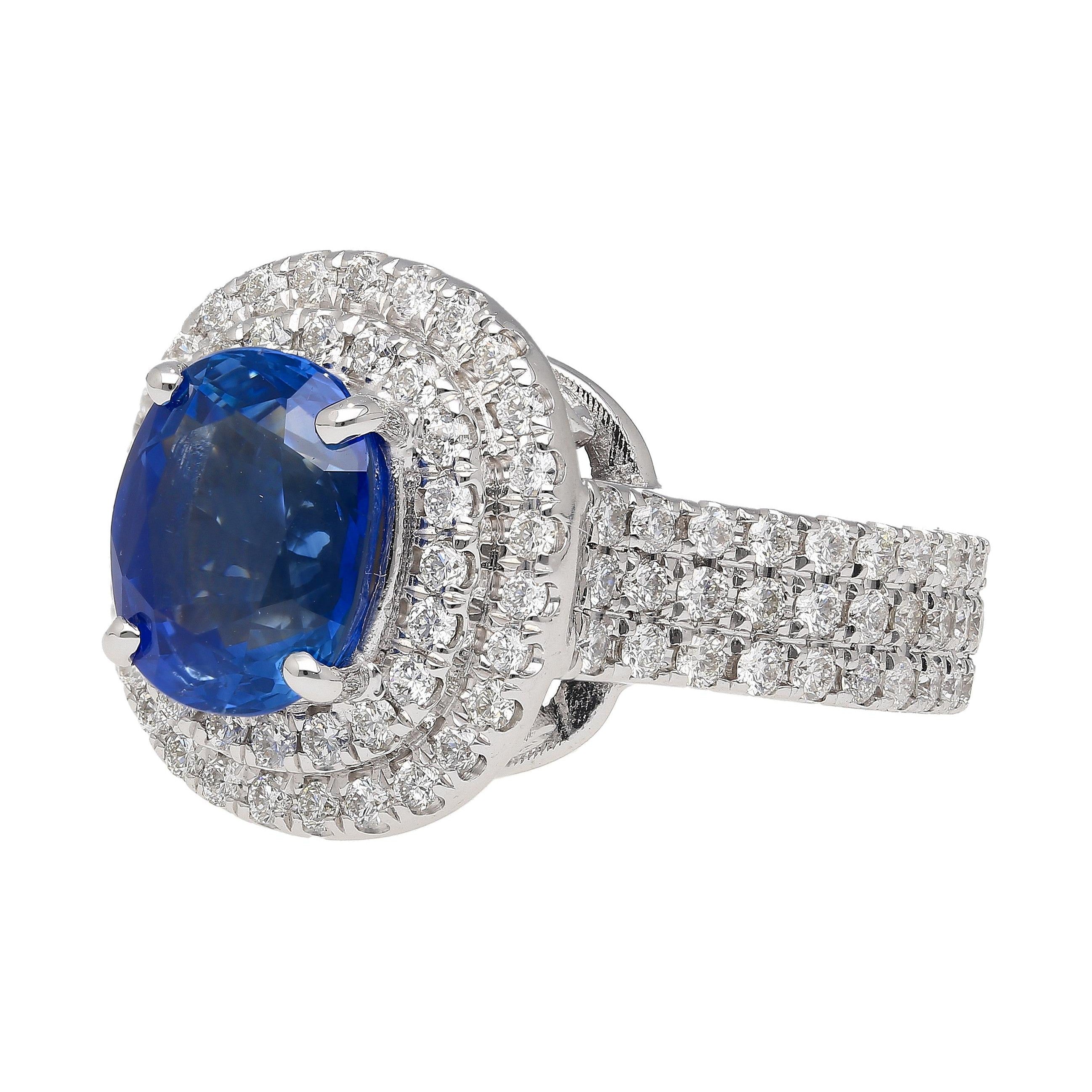 This breathtaking oval-cut Ceylon sapphire ring is a true statement of luxury and elegance. Weighing 4.73 carats and measuring 10.55 x 8.79 x 6.00mm, the vibrant blue sapphire is of Ceylon origin, known for its exceptional quality and brilliance. Surrounding the sapphire is a sparkling halo of 110 round-cut diamonds, totaling 3.5 carats, with a clarity grade of VS1-VS2 and a color range of G-H. The intricate craftsmanship highlights the brilliance of the diamonds while emphasizing the stunning sapphire center stone.