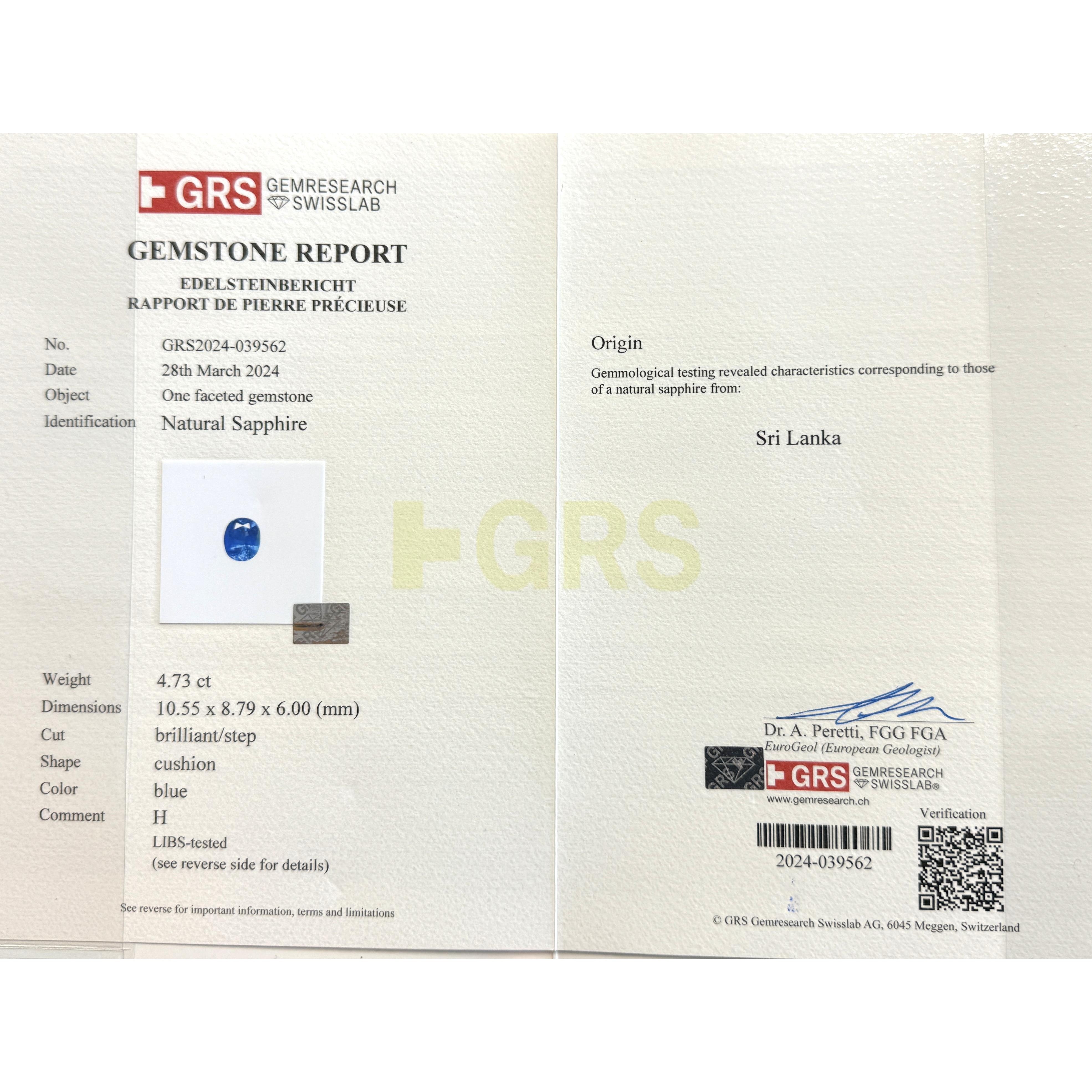 Sapphire Weight: 4.73 carats (10.55 x 8.79 x 6.00mm)