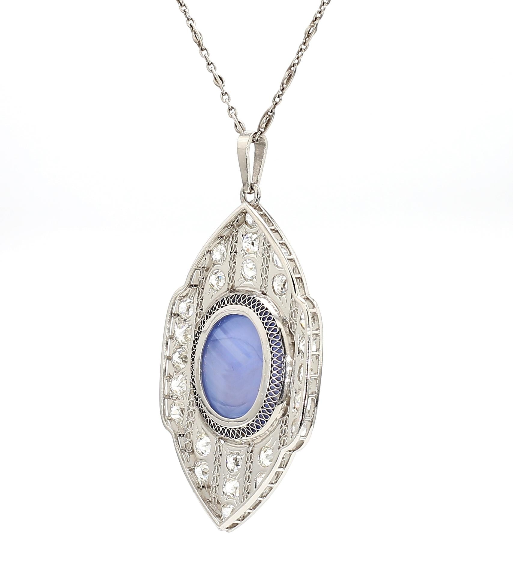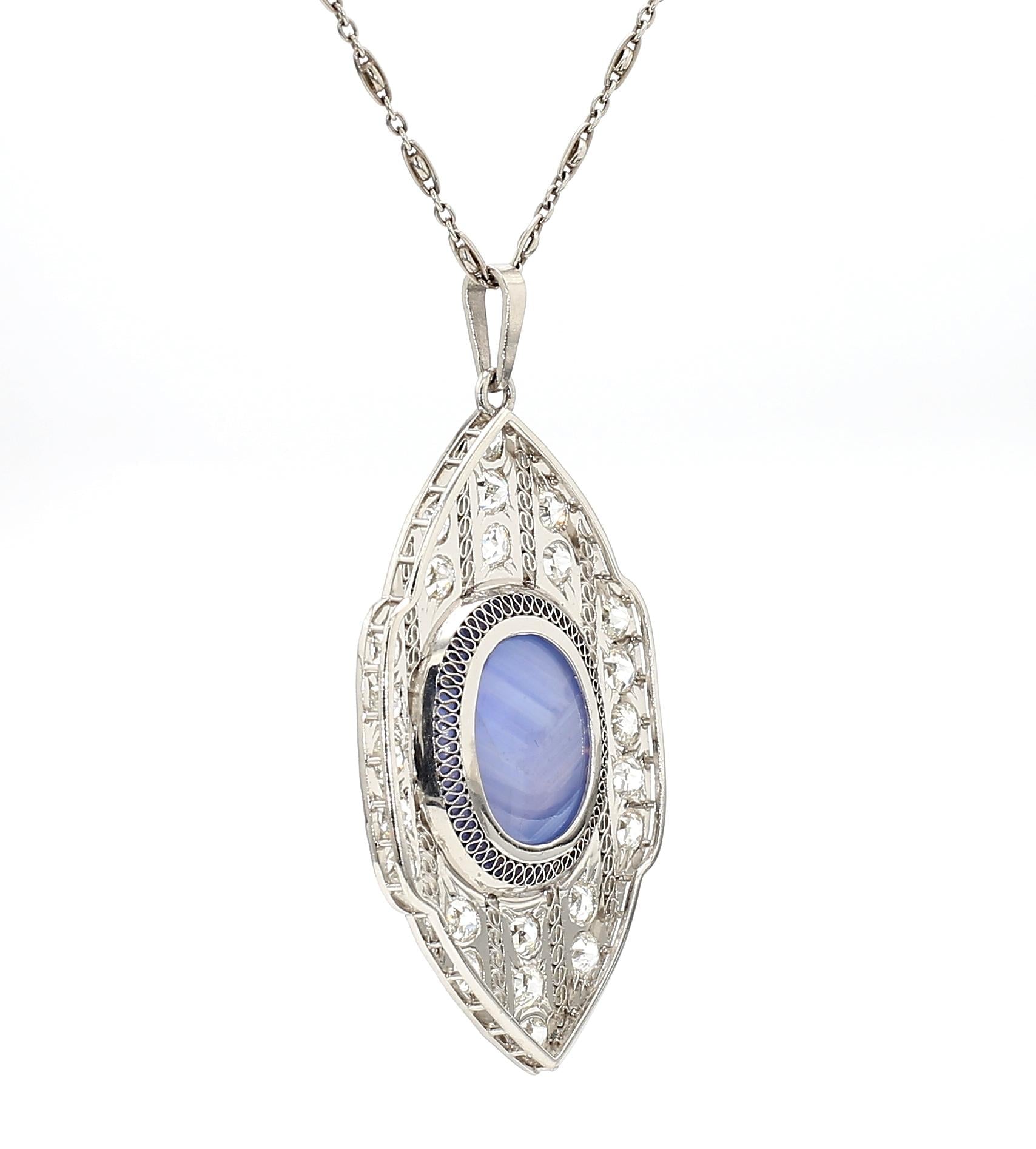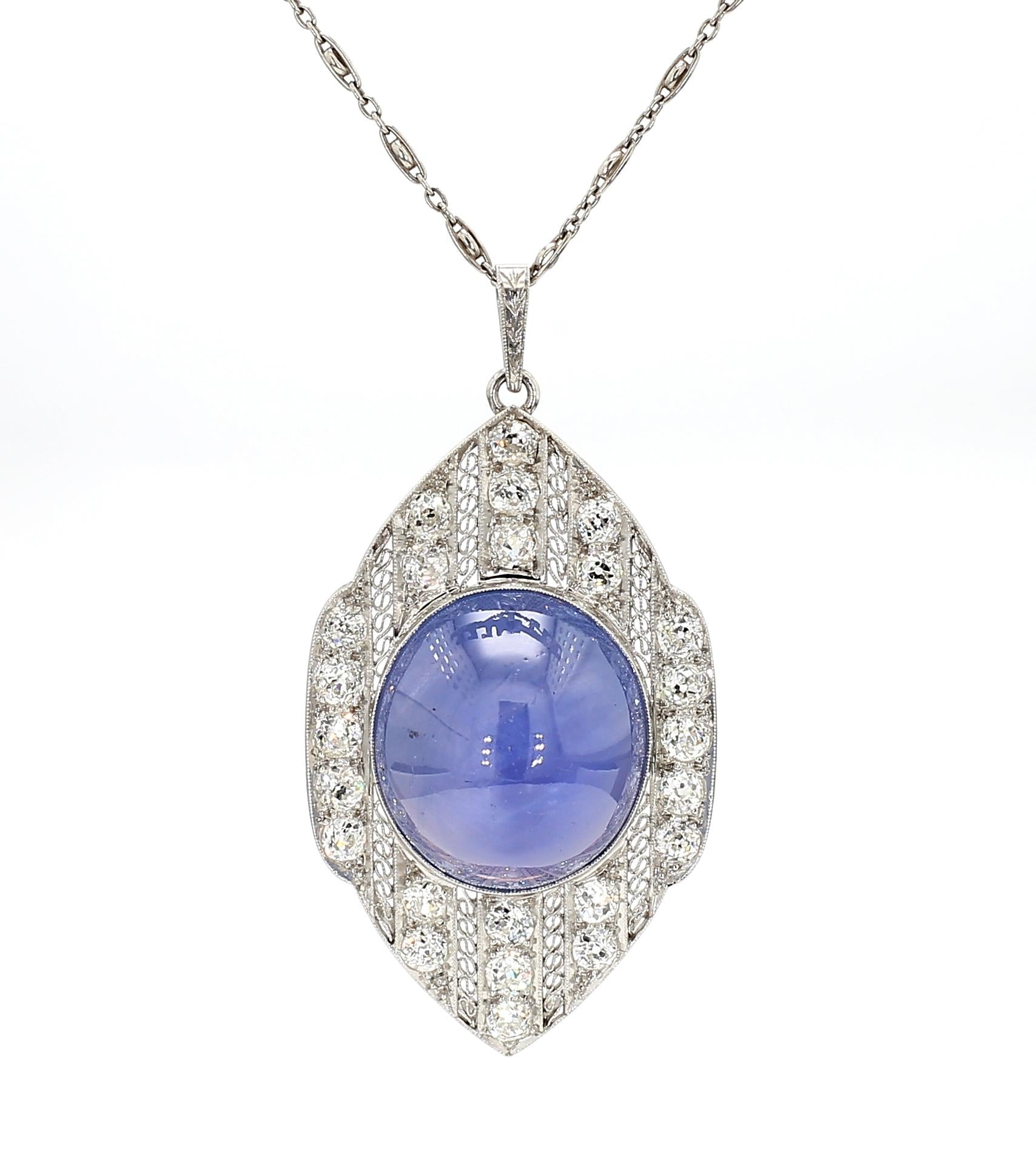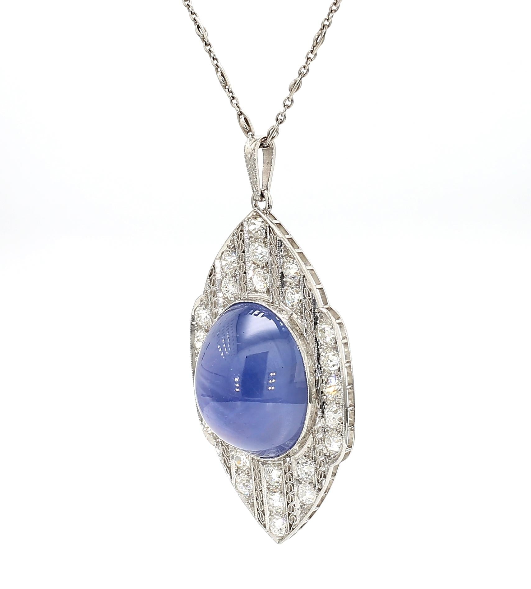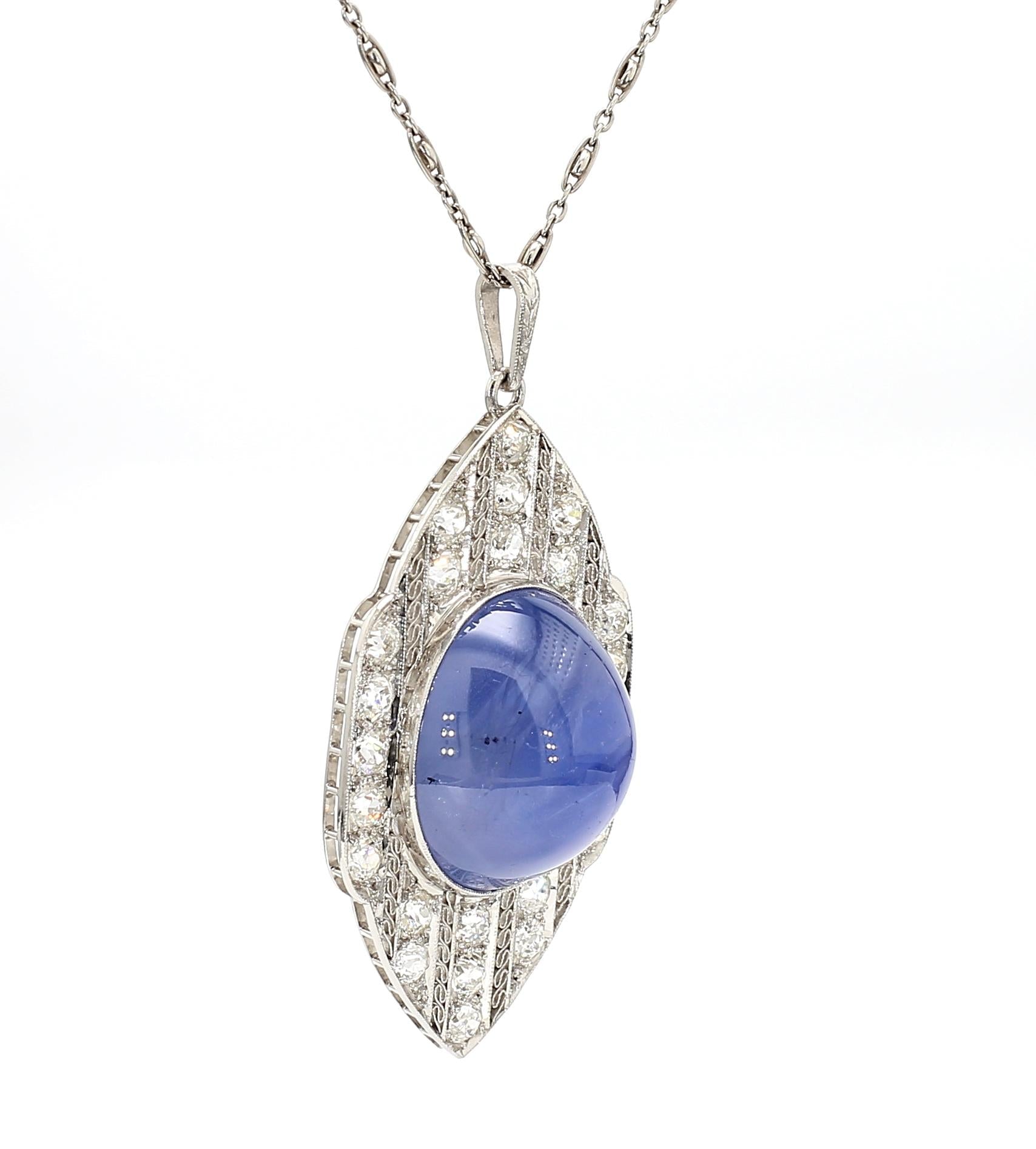 AGL certified approximately 45 carat unheated Ceylon blue star sapphire set in platinum Art Deco pendant necklace. Vintage 1930s cabochon cut star sapphire with old cut diamonds in platinum filigree setting with millegrain detail.