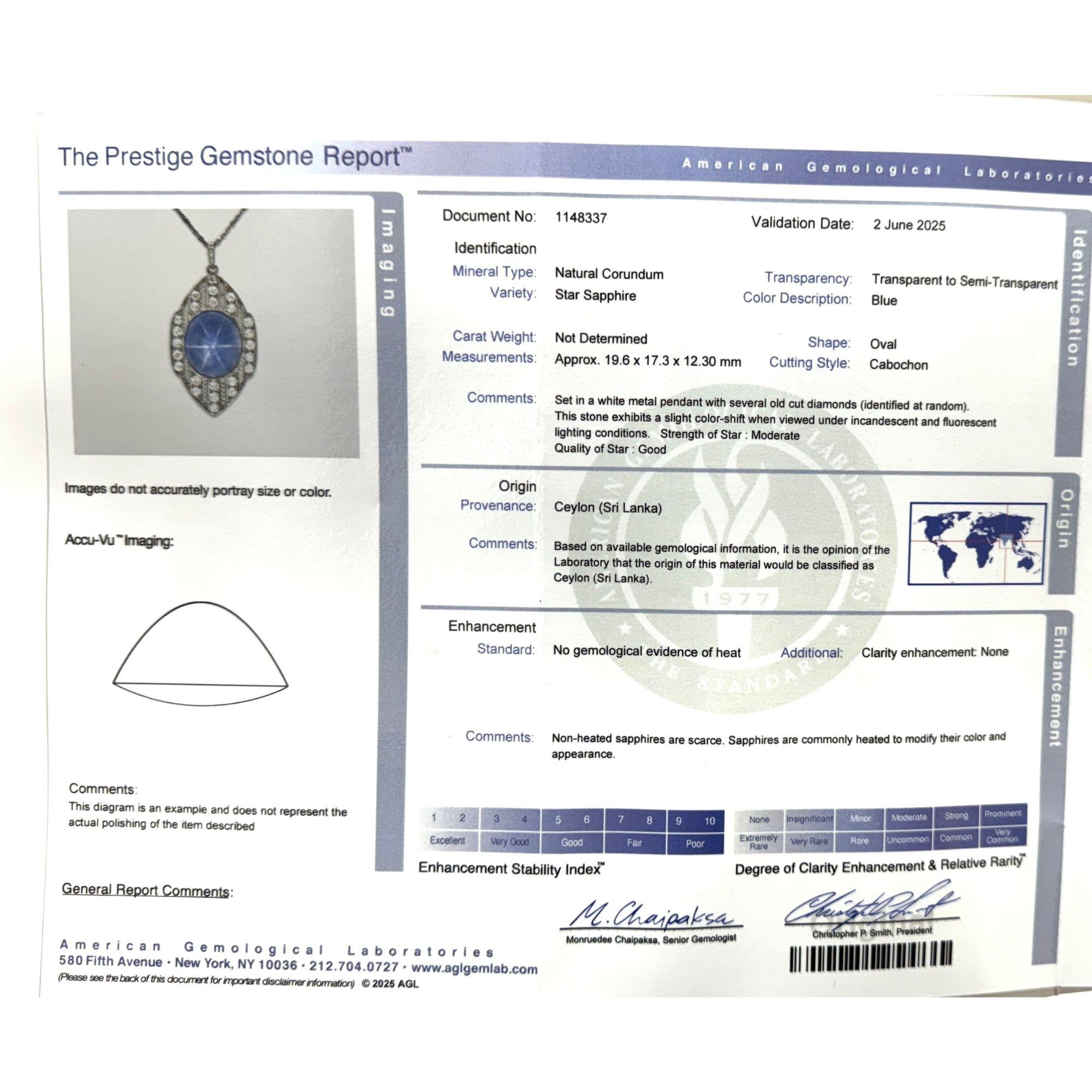 - Accompanied by AGL certificate no. 1148337 confirming natural star sapphire, Ceylon (Sri Lanka) origin, Ceylon blue color, unheated - no enhancement