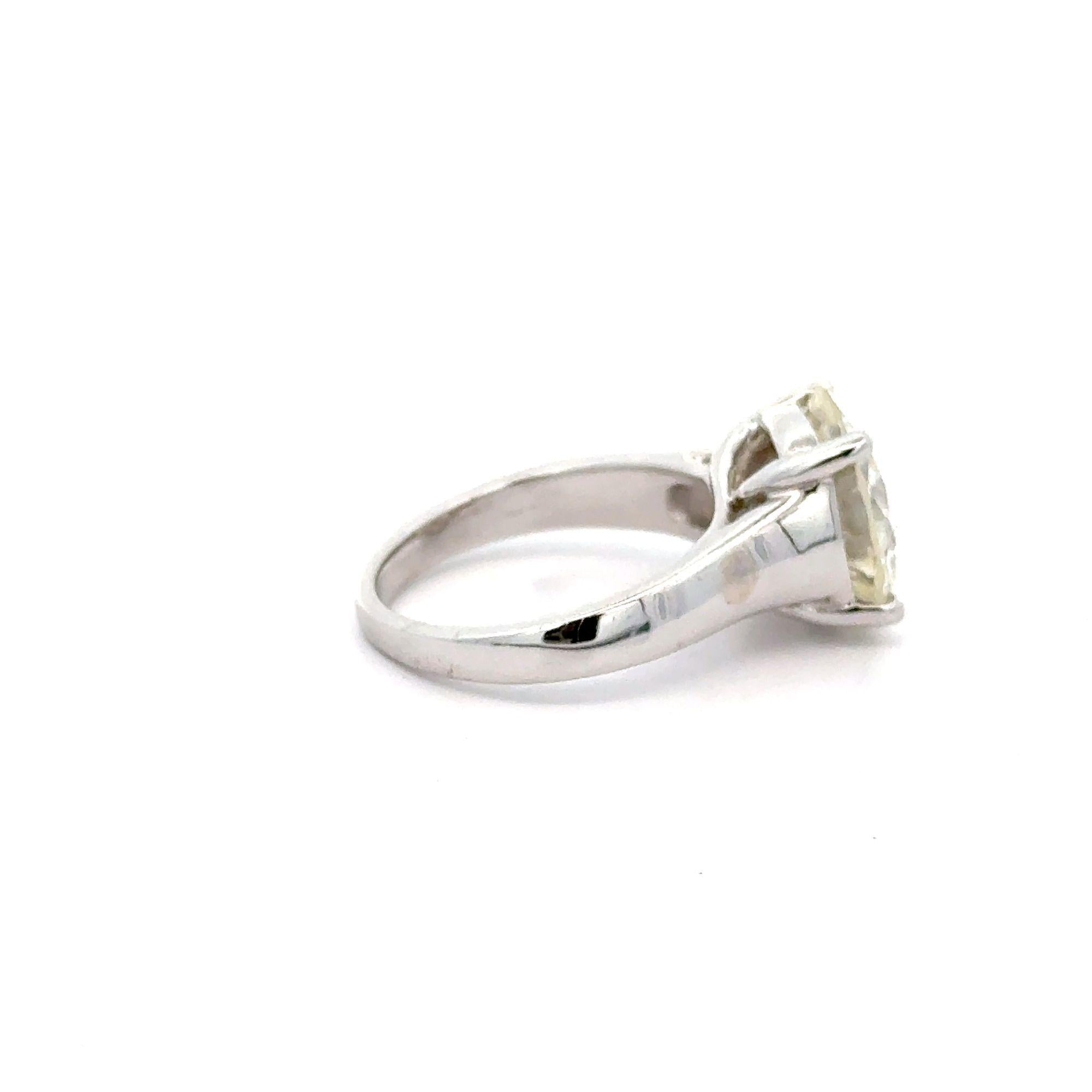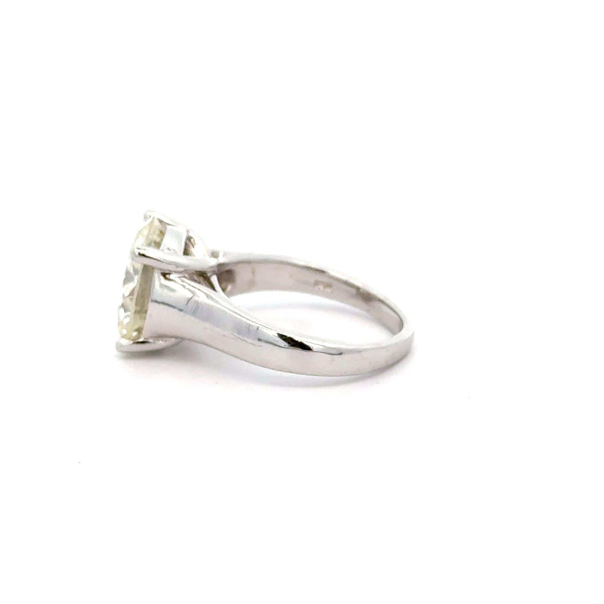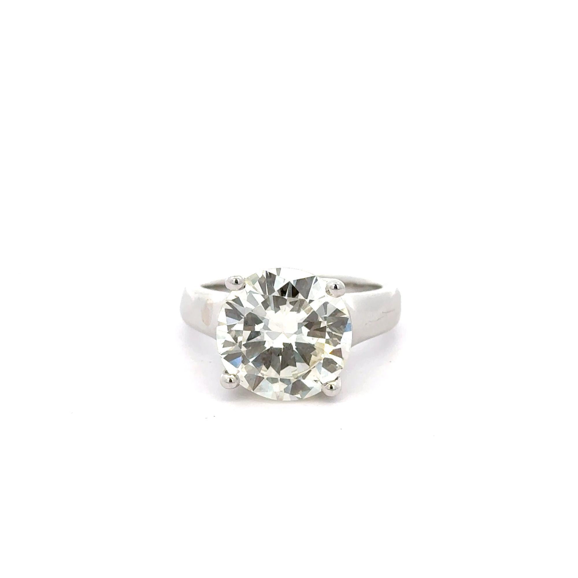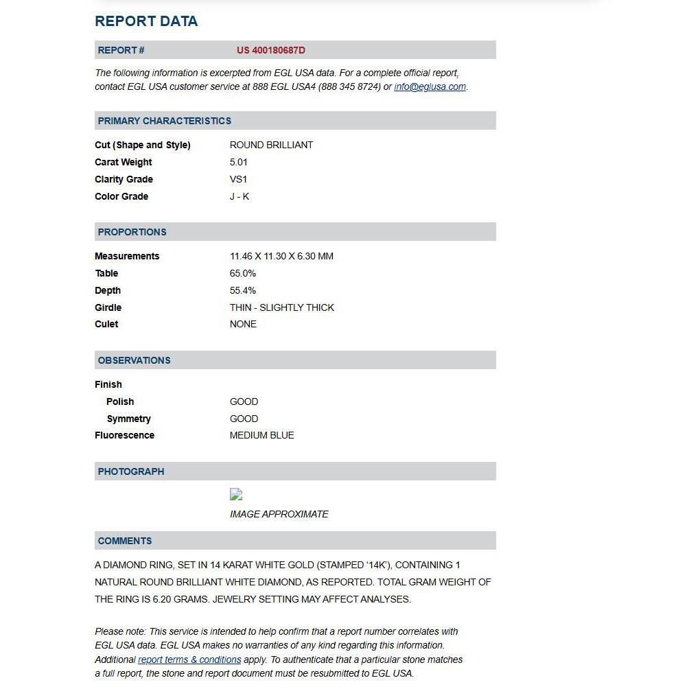 5.01-carat round brilliant cut diamond, set in a polished 14K white gold band. Designed with clean lines and a classic solitaire style, this ring exudes sophistication and charm, making it the perfect symbol of everlasting love. The diamond's J-K color and VS1 clarity ensure a luminous sparkle that captivates under any light and is noticeably a natural diamond with a substantial size. The expertly crafted prong setting enhances the diamond's brilliance while providing secure placement. Ideal for those seeking understated elegance with a bold statement.