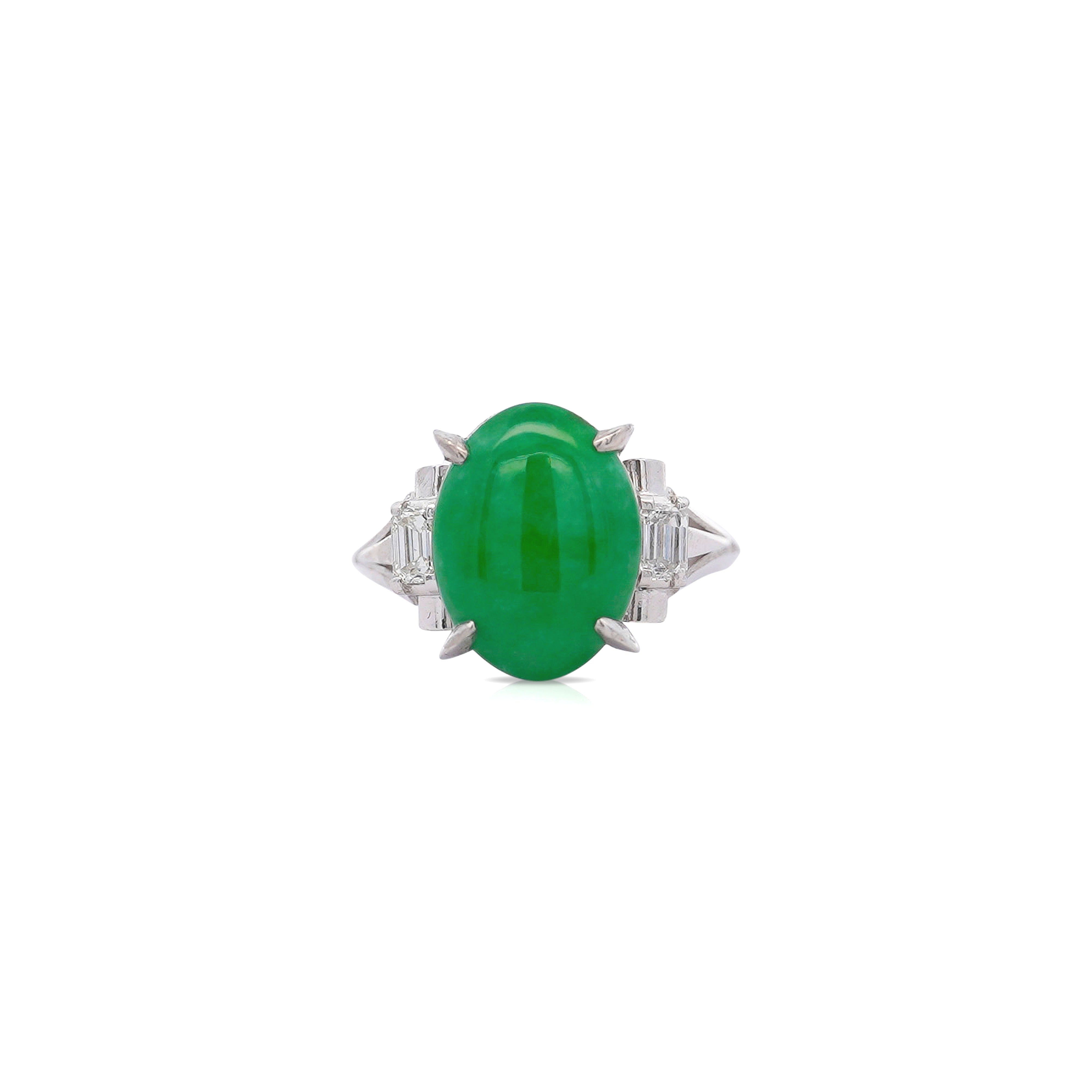 Untreated Grade A Green Jadeite Jade and Diamond Three Stone Ring in Platinum Ring.