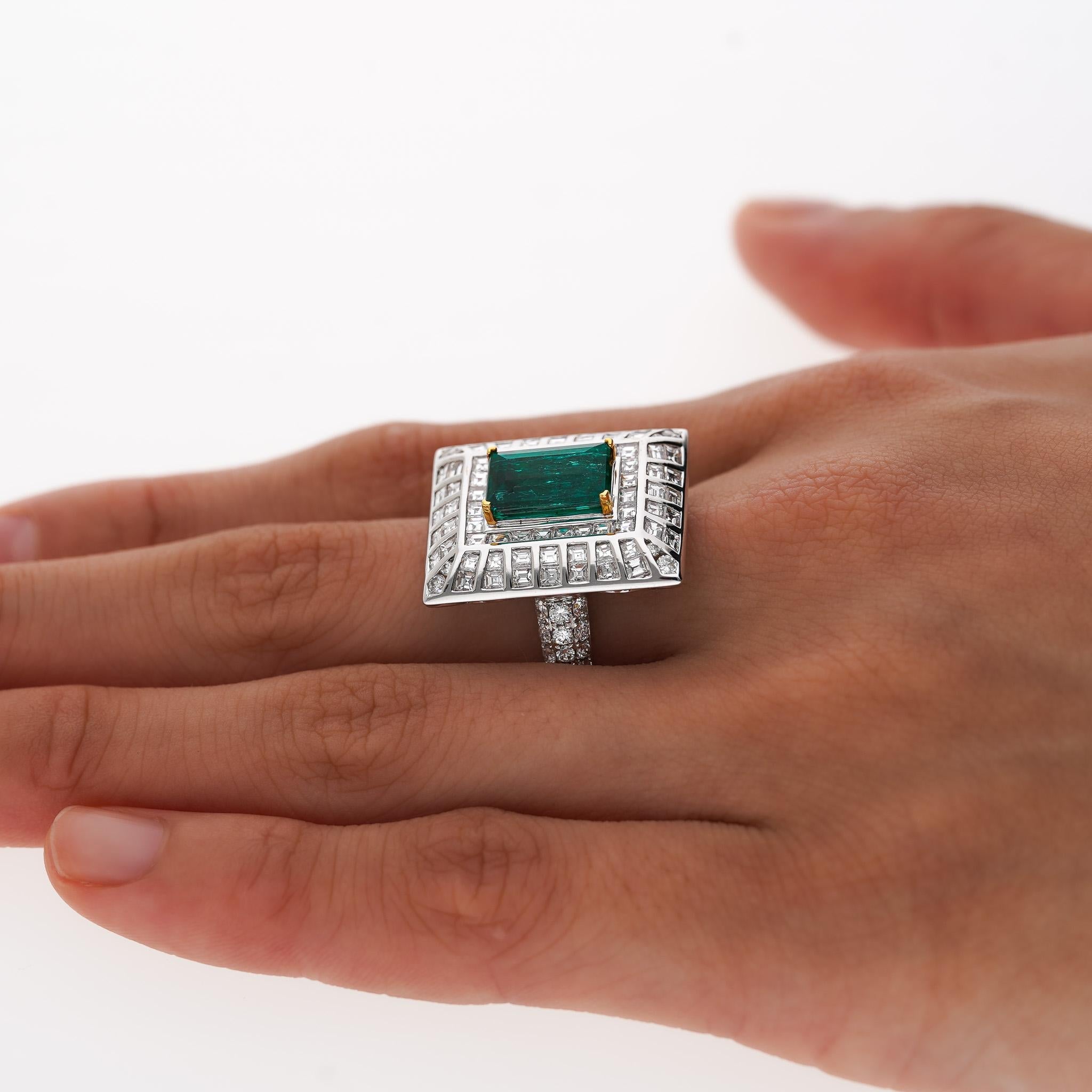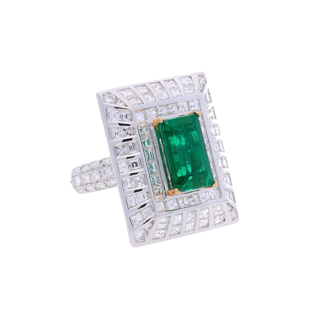 Art Deco Style 2.91 Carat Colombian Emerald and 2.85 Carat Baguette/Round cut Diamond Rectangular Shaped Wide Frame Ring in 18K... Read more