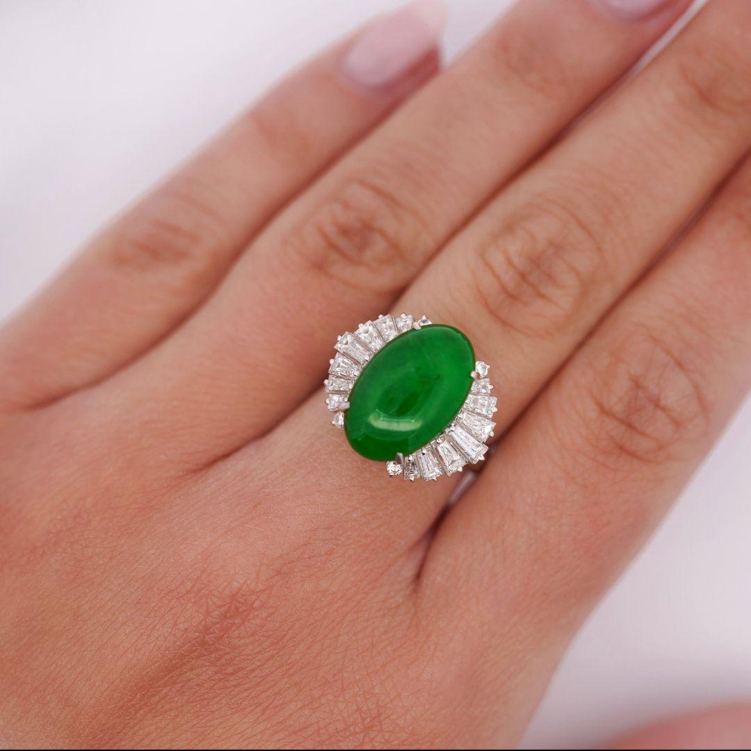 5.32 carats of true green untreated jadeite jade are displayed as the focal point of this beautiful piece. This ballerina style ring features a platinum band with delicate filigree, the lush green oval cut gemstone rests proudly at its head. 16 brilliantly shining baguette cut diamonds hug the center stone, 8 on each side, totaling 1.34 carats.
