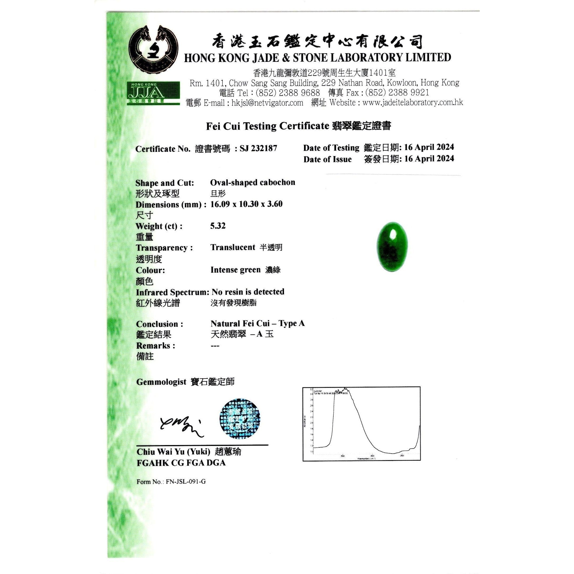 The center stone is HK Stone and Lab Certified. It's a Fei Cui Grade A untreated Jadeite Jade.
