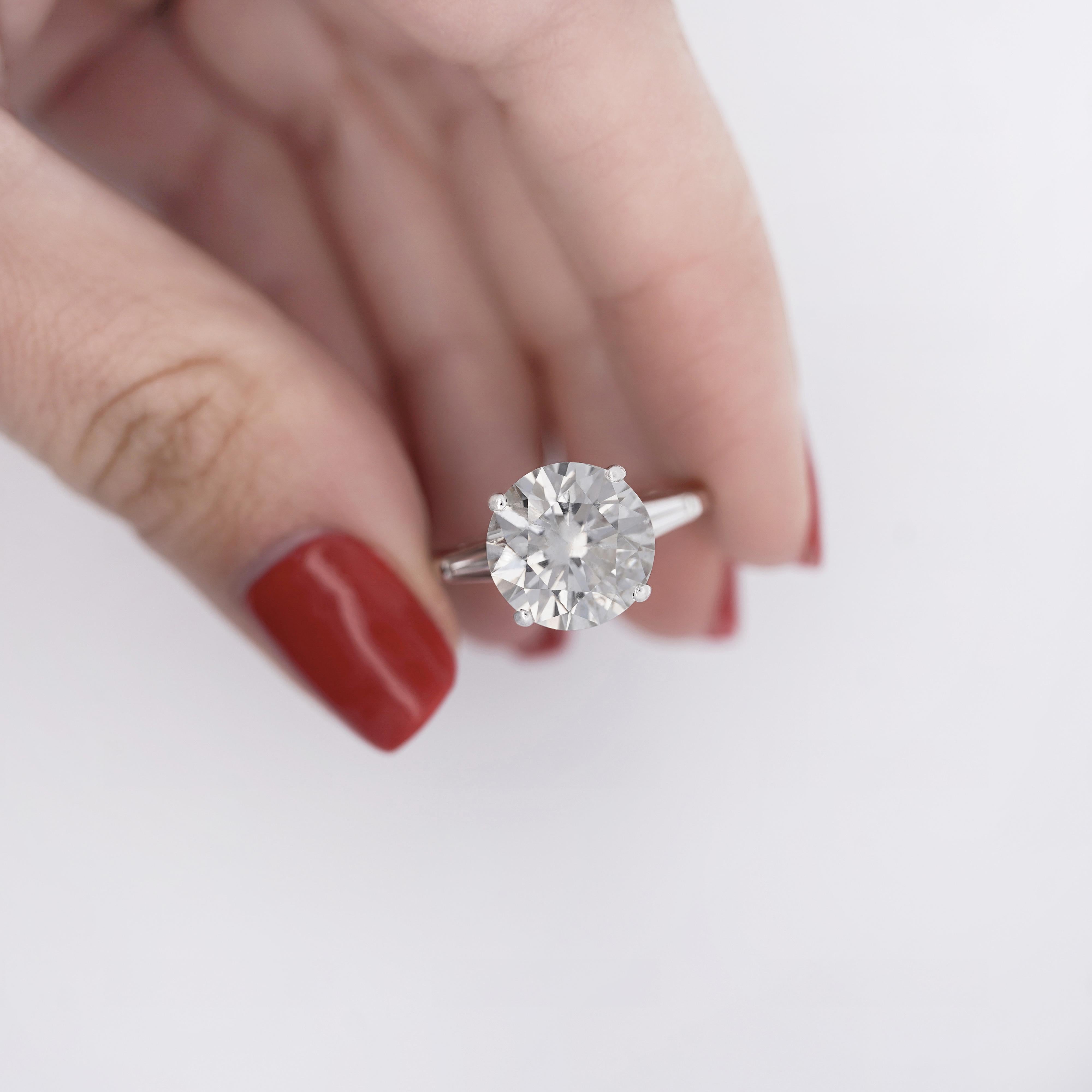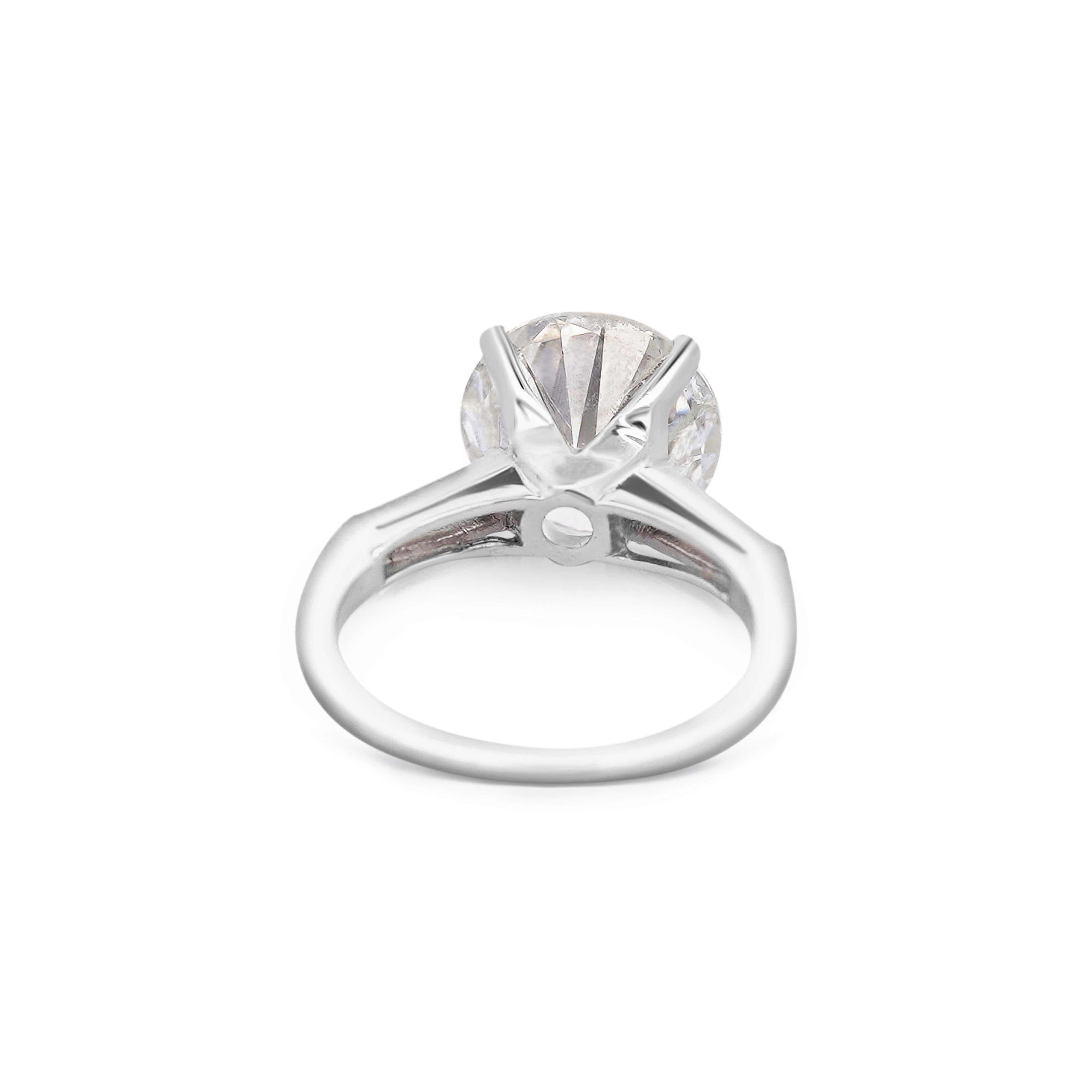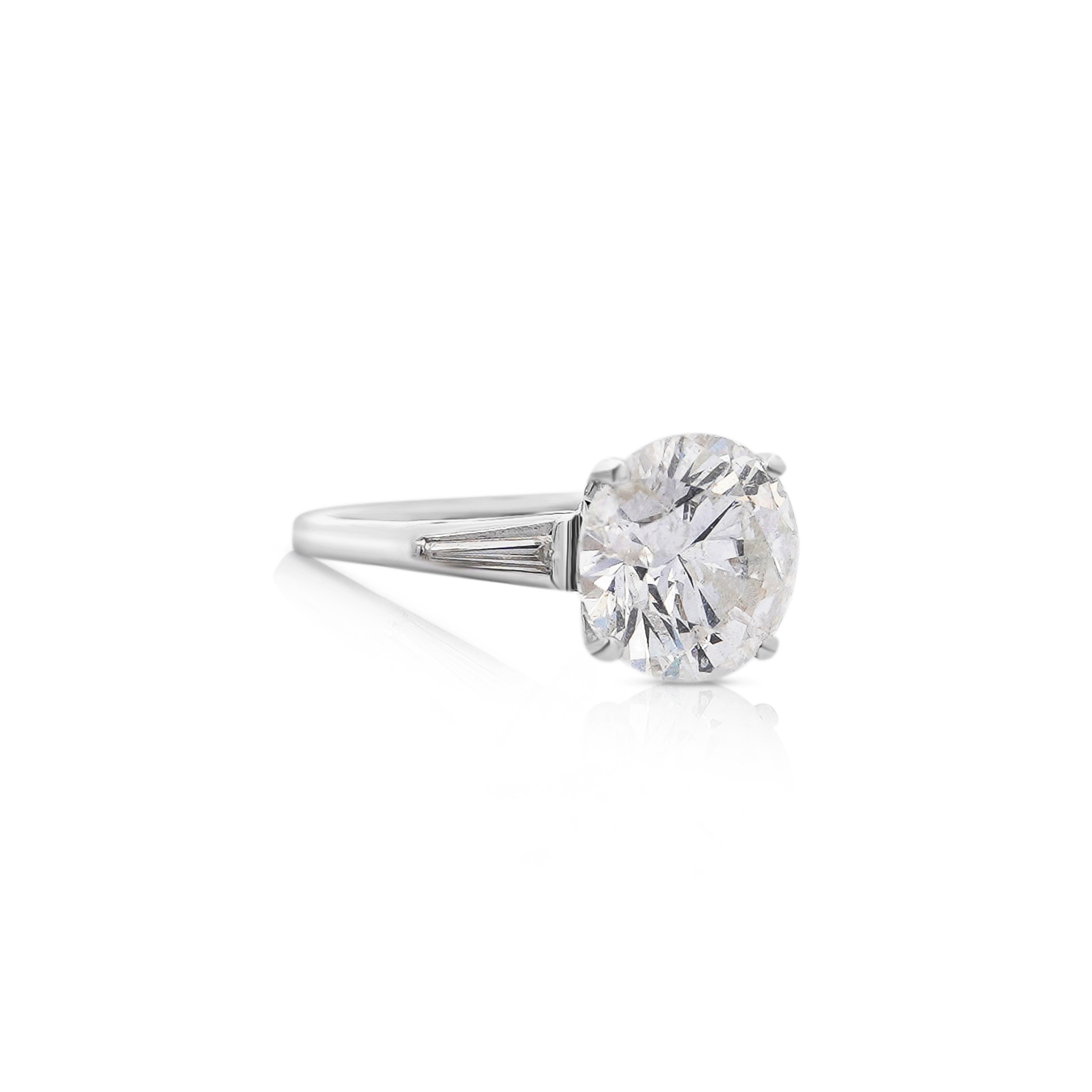 A diamond ring, set in platinum, containing 1 natural round brilliant white diamond, as reported. The ring also contains 2 tapered baguette side diamonds that are F - G in color, VS2 - SI1 in clarity, with a cumulative weight of 0.30 carats. Total diamond weight of the ring is 5.58 carats. Total gram weight of the ring is 6.30 grams.