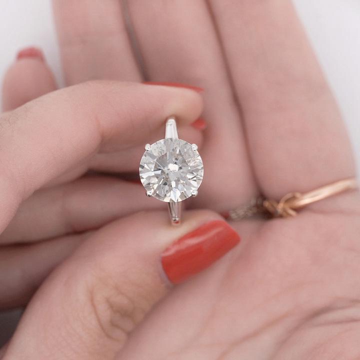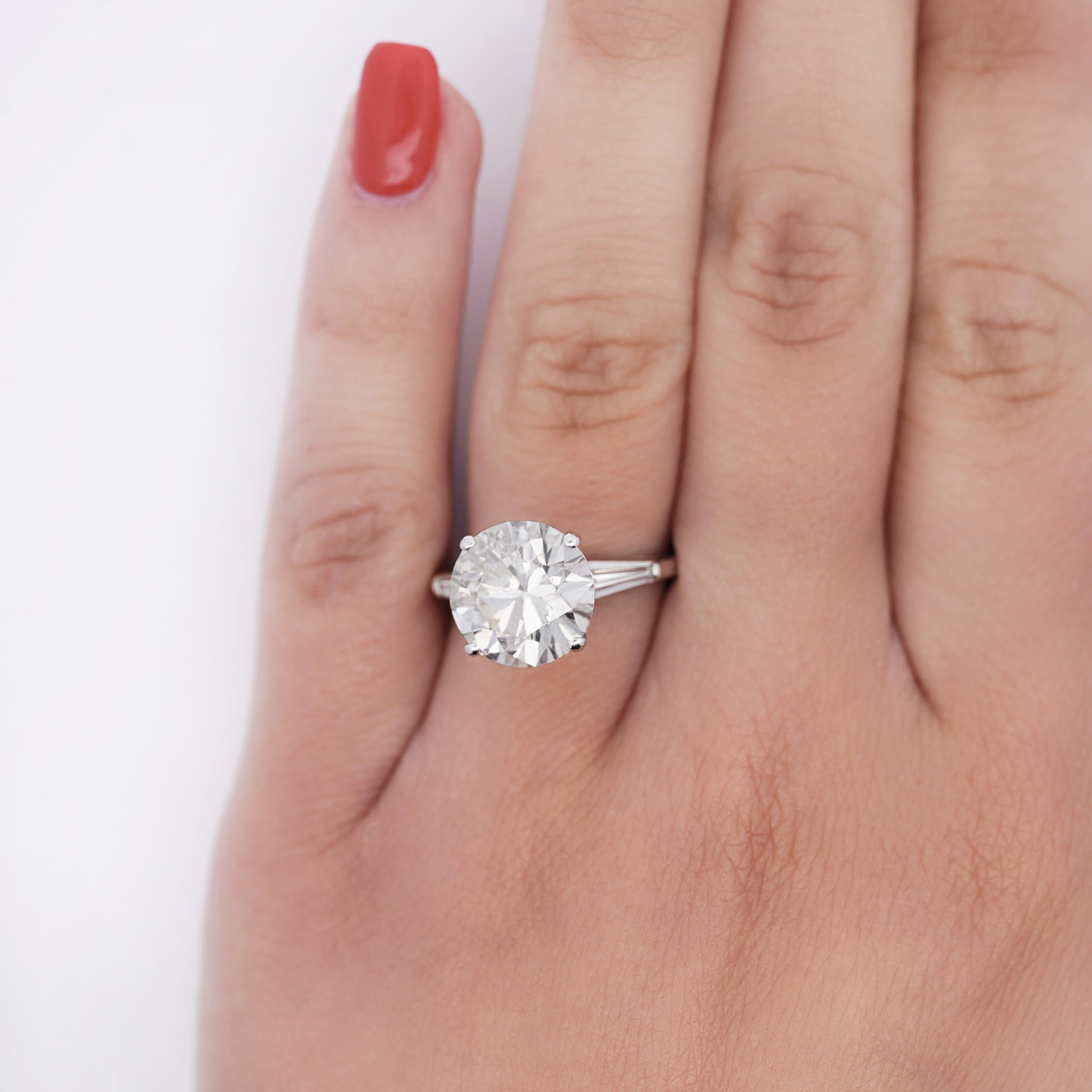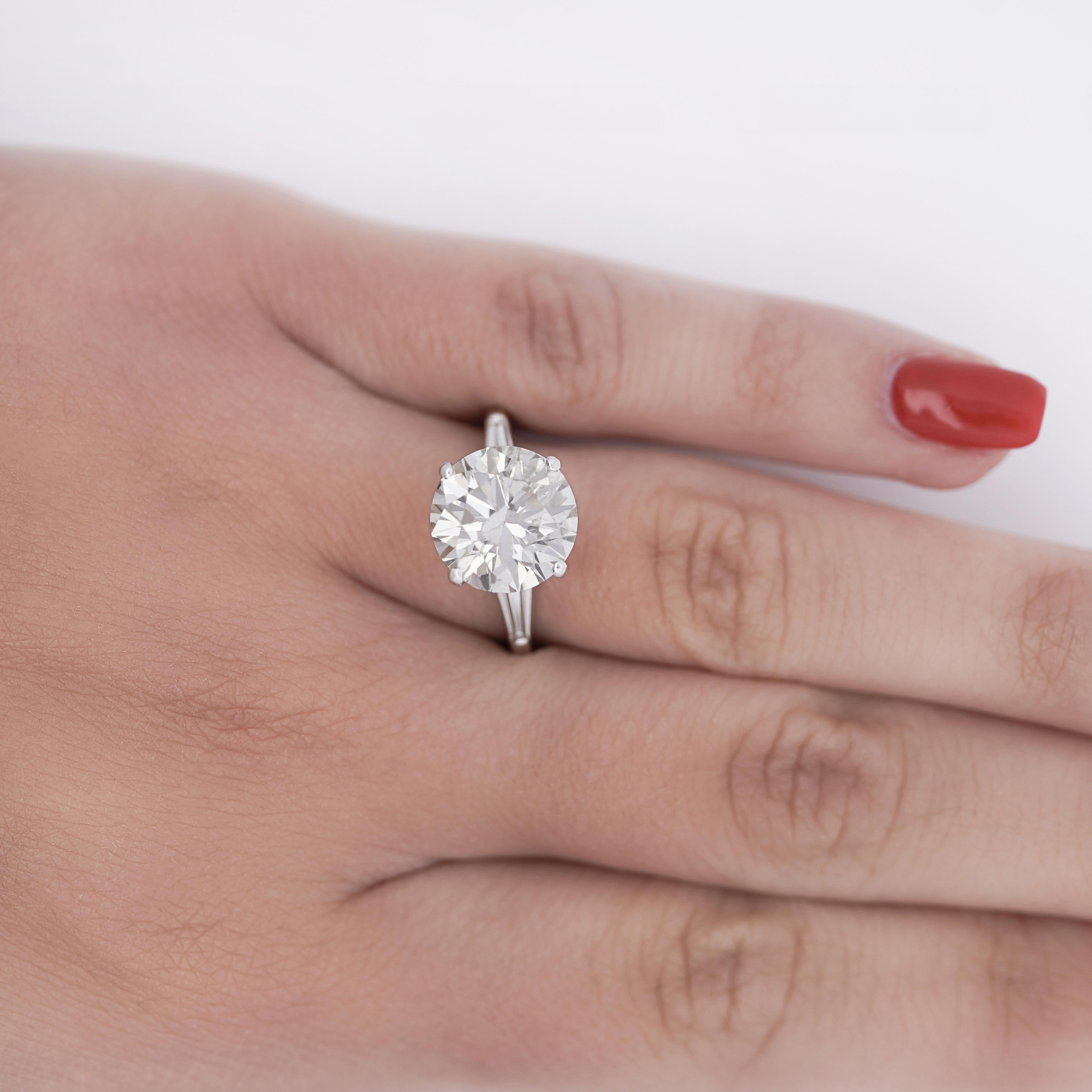 A diamond ring, set in platinum, containing 1 natural round brilliant white diamond, as reported. The ring also contains 2 tapered baguette side diamonds that are F - G in color, VS2 - SI1 in clarity, with a cumulative weight of 0.30 carats. Total diamond weight of the ring is 5.58 carats. Total gram weight of the ring is 6.30 grams.