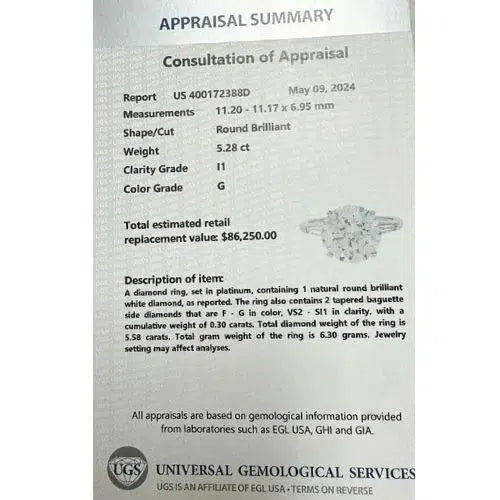 EGL Certified 5.58 Carat G Color, I1 Clarity, Round Cut Natural Diamond Three Stone Engagement Ring. Size 6.5, and set in platinum with 3 baguette cut diamond side stones.
