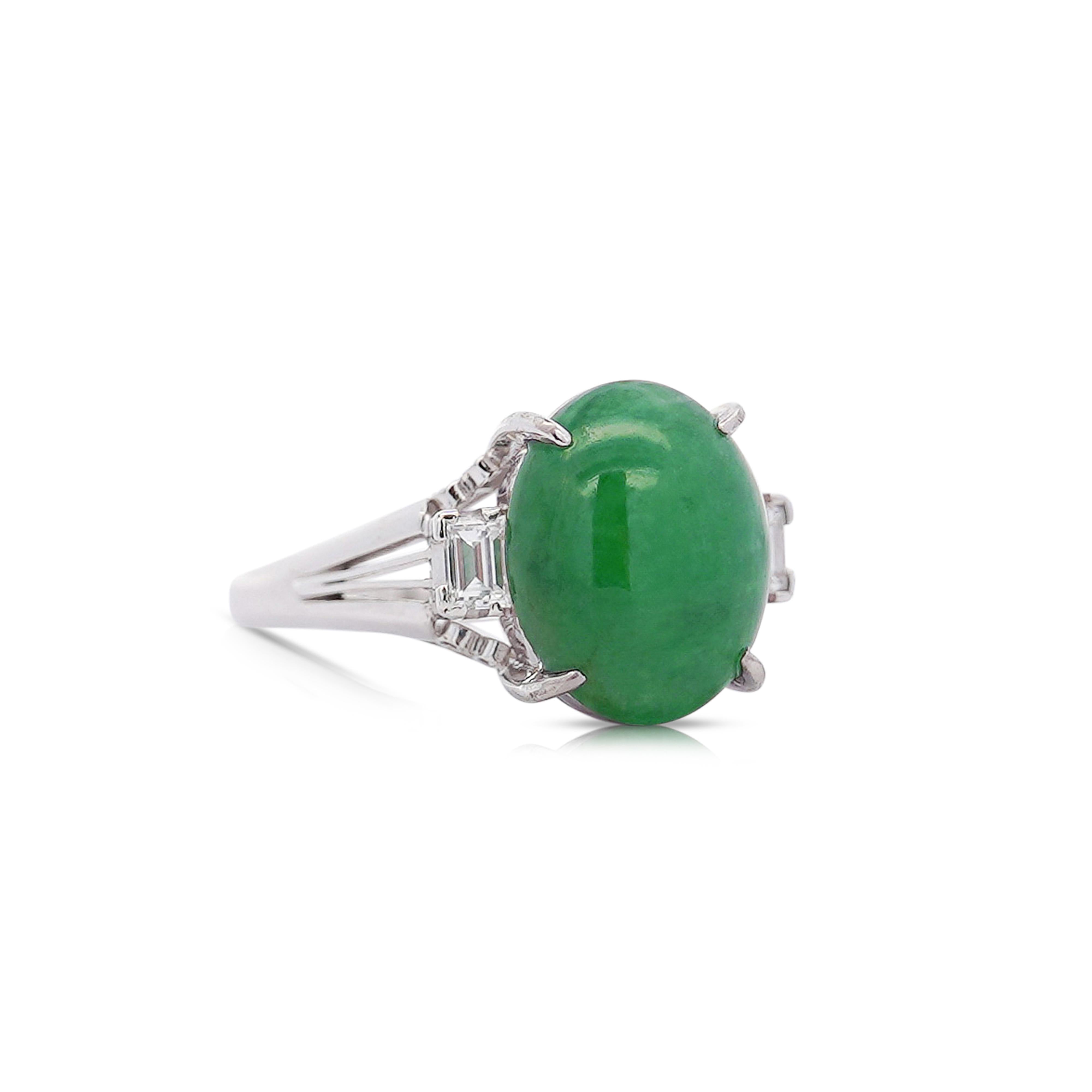 Untreated Grade A 5.87 Carat Cabochon Cut Green Jadeite Jade and Baguette Cut Diamond Three Stone Ring in Platinum Ring. The... Read more
