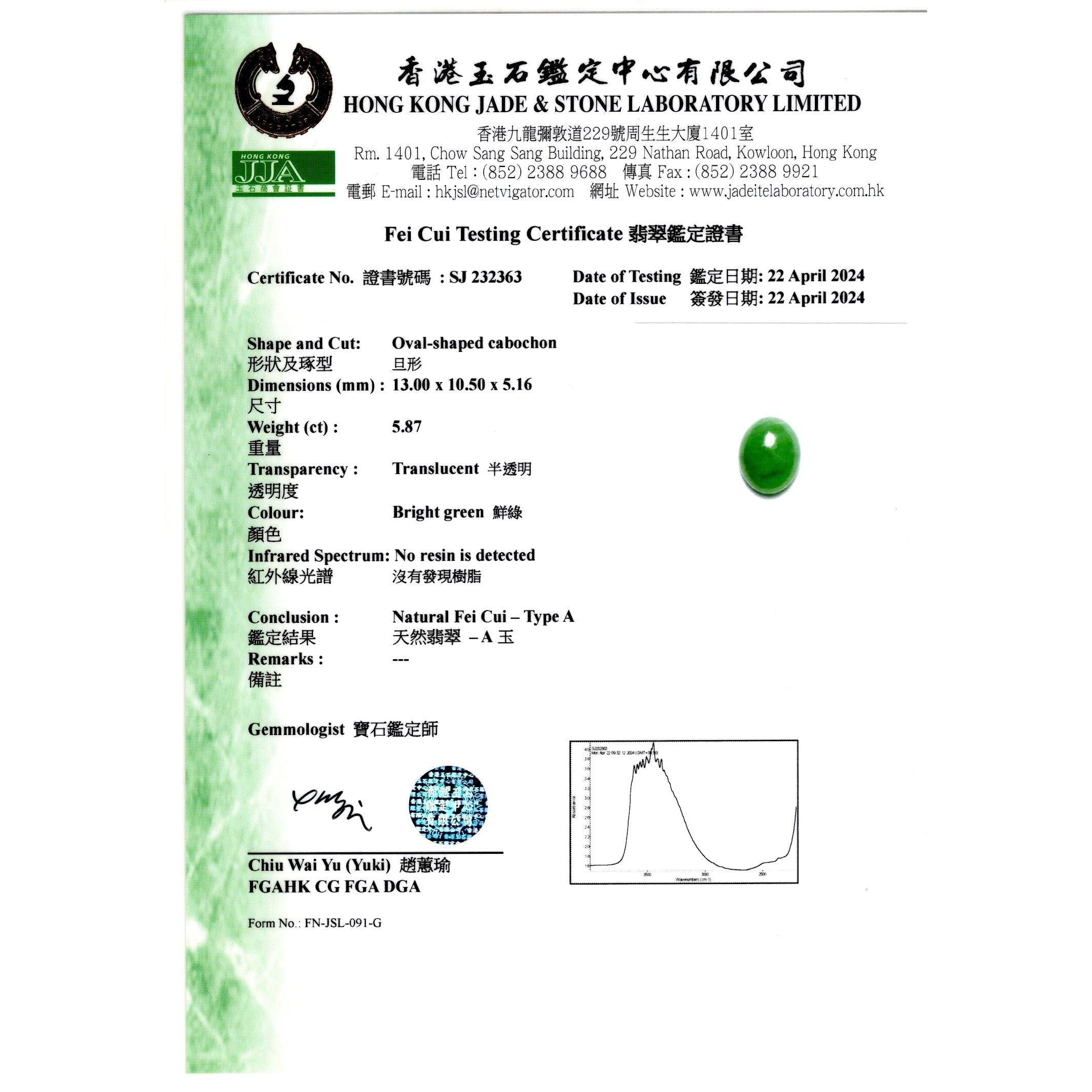 Untreated Grade A 5.87 Carat Cabochon Cut Green Jadeite Jade and Baguette Cut Diamond Three Stone Ring in Platinum Ring. The Jade is certified Hong Kong Jade & Stone Lab as a Fei Cui type A Jade.