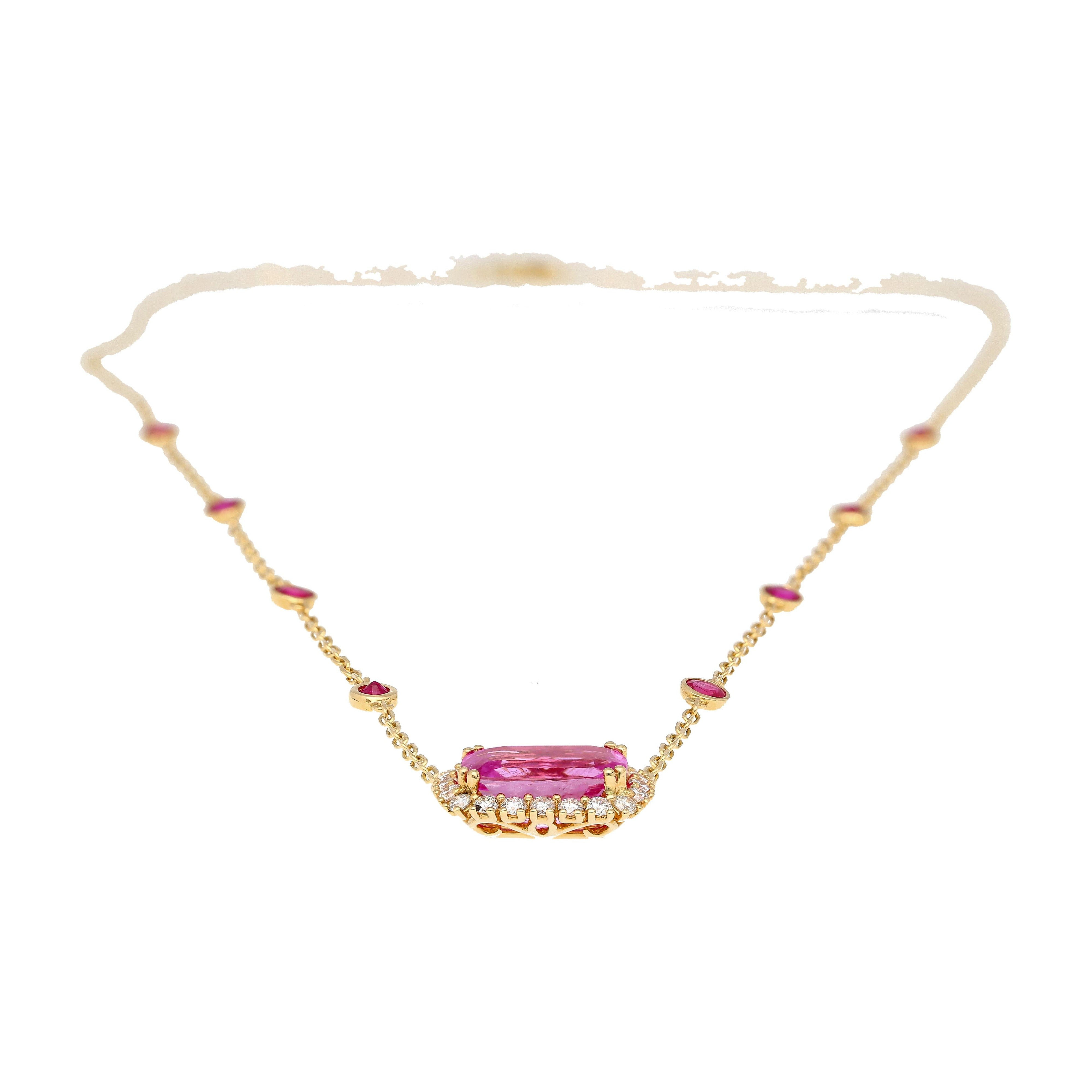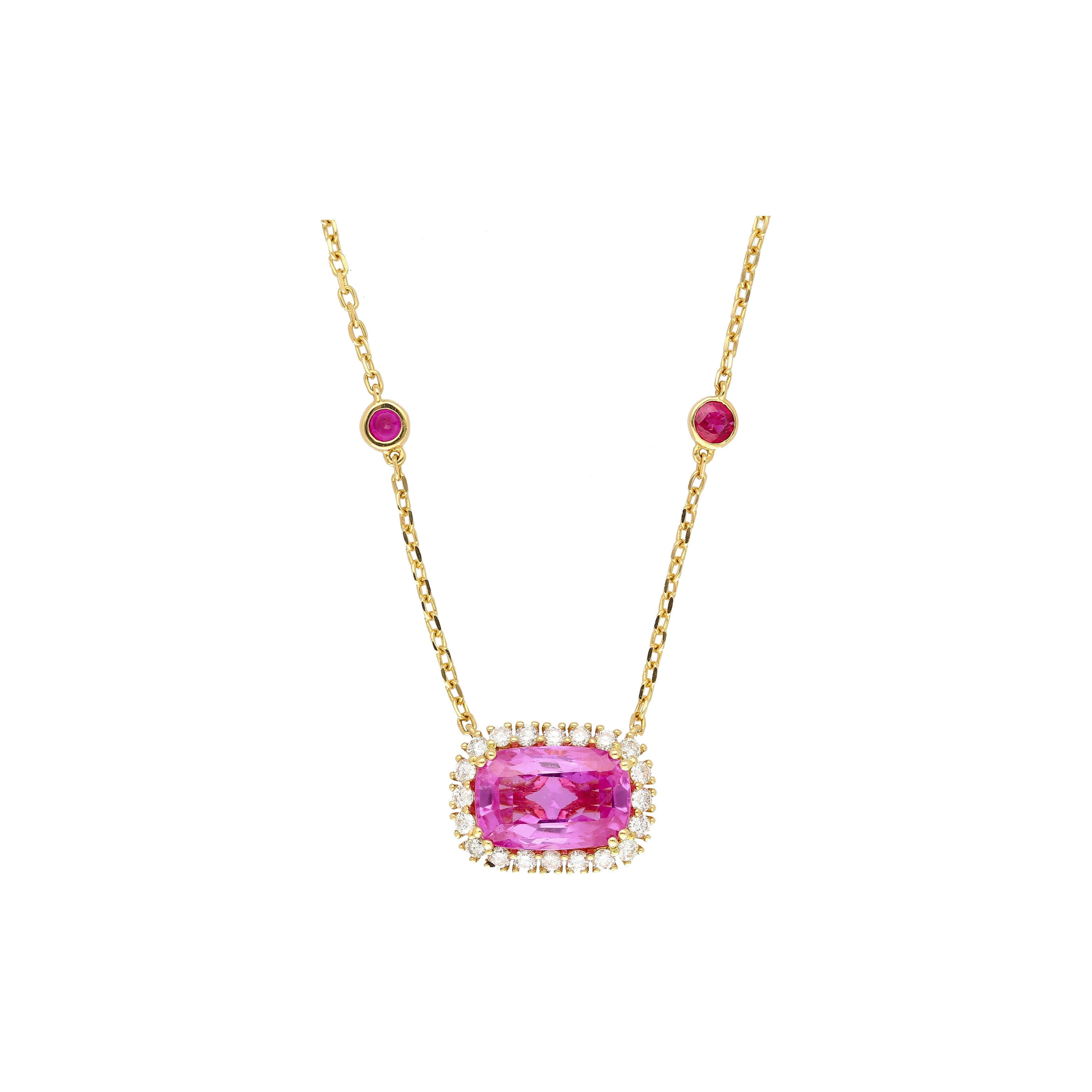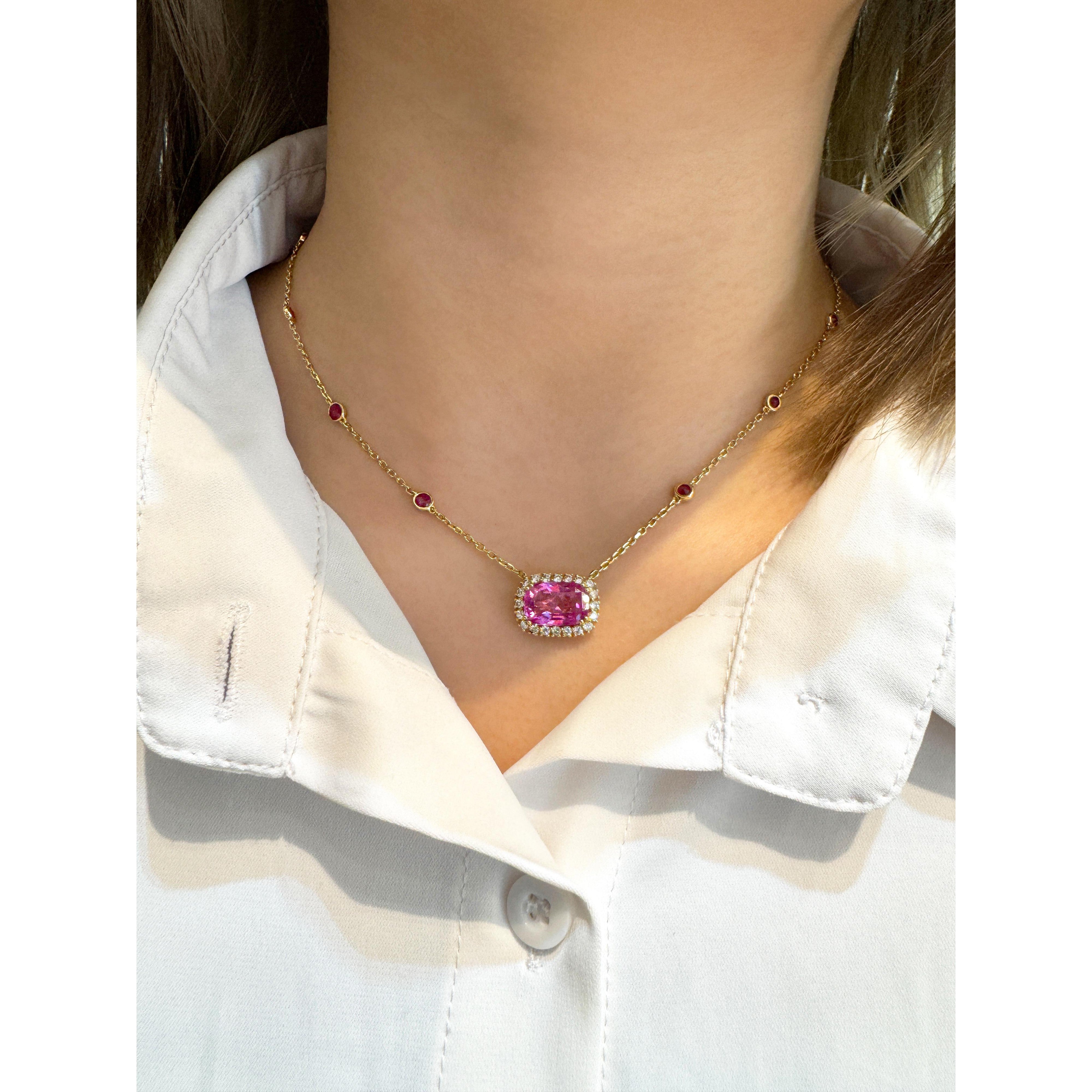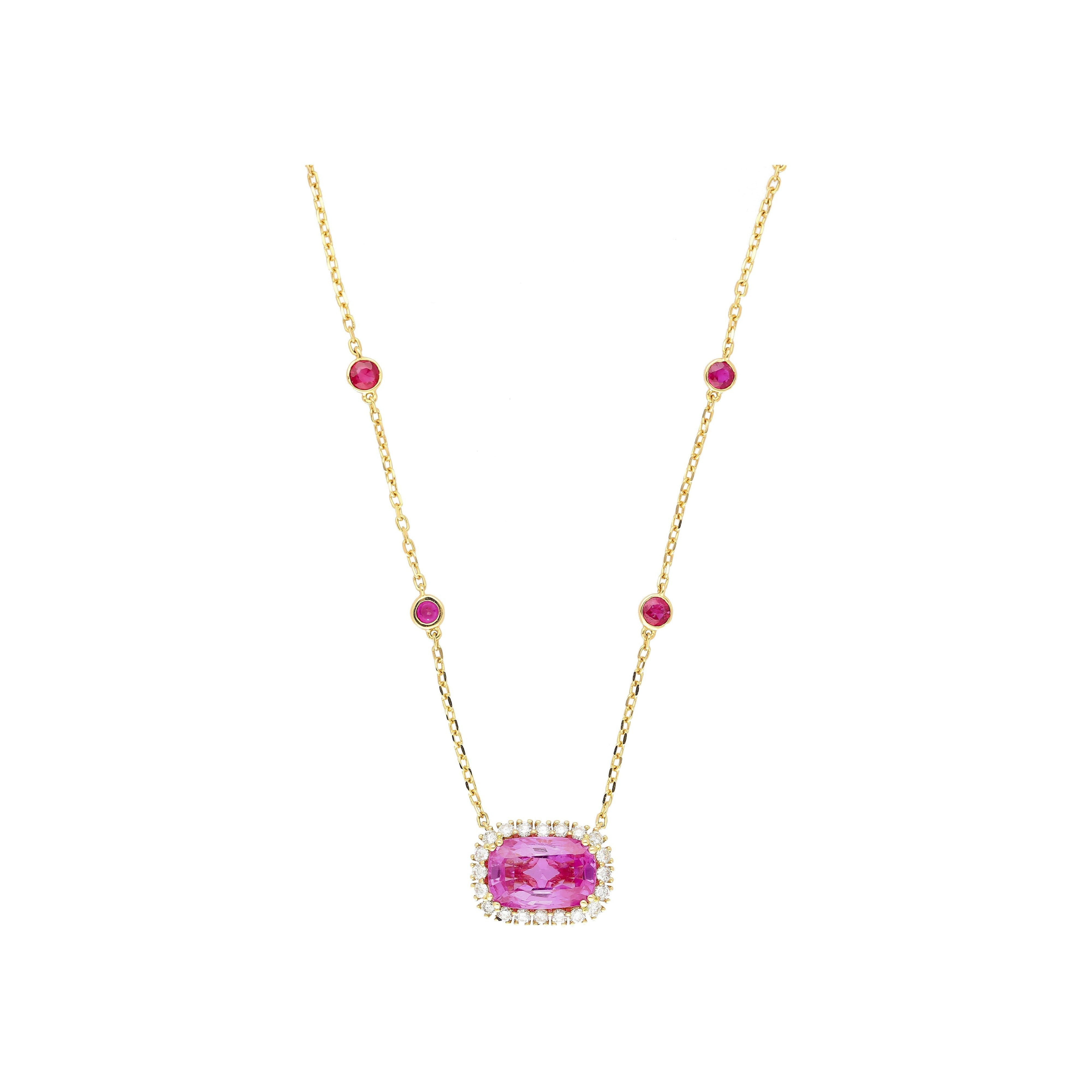 GRS certified 5.10 carat no heat pink sapphire set in an 18K yellow gold floating pendant necklace. The necklace uses a prong set cushion cut Ceylon sapphire with round cut diamond accents and bezel set ruby stations along the chain.